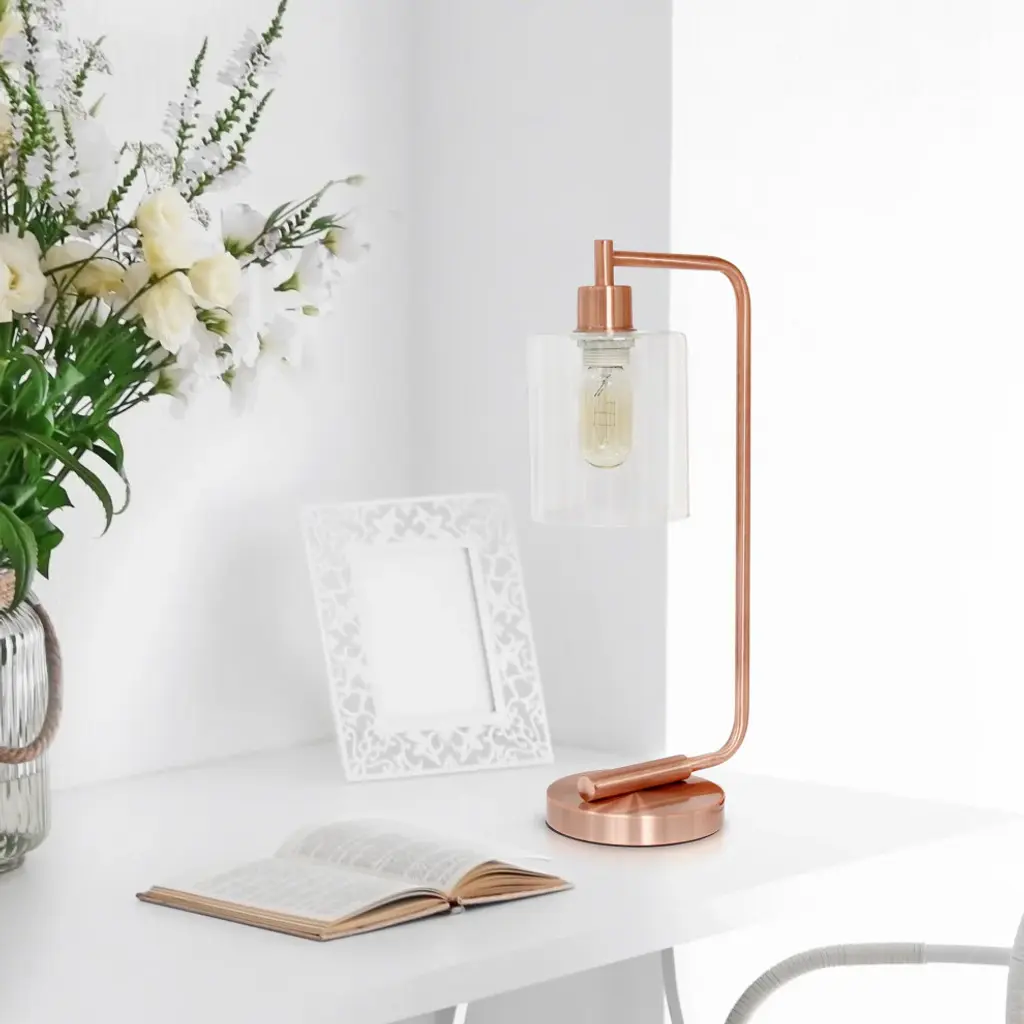Lalia Home Modern Iron Desk Lamp with Glass Shade, Rose GoldModern Iron Desk Lamp with Glass Shade, Rose Gold Simple yet modern, this desk lamp is sure to add a touch of style to any room in your home. This beautifully crafted iron desk lamp combines a simple base with a curved arm and a clear cylinder glass shade for a sleek and sophisticated combination. Perfect for your desk, foyer or bedside table for a modest, refined look in trendy lighting. Clear Glass ShadePolished Rose Gold finish1 x 40W standard medium base bulb (not included) required. For full vintage look, Type T45 Edison bulb is recommendedOn/off switch on cordSophisticated farmhouse lookBulb Type: INCANDESCENT (19/B10/T45)Shade Shape: CylinderNumber of Lights: 1Maximum Wattage: 40Finish/Color: Rose GoldBase Type: E26 Medium BaseBase Dimensions: Whole Base = 9.75" x 18.75"Round Base = 5.75" D x 1" HBulb Included: NoProduct Dimensions (W x D x H): 5.75 x 9 x 19
