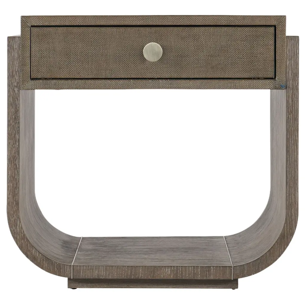 Architectural and timeless with a luxe mixture of materials, the striking Modern Mood Rectangle End Table is crafted of Quartered Oak Veneers with a raffia-wrapped drawer front and top. Featuring rounded sides, the table is finished with wire-brush detailing.