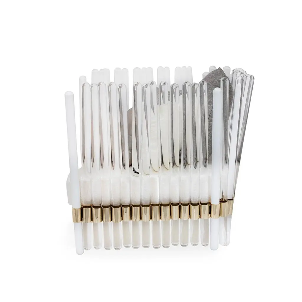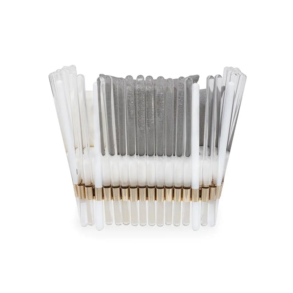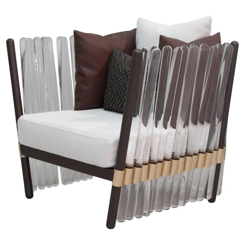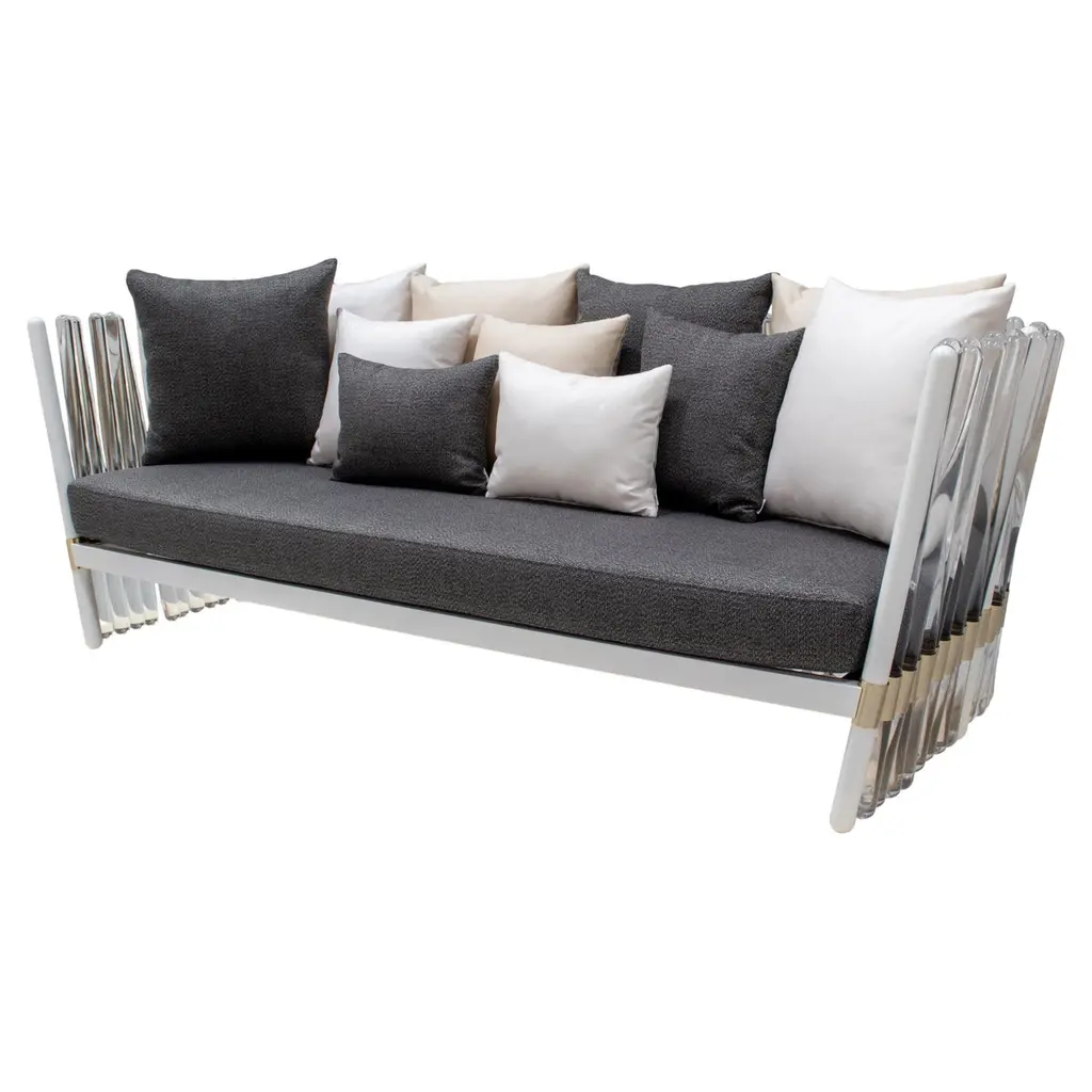 Houdini - Outdoor armchair in acrylic and stainless steelWhere the magic of sunsets and dawns come alive in bold, innovative forms. The Houdini Armchair is a masterpiece where modern elegance meets visionary design. As light and shadow play through the acrylic waves, the chair blends effortlessly with its surroundings, creating a harmonious fusion of timeless design and outdoor allure. Luxurious outdoor armchair made with metallic structure in white matte stainless steel, Structure Details in gold plated stainless steel, and Rods in clear acrylic and upholstered in premium acrylic fabric.It is in the duality concept of sunsets and dawns that magic is conceived, and it is on the same ideology that the Houdini armchair was designed. Lights and shadows scattered by acrylic waves blend into the outdoor environment around the pieces, providing sophistication in any outdoor space.You can combine the Houdini armchair with matching pieces from the collection, such as: Houdini daybed, Houdini center and side table and Houdini sofa. All collection is fully customizable, making them perfect for any project. The pillows and protection cover are included in the price.
