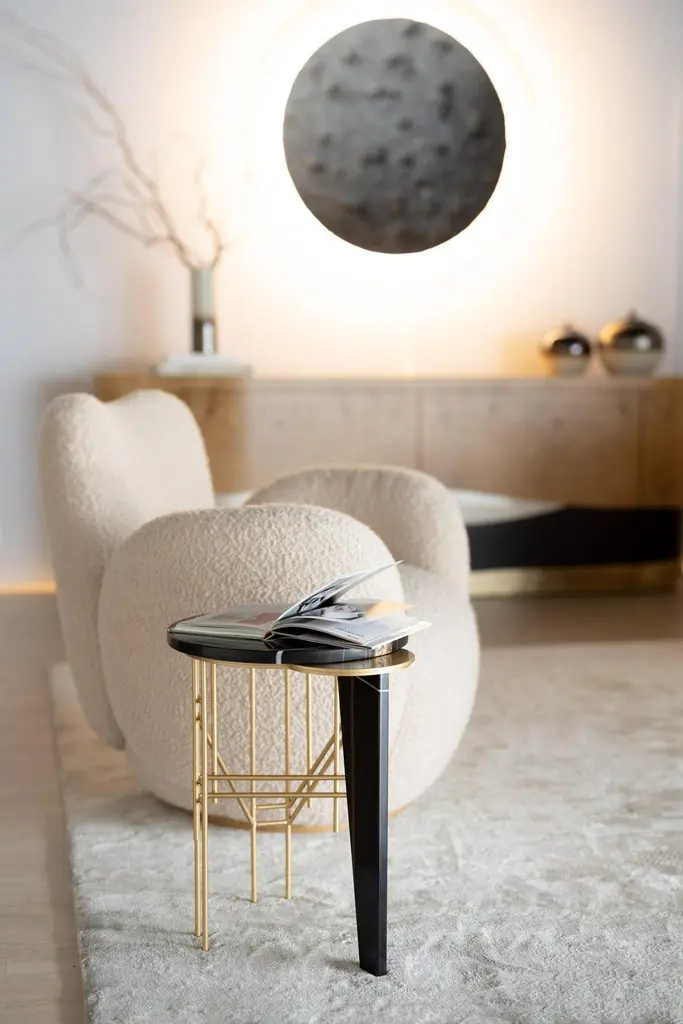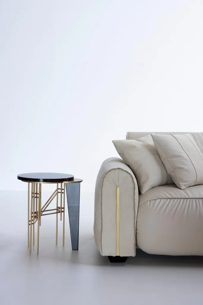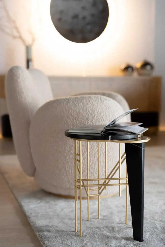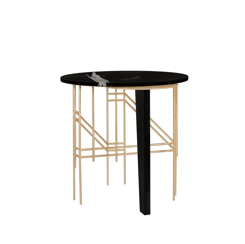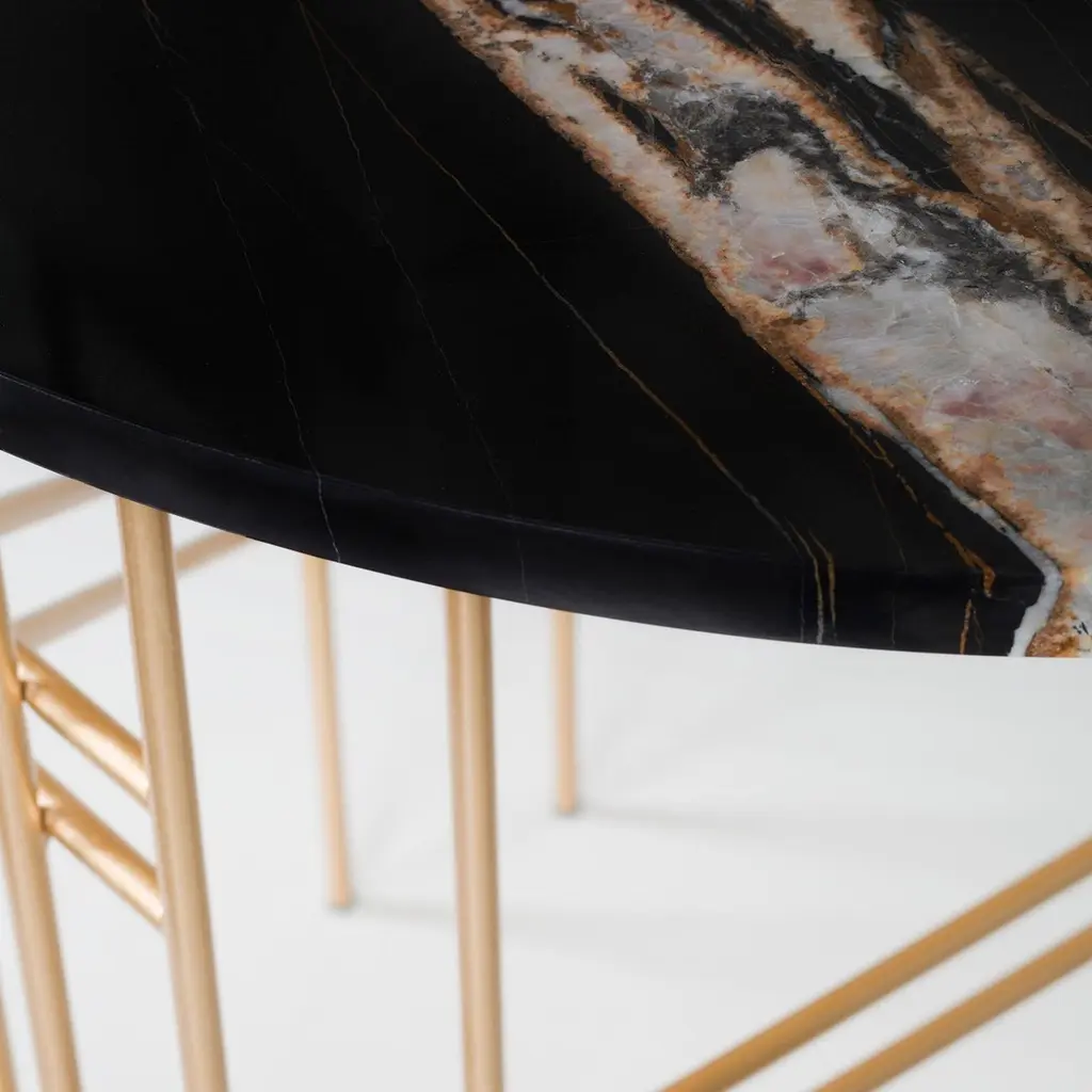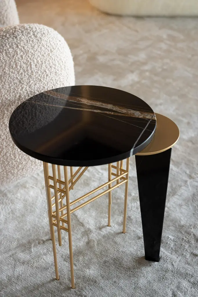 Palafita Side Table, Contemporary Collection, Handcrafted in Portugal - Europe by Greenapple.The Palafita marble side table is inspired by the delicate yet resilient nature of stilts architecture, symbolizing the strength that emerges from overcoming challenges and change with grace. Its thin metal structure, lacquered in gold bronze powder, serves as a visual representation of the delicate balance between that strength and sensitivity. Crafted in noble Sahara Noir marble, Palafita redefines the standards of luxury living.Palafita Side Table Material CodesFI026 Gold bronze powder; high-gloss finishST041 Sahara Noir marble; polishedHandcrafted in Portugal - Europe by GreenappleUnique by design, Crafted by peopleFounded in 2005 by Sérgio Rebola and Rute Martins, Greenapple designs and produces in-house luxury furniture for exclusive customers worldwide.Our own in-house production facility allows us to be obsessed with detail, and gives us the freedom to dedicate ourselves to the most demanding tailor-made and customised work. As Rute designs all the unique pieces, Sérgio assures the high-quality standards through the whole process - from design to production; from production to your home. Fine craftsmanship, whether perfected by experienced hands or state-of-the-art machinery is quintessential in delivering top quality experiences.