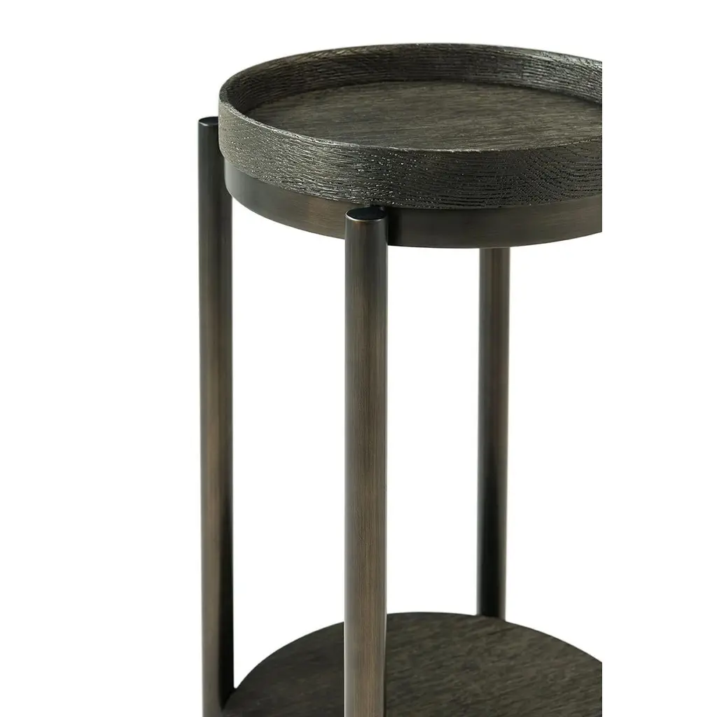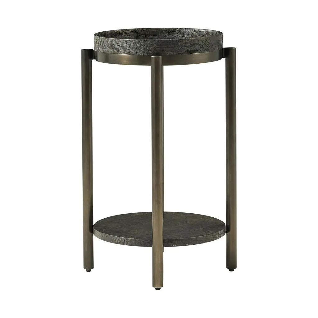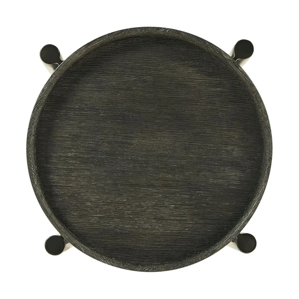 With an oak tray top and contrasting bronzed metal legs, the round side table can also be used as a drink table. With an intensive multi-step hand finish on this piece to bring out the natural wood grain of the wood of our dark charcoal oak finish.Dimensions: 14.25" W x 14.25" D x 22" H