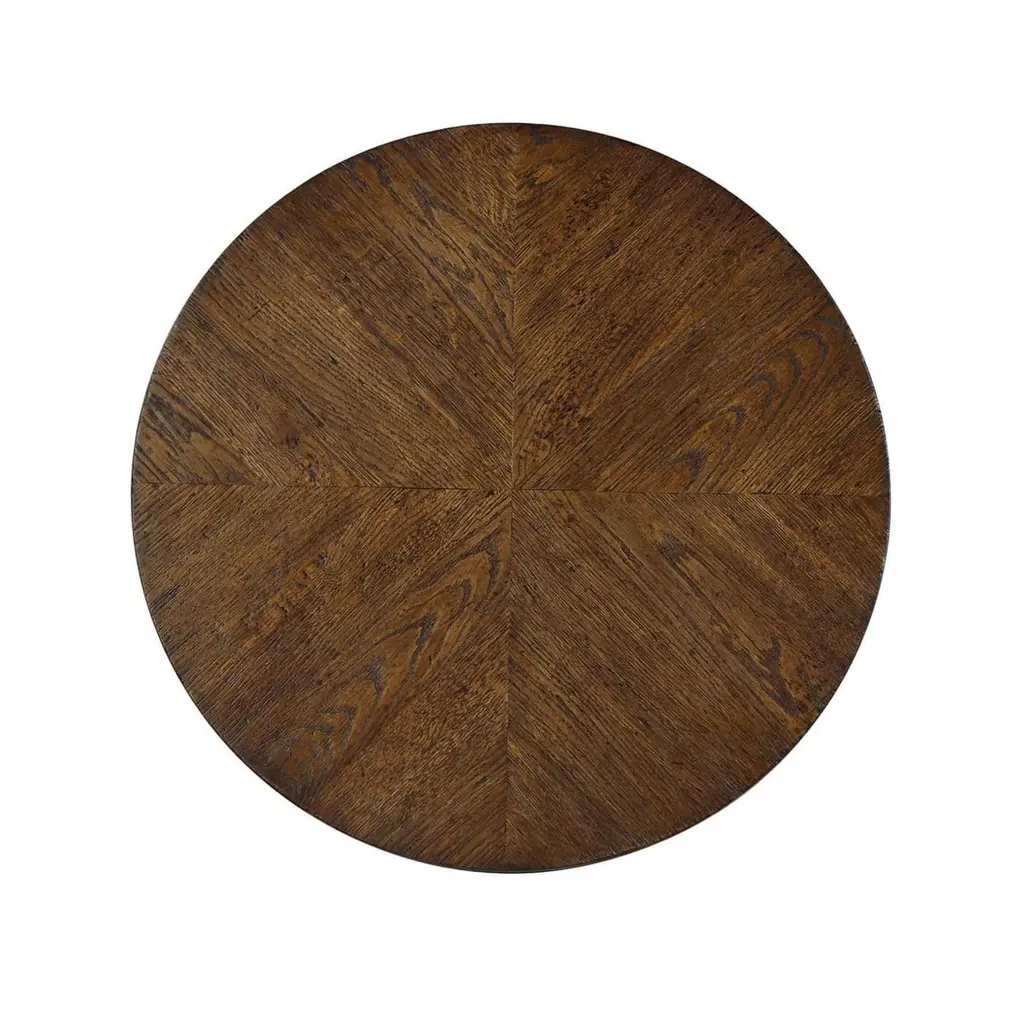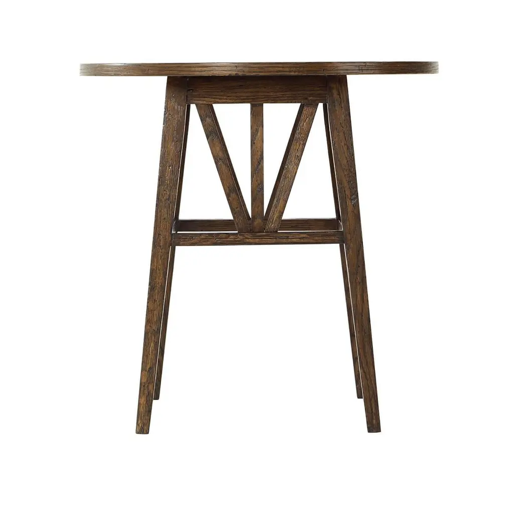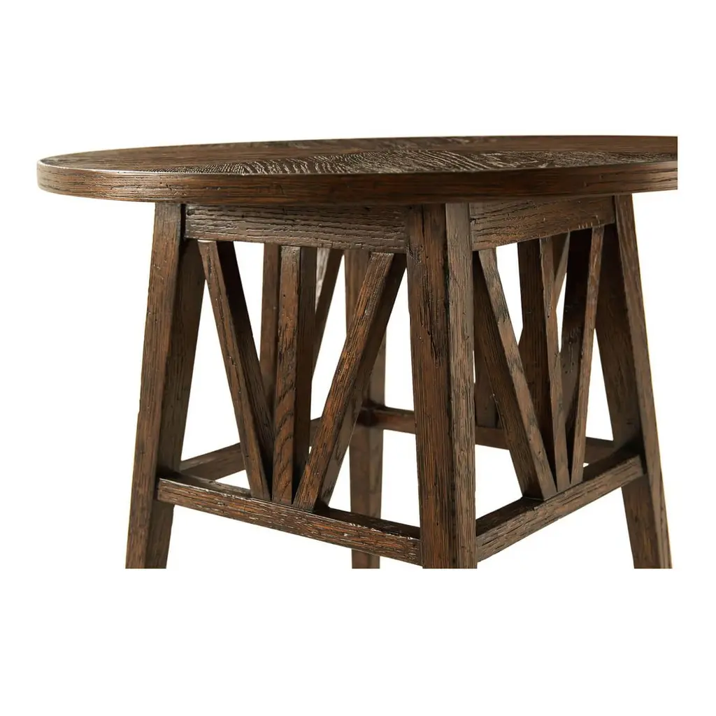 A modern rustic oak round end table with a geometrically arranged oak pattern on the round top. This beautiful table is crafted with a flat truss oak stretcher and a tapered oak leg.Shown in Dusk finishDimensions22" W 22" H x 21.75" H.