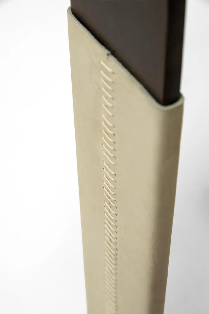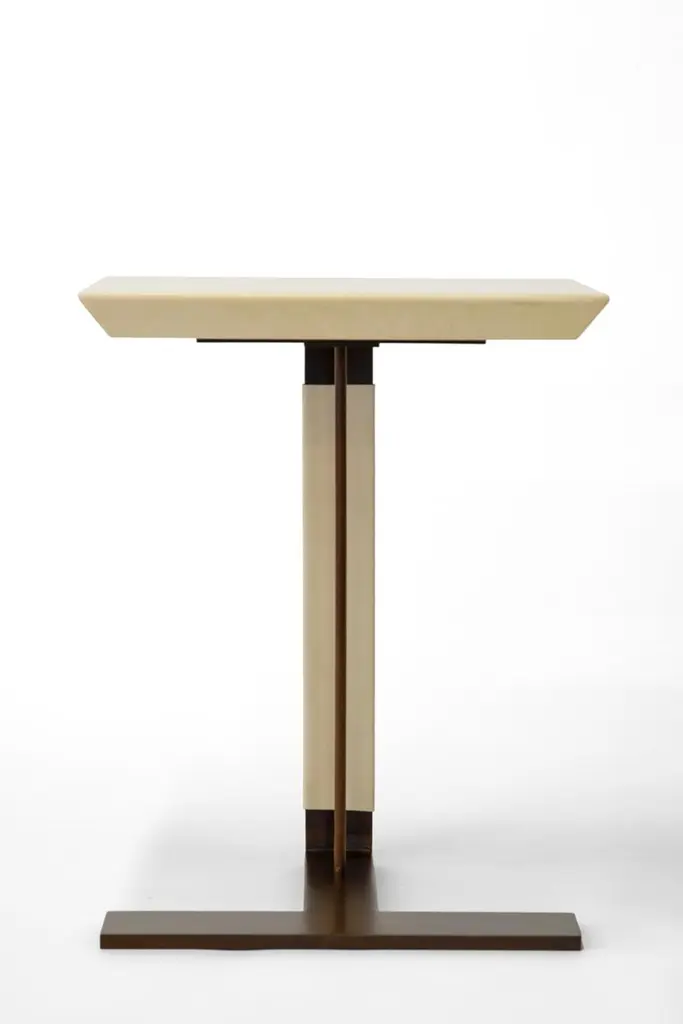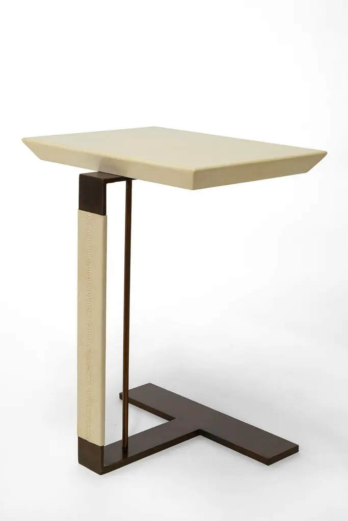 TABLE NO. 13J.M. Szymanskid. 2025This versatile side table, which can also shift effortlessly from side table to desk, features a bronze patinated steel frame paired with a hand dyed parchment leather top. The vertical support is wrapped in hand-stitched suede leather, highlighting the craftsmanship and materiality of the piece. A balanced design of metal and leather makes it sophisticated, sculptural, and undeniably chic. Custom sizes and finishes available. Made in New York City.Custom figure heads, table tops and sizes available. Made in the Bronx, New York, USA.Our products are fabricated and finished by hand, so variations in size, shape, and patina color are a natural result of this process. Tooling marks and surface scratches are part of the character of many finished pieces. All products are sealed with oil and wax, which, over time, are not impervious to moisture. Our blackened steel pieces installed outside or in areas exposed to moisture indoors, especially in marine environments, will rust. Condensation from hot and cold drinks will leave rings on blackened steel table tops. Coasters or placemats can protect the finish. Periodic maintenance of blackened steel items may be required.