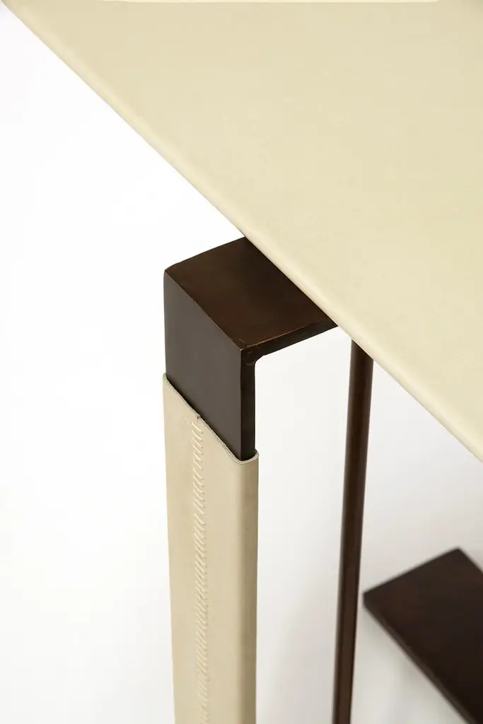 Modern Side Table Desk Bronze Cream Steel Parchment Hand Stitched Suede Leather