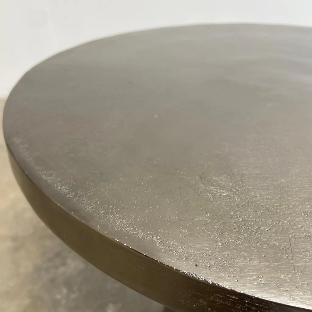 Antique pewter colored side side table.Top has an antique patina, to look as if it is aged. Its sleek clean moder edge is smooth, this table is light weight, easy to use anywhere in the home.Size: 19-1/2” RD. X 23” H.