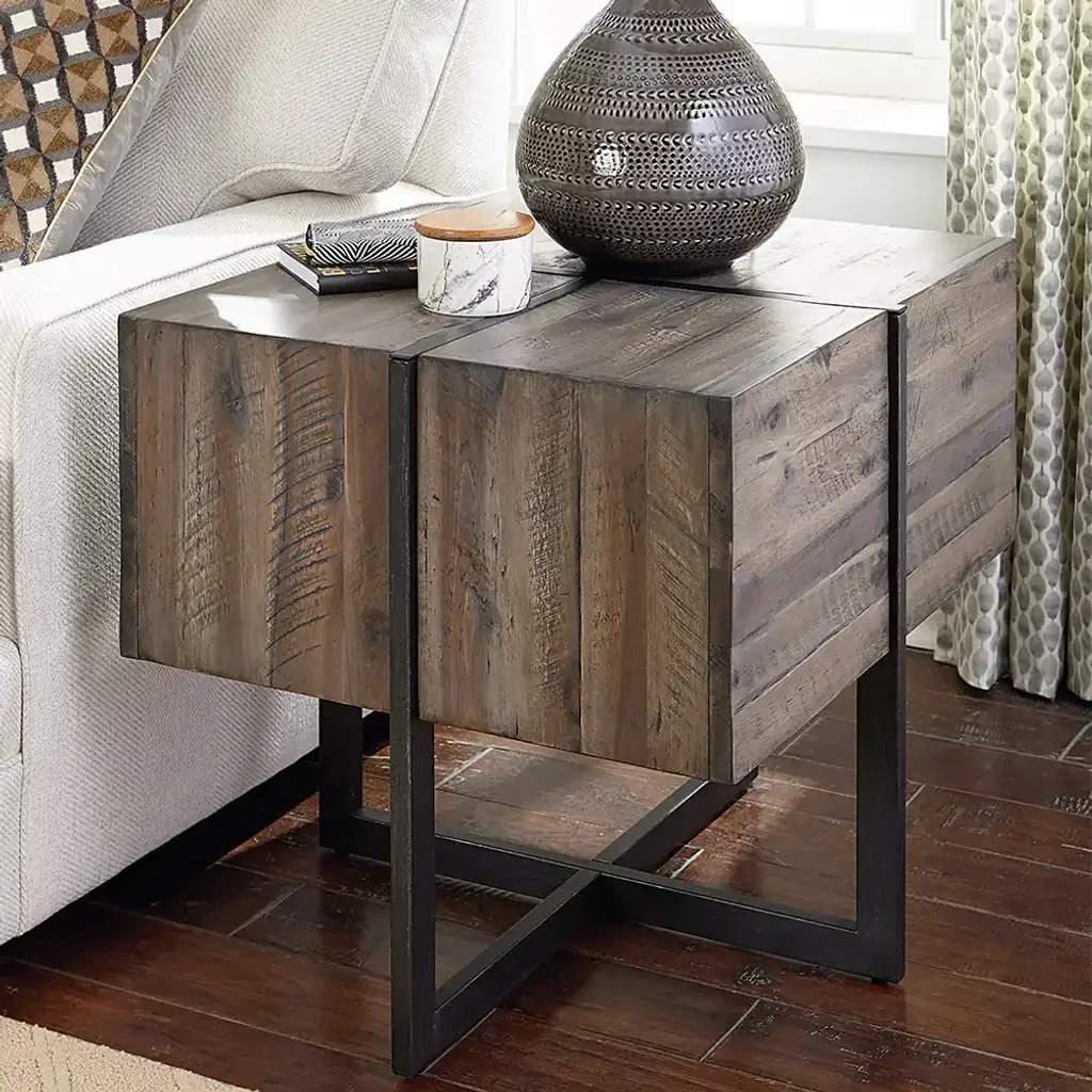 Introducing the Modern Timber Accent End Table, a striking piece that seamlessly blends raw natural beauty with urban sophistication. This unique end table features rough solid acacia wood boxes, each showcasing the wood's inherent grain and texture, enhanced by a natural raw finish. Its custom geometric metal base provides a contemporary twist, offering both stability and an eye-catching design element. Perfect for adding a touch of rustic charm to any modern living space, the Modern Timber Accent End Table stands as a testament to impeccable craftsmanship and innovative design, making it an essential addition to your home decor.