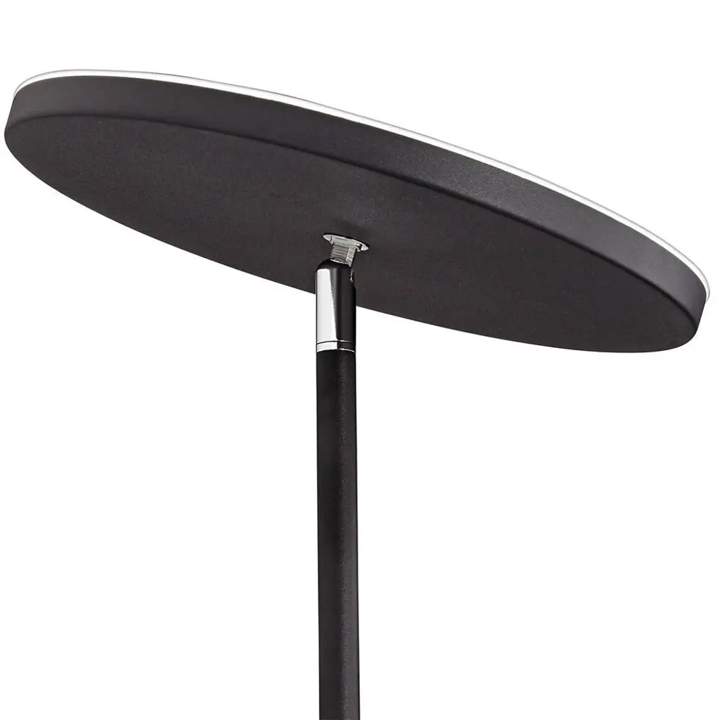 PRODUCT DETAILS: 72" high overall. 11 1/4" base. Top shade is 11" wide. Side shade is 4" wide. Weighs 13.6 lbs. Top light has a built-in 35 watt LED, comparable to a 150 watt incandescent. 2,800 lumens. 3000K. 80 CRI. Side light has a built-in 5 watt LED, comparable to a 40 watt incandescent. 480 lumens. 3000K. 80 CRI. Turn knob dimmer switch for each light. Modern energy-efficient LED floor lamp with side light from the 360 Lighting brand. Adjustable head and side light. Satin black finish metal construction with chrome accents. White acrylic diffusers over each light. 7-foot long cord. DESCRIPTION: Bring modern energy-efficient lighting into your home with this stylish contemporary reading floor lamp from the 360 Lighting brand. It comes in a sleek satin black finish metal frame with a main light on top and a smaller light to the side. White acrylic diffusers cover the LED heads to prevent excess glare.