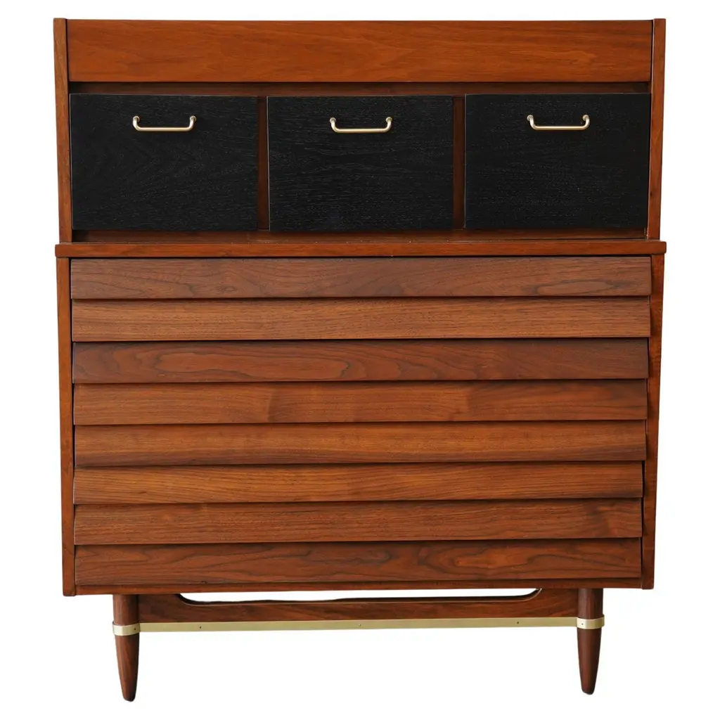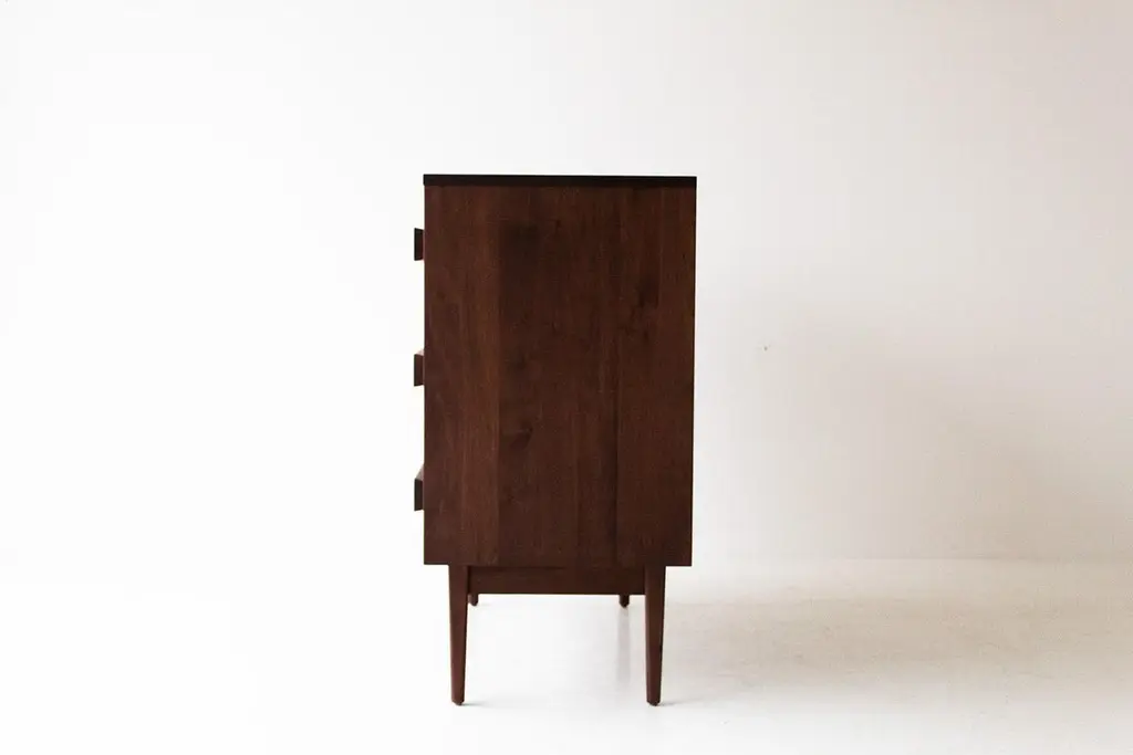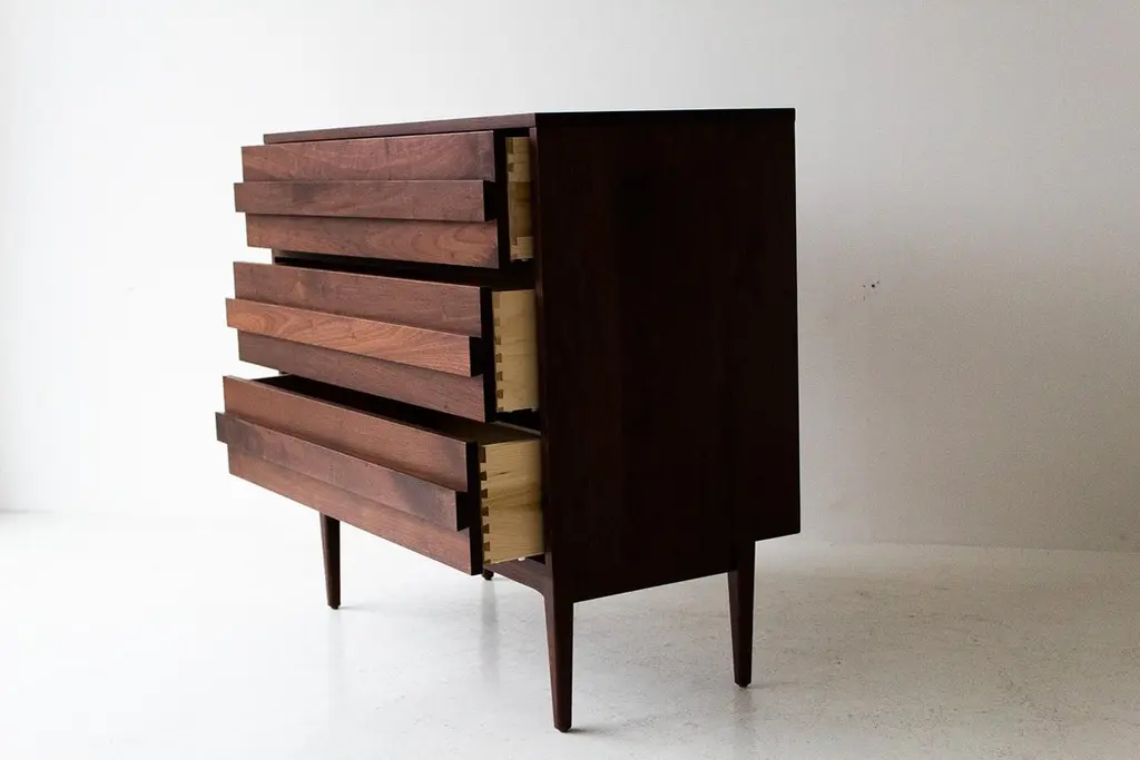 This Modern walnut 3-drawer dresser is made in the heart of Ohio with locally sourced wood. Each piece is hand-made with solid walnut and finished with a beautiful matte commercial grade finish. It is important to us to let the natural beauty of the walnut shine. We use secondary wood for the drawers (poplar), and each is constructed with dovetail joints. These are used for side and end tables in addition to nightstands and can be customized by adding drawers, adding length, or changing the wood species. We absolutely love this design. These nightstands will add a modern but timeless aesthetic to your home.SpecsPeriod/Model: New; Mid Century Modern inspiredSpecs: Walnut, Poplar, Commercial grade finishCustomizable: Yes! It's what we do :)Dimensions H: 36" W: 40"D: 18.75" with pulls, 18" without.