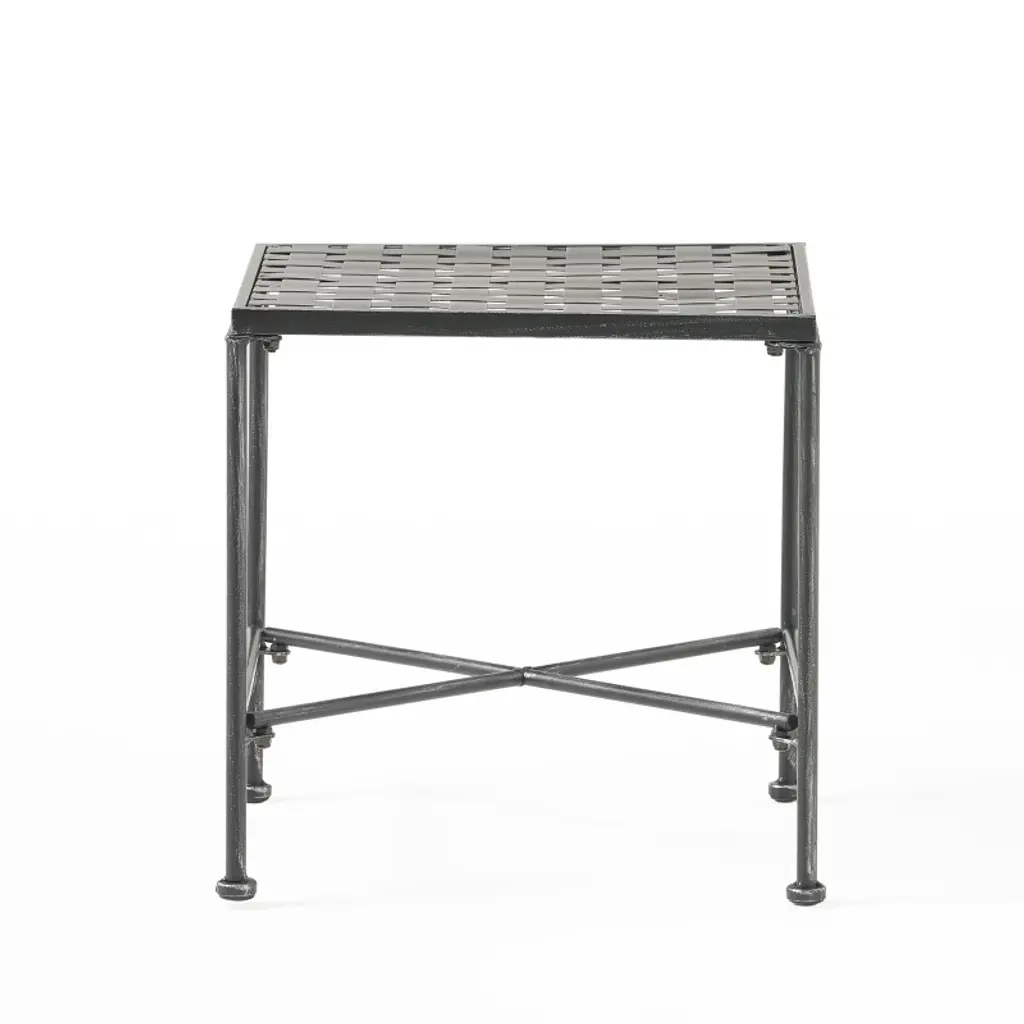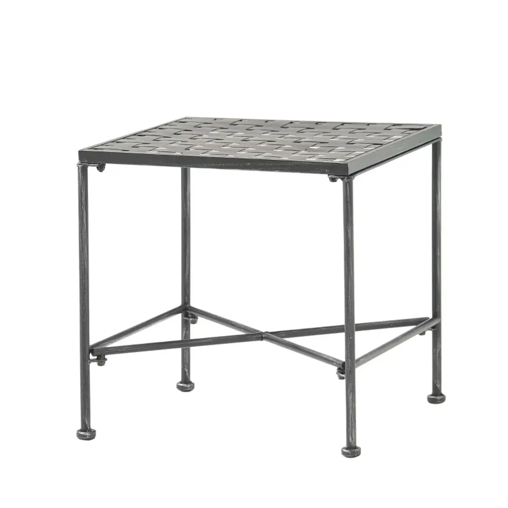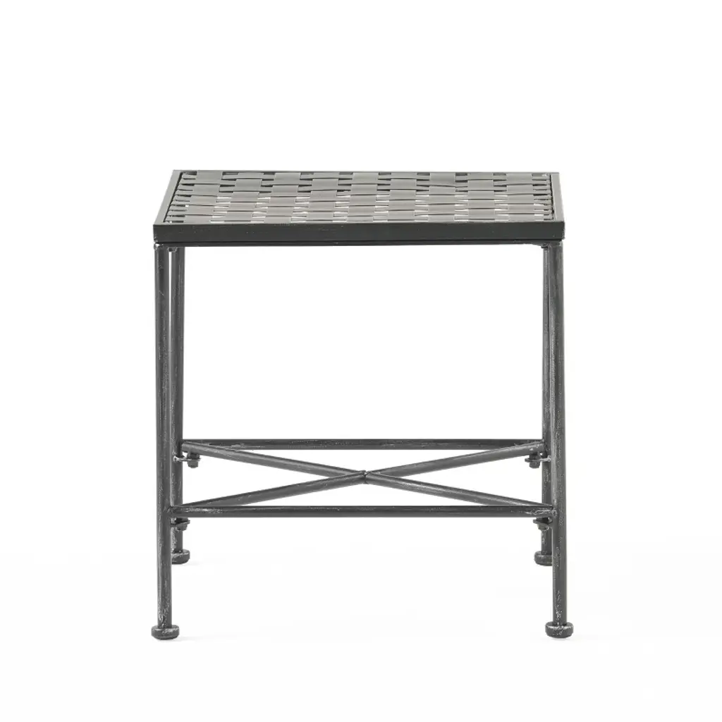 Mix and match with this iron end table. You can pair this end table with almost any set of chairs, loveseats, or coffee tables for your outdoor patio. This table is sure to last you for years to come, and will look good even if you only plan on using it as a side table for the family BBQ. ? ?One (1) table Constructed of powder coated iron ? ?Black brush silver in color, compliments most existing decor Dimensions:16.50"D x 16.75"W x 16"HAssembly required