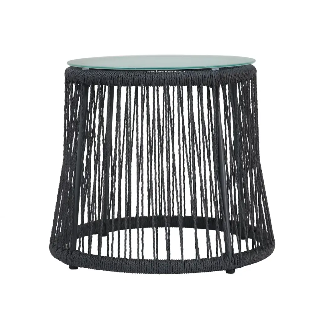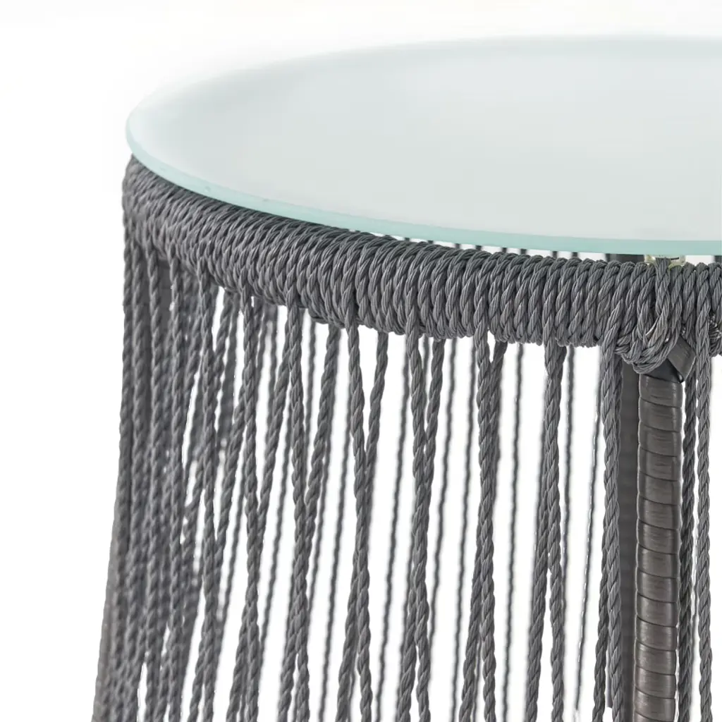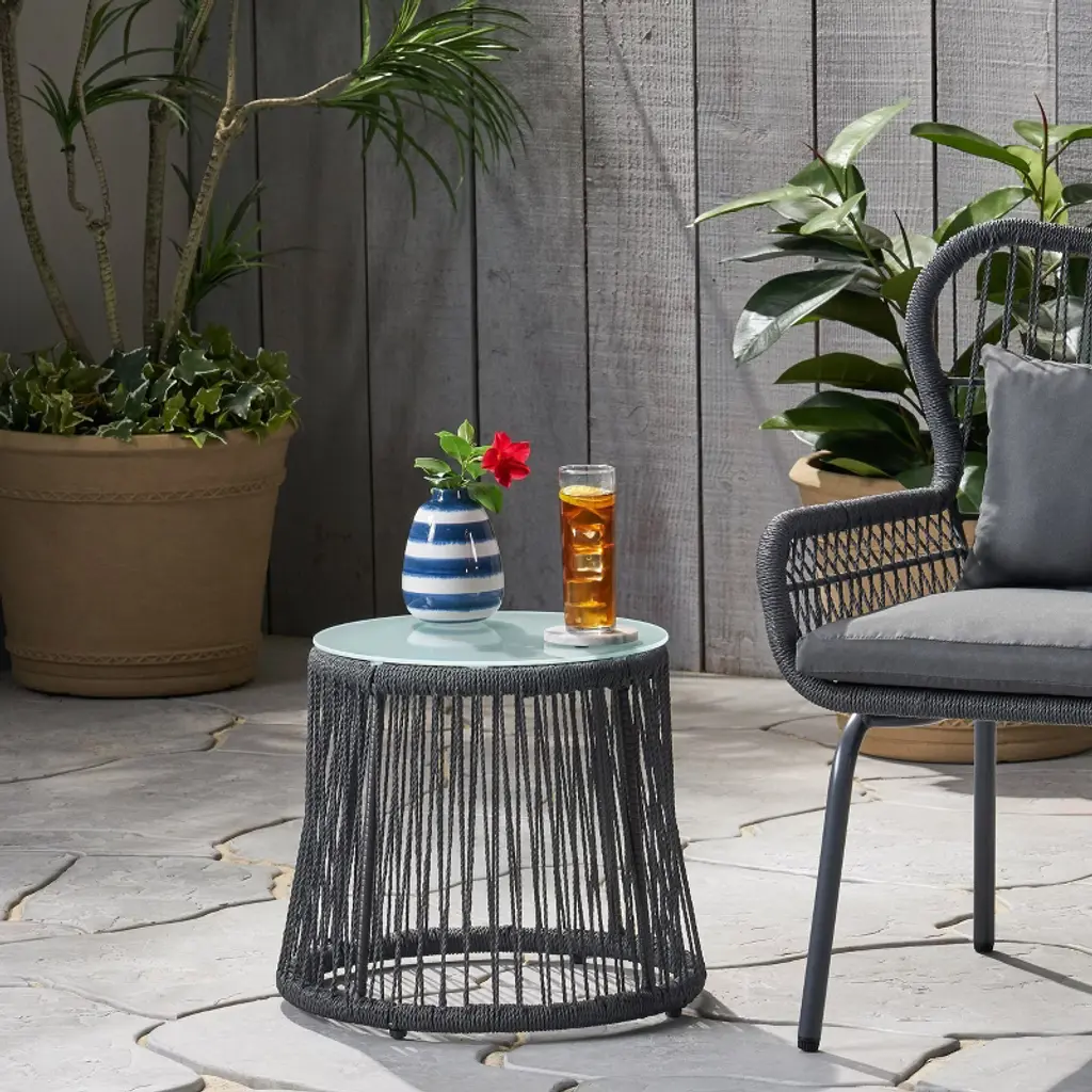 The perfect boho accent to any patio collection, this glass-topped end table is a unique combination of naturally-textured rope and a rugged iron frame. This versatile selection can serve as a rustic endcap for your favorite outdoor sofa or as a shared place to chat over hot coffee. CHIC AND BOHO - The natural texture of the rope siding contrasts boldly with this piece's sleek tempered glass top; it's supported by a robust iron frame. PERFECT FOR ANY HOME - Lighten up your current set-up with this chic and boho accent. EASY TO CLEAN - Its smooth glass top allows you to wipe away spills effortlessly. SOME ASSEMBLY REQUIRED - This piece comes with everything you need to get started, tools, hardware and all.