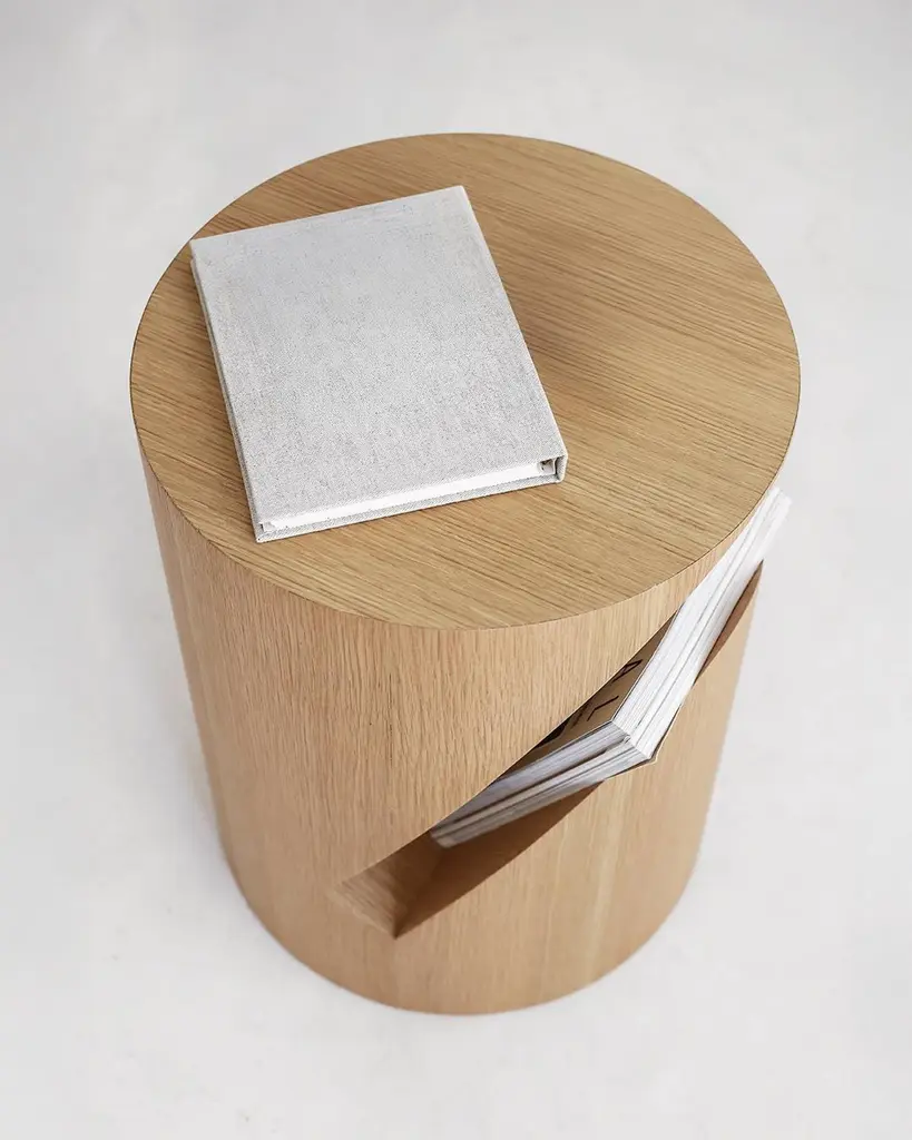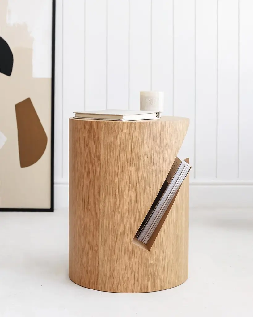 It is made of solid oak veneer and can be used both as a side table and a nightstand. The chamber in the body is designed as a newspaper/magazine holder, giving the product a different function. It is a product where you can feel the texture, warmth and naturalness of wood in the most effective way. Due to the unique structure of each tree, each product may have a different texture, vein structure, pattern and tone. These are the features that reflect the naturalness of the tree. It is handcrafted using natural methods by local artisans.