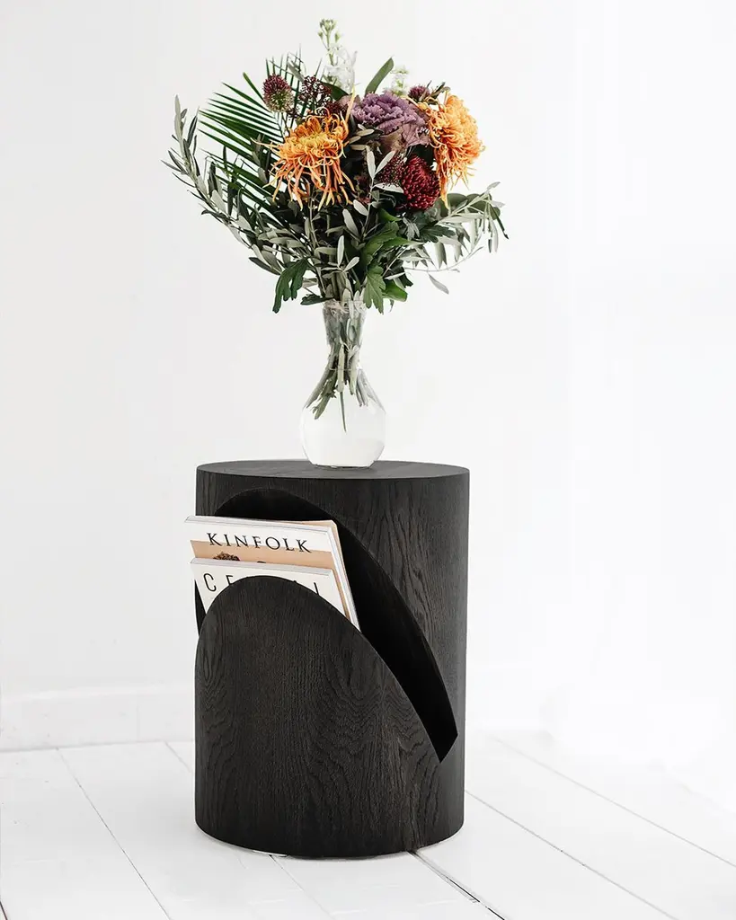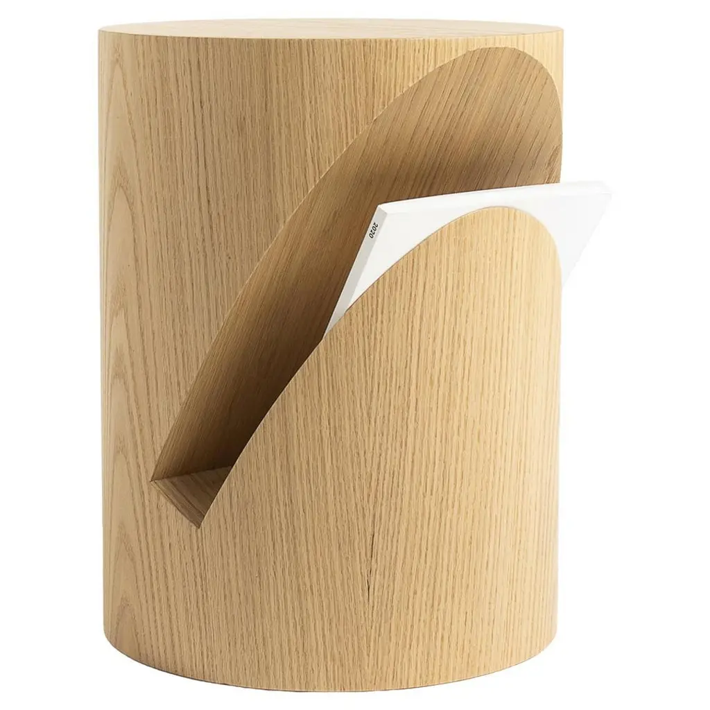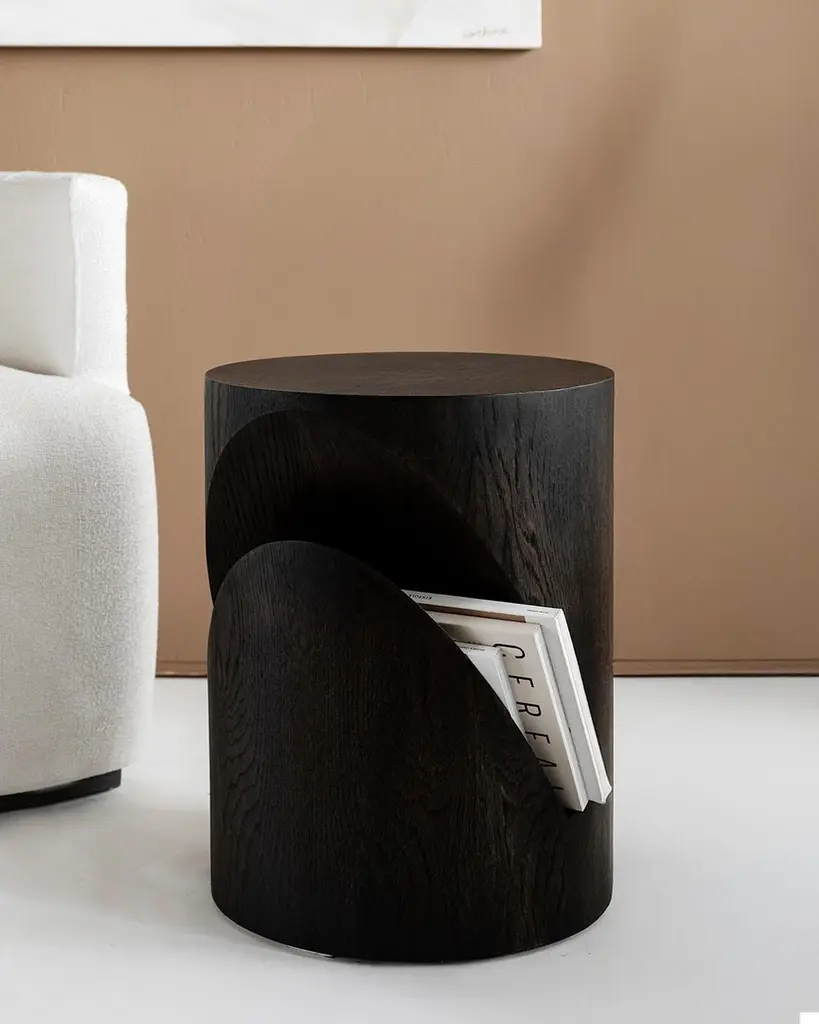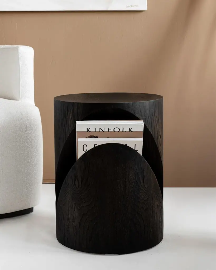 It is made of solid oak veneer and can be used both as a side table and a nightstand. The chamber in the body is designed as a newspaper/magazine holder, giving the product a different function. It is a product where you can feel the texture, warmth and naturalness of wood in the most effective way. Due to the unique structure of each tree, each product may have a different texture, vein structure, pattern and tone. These are the features that reflect the naturalness of the tree. It is handcrafted using natural methods by local artisans.