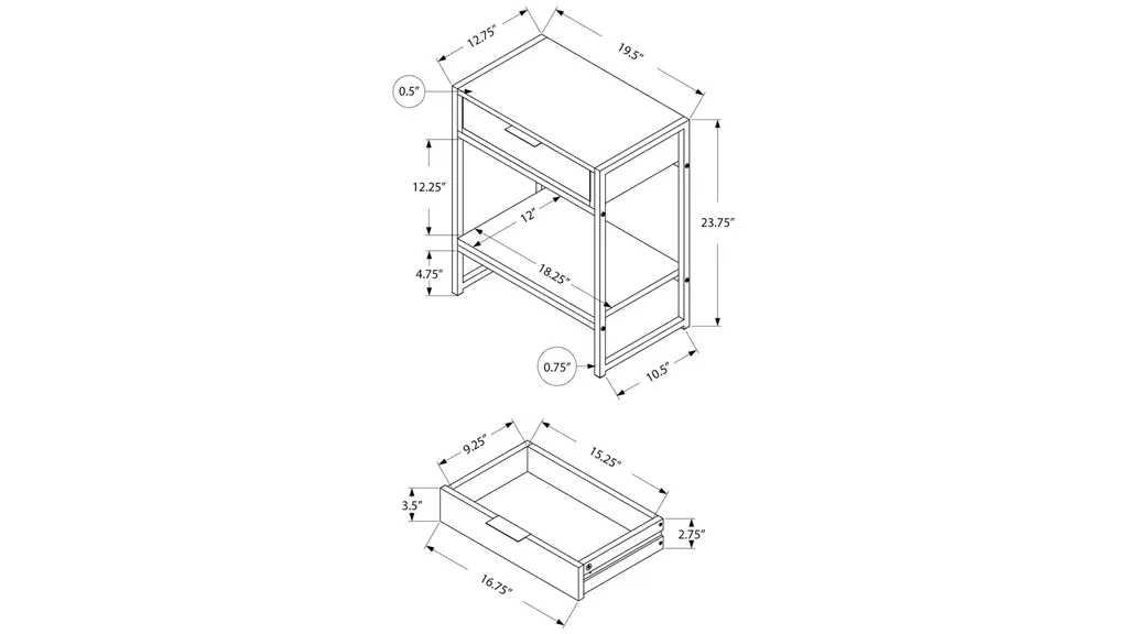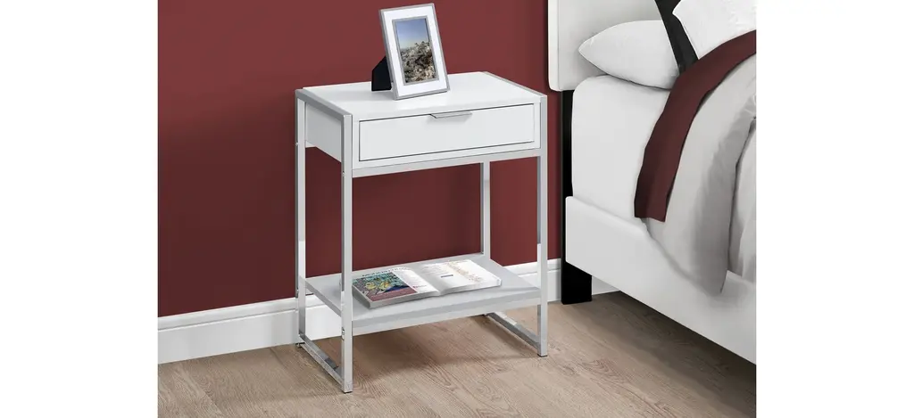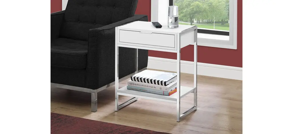 Add instant style to a room with the Monarch Specialties Accent End Table. It features a spacious rectangular table top with an elegant glossy finish and one large storage drawer on metal glides with a simple metal handle on top. The open bottom shelf in the same finish is handy to store or display more items and the simple square chrome metal supports tie it all together for in an effortless design. Bring this accent table into the bedroom as a chic nightstand, place it next to your modern sofa or arm chair as a useful side table. The compact size also makes it ideal for smaller spaces. Assembly is required