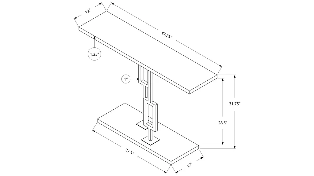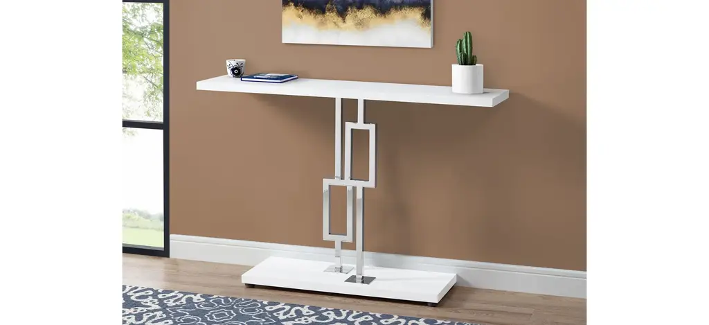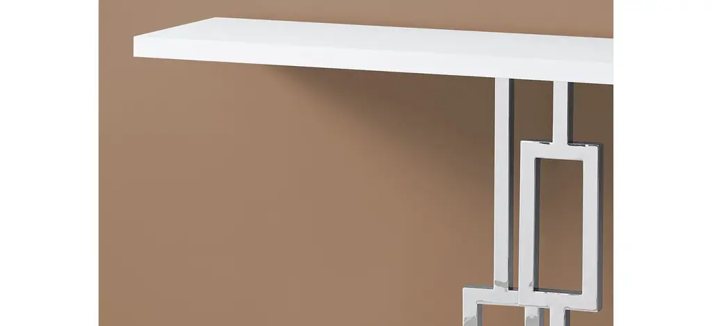 Make a statement with this multi-functional Monarch Specialties T Accent Table. The glossy rectangular top and base brings a chic aesthetic while the polished geometric chrome base provides all the drama! Show it off in your hallway or entryway as an accent piece to display decorative objects, hold some books or simply to place your keys and mail. Bring it into the living room and use it to set up a drink and appetizer station or behind your sofa for display. Compact enough even for small spaces, this console table will be the most versatile furniture you own. Assembly is required.