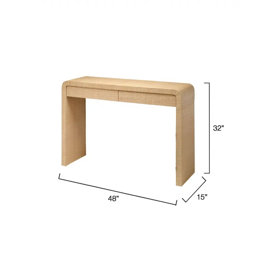 Mid-century meets southern California coastal in this casually sophisticated console. Tightly wrapped in natural raffia, its slim lines conceal two handy drawers for storage.The accent table is perfect for just inside the front door or behind a sofa, and it was designed to be a fit for today’s easy yet elegant homes.