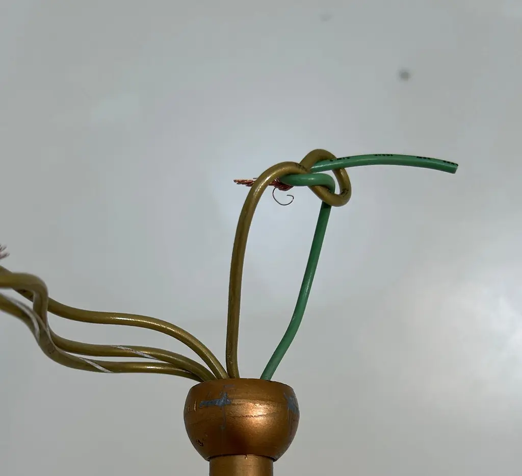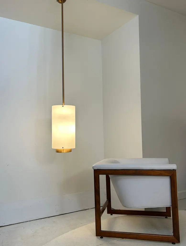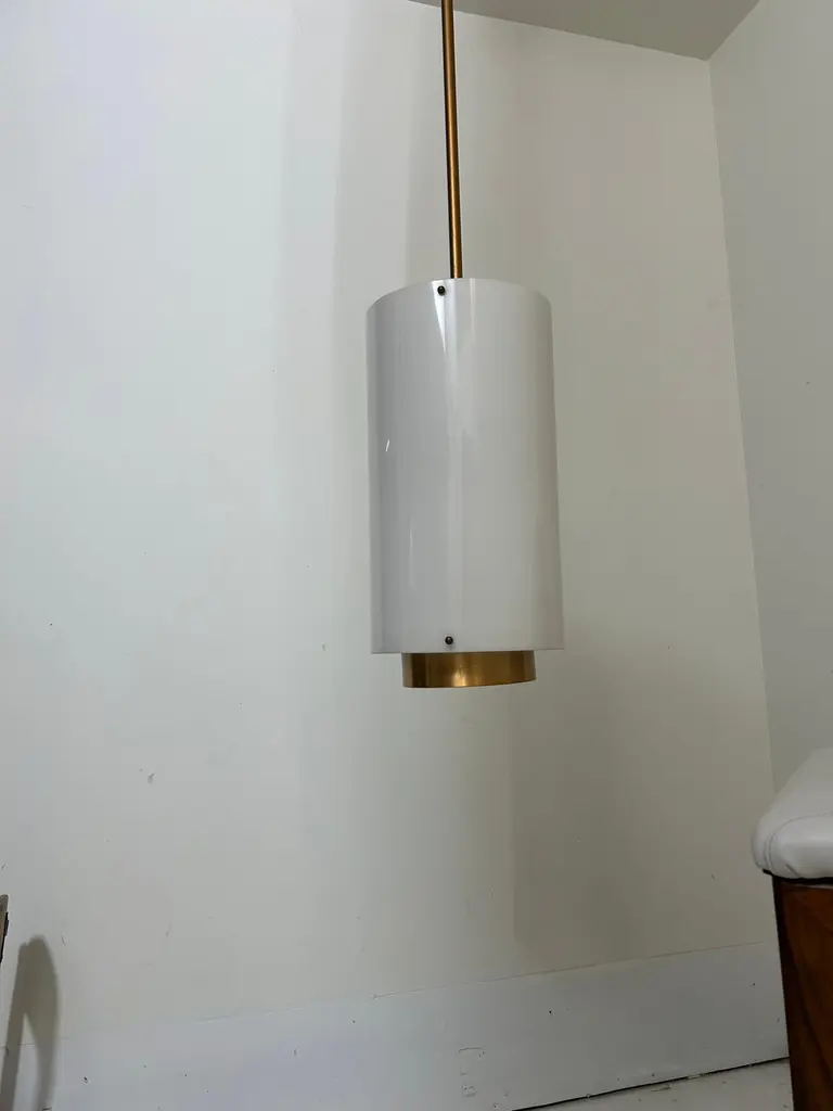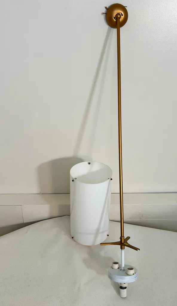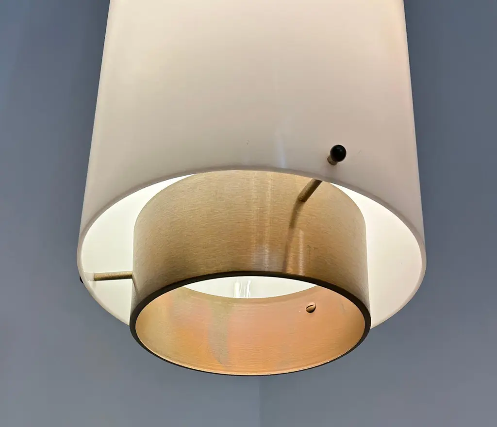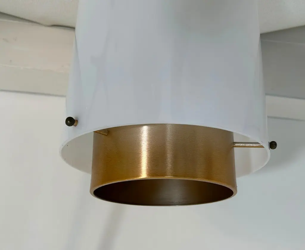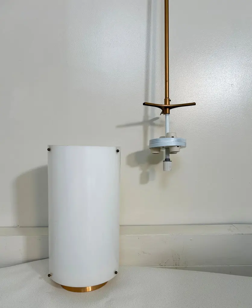 10 Available. Priced individually. Monumental 10" wide by 19.5" in height. Adjustable pole adds 48" making these 67.5" tall. Rods can be re-threaded to reduce drop. Acrylic shades suspended on 3 knobs top and bottom. Bottom diffuser is a bronzed metal with the stems and ceiling plate painted gold. These lamps hold 2 bulbs illuminating up, 3 bulbs facing down and a central lower single bulb - 7 bulbs total and capable of in excess of 1000 watts. Ideal for commercial applications or very large residence. Note how the pendant chandeliers illuminate very evenly. Note also that the wiring allows for 3/7 bulbs to be illuminated so by wiring them to suit, you can have half/full power and attach dimmers. The sockets are porcelain and they have a label certifying them for commercial applications, no manufacturer or designer noted. Probably produced by EJS or Paul Mayen for Habitat. As the domes for the ceiling are domes and the top of the stem is a ball these swivel or the rods can be removed entirely for flush mount, these can also be deployed on slanted ceilings. They are in excellent condition.