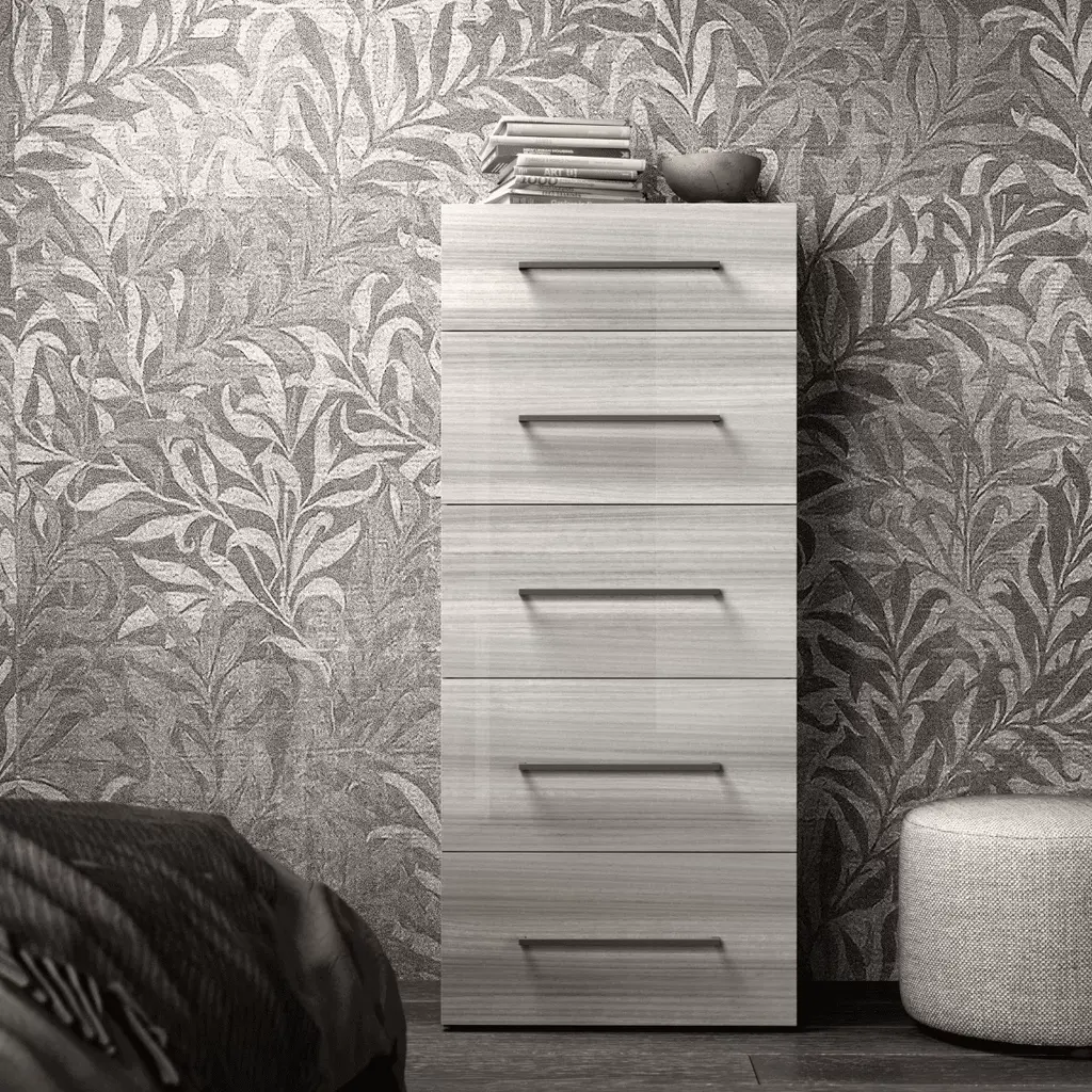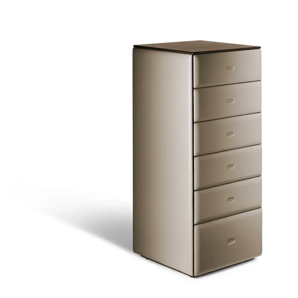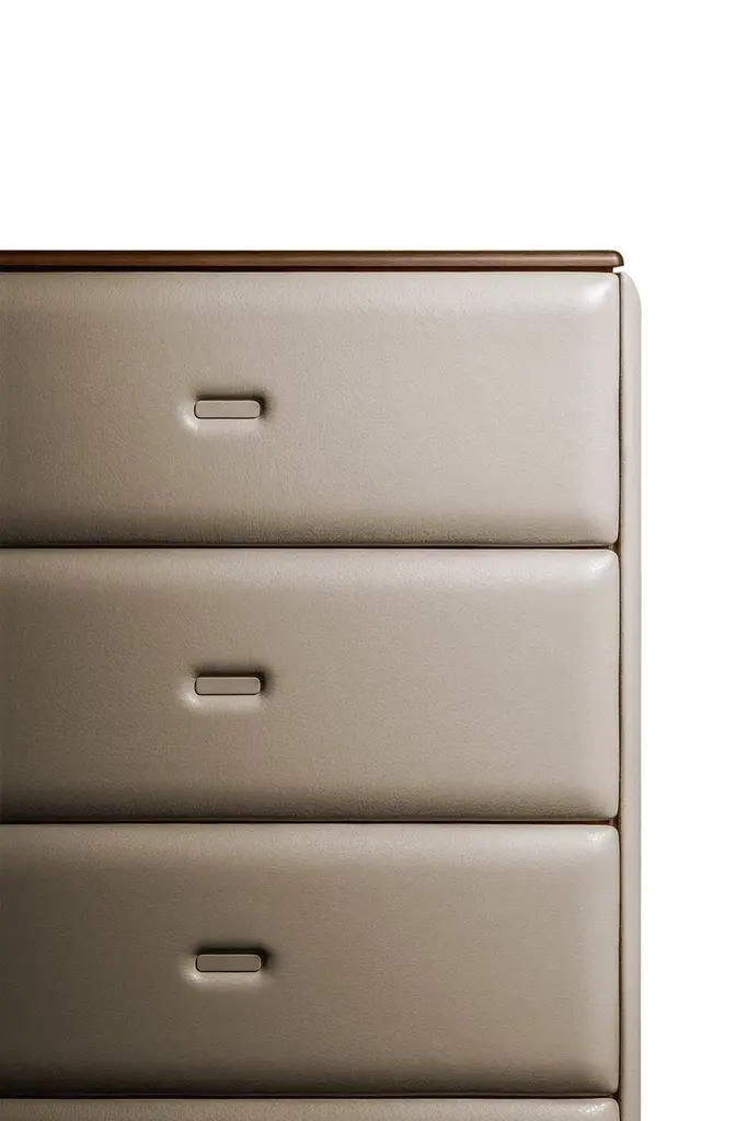Moondance dresser, tall boy and bedside table. A collection of accessories that transforms the bedroom into a luxurious intimate and welcoming personal oasis. Roberto Lazzeroni designs familiar and reassuring forms that transmit new tactile and visual emotions through the elegant use of materials, creating a cosy and relaxing atmosphere. The volumes lighten and open thanks to delicate converging lines. Every Moondance accessory is upholstered by hand like a unique object. Entirely covered in Pelle Frau® leather and embellished with light padding, pleasant to touch and easy on the eye. The top has the warmth of Canaletto walnut and the natural veins of Calacatta gold marble with semi-polished finish. Each drawer can be arranged and organised according to personal taste, choosing from the refined accessories that complete the Moondance collection. A series of solid wood trays divided into compartments of various sizes and configurations enable you to comfortably store away any kind of item, including ties and belts.Elegant watch and ring boxes slip perfectly into the drawer compartments and are covered in beige Alcantara®. Inside there is a soft cushion in the same material. Also in beige Alcantara® is the little insert, in two sizes, used to further refine the bottom of the drawer.The supporting structure of the Moondance complementary furnishings is in poplar plywood with solid Canaletto walnut trim. The back is available in a version with Canaletto walnut veneer or upholstered in Pelle Frau® leather. The structure of the drawers is in MDF with a cut Canaletto walnut veneer and fronts in birch plywood. The Pelle Frau® leather upholstery is padded with polyurethane foam. Steel feet with black plastic protective caps that can be adjusted from the inside.