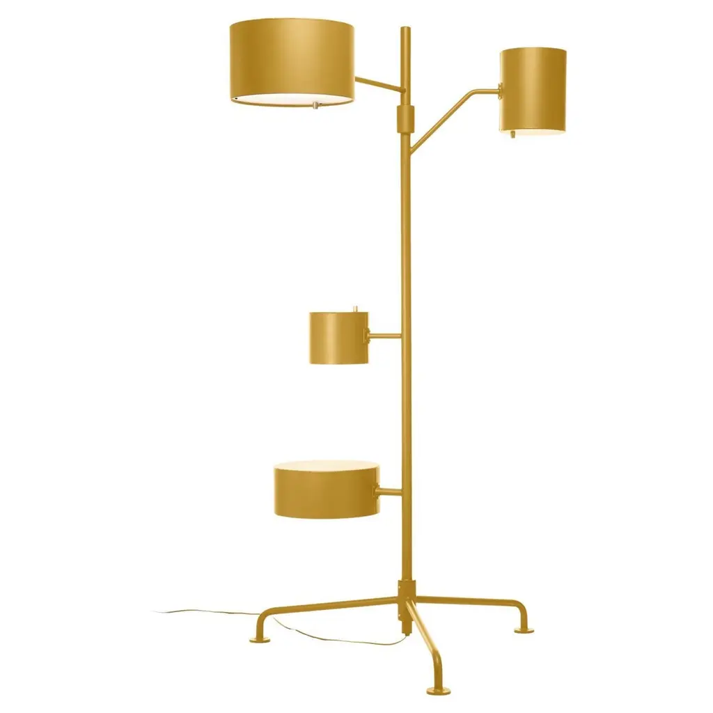 The floor lamp’s lean aluminium body is really multifunctional with its towering two meters and all-embracing light beams, the tallest shade projecting light towards the ceiling while the wider shade acts as the perfect reading lamp. And what about the two other shades? The lowest is no shade … but a surprisingly useful side table. Perfect to support a laptop or your favorite drink, it’s always in the spotlight!Additional information:Materials: AluminiumFinish: CurryEnergy label: Energy Label BLight source type: LEDLight source included: YesLight output: 1200 lmNumber of light sources: 3Input voltage: 90-130VFrequency: 50/60Max power consumption: 40WColour temperature: 2700 KDimmable: YesLamp holder: LED (Solid State)Plug type: US plug (Type A)Switch: In line on/off switchCable colour: BlackCable length: 300cm 118.1"Lifetime: 50000 hoursLight direction: All directionsDimensions: 130 W x 90 D x 200 H cmAvailable in other finish option: Oyster white, Yellow orange, Vermilion, Pure orange, Ruby red, Beige red, Light pink, Sapphire blue, Grey blue, Pastel blue, Grass green, Pale green, Silver grey, Iron grey, Light grey, Silk grey, Ochre brown, Sepia brown, Jet black, Traffic white, Traffic yellow, Mahogany brown, Golden yellow, Pure white.