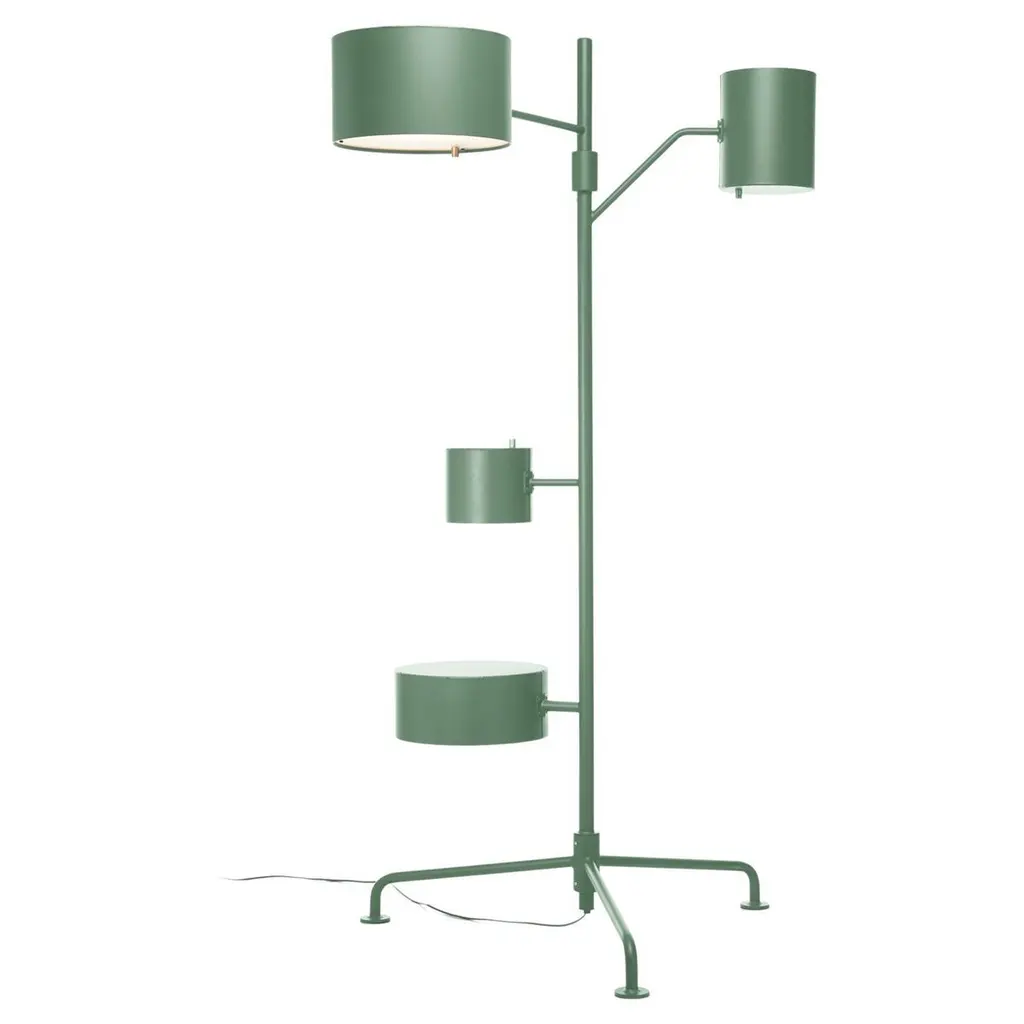 The floor lamp’s lean aluminium body is really multifunctional with its towering two meters and all-embracing light beams, the tallest shade projecting light towards the ceiling while the wider shade acts as the perfect reading lamp. And what about the two other shades? The lowest is no shade … but a surprisingly useful side table. Perfect to support a laptop or your favorite drink, it’s always in the spotlight!Additional information:Materials: AluminiumFinish: Grass GreenEnergy label: Energy Label BLight source type: LEDLight source included: YesLight output: 1200 lmNumber of light sources: 3Input voltage: 90-130VFrequency: 50/60Max power consumption: 40WColour temperature: 2700 KDimmable: YesLamp holder: LED (Solid State)Plug type: US plug (Type A)Switch: In line on/off switchCable colour: BlackCable length: 300cm 118.1"Lifetime: 50000 hoursLight direction: All directionsDimensions: 130 W x 90 D x 200 H cmAvailable in other finish option: Oyster white, curry, yellow orange, vermilion, pure orange, ruby red, beige red, light pink, sapphire blue, grey blue, pastel blue, pale green, silver grey, iron grey, light grey, silk grey, ochre brown, sepia brown, jet black, traffic white, traffic yellow, mahogany brown, golden yellow, pure white.