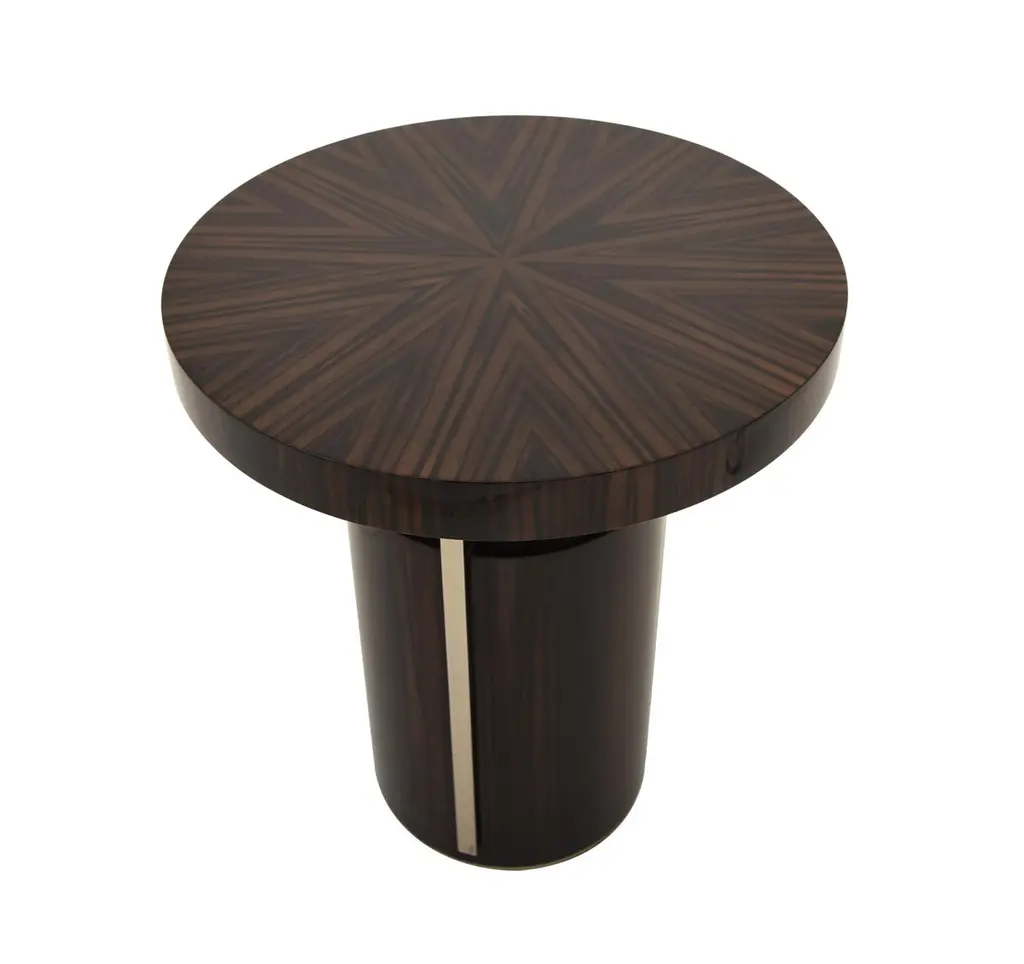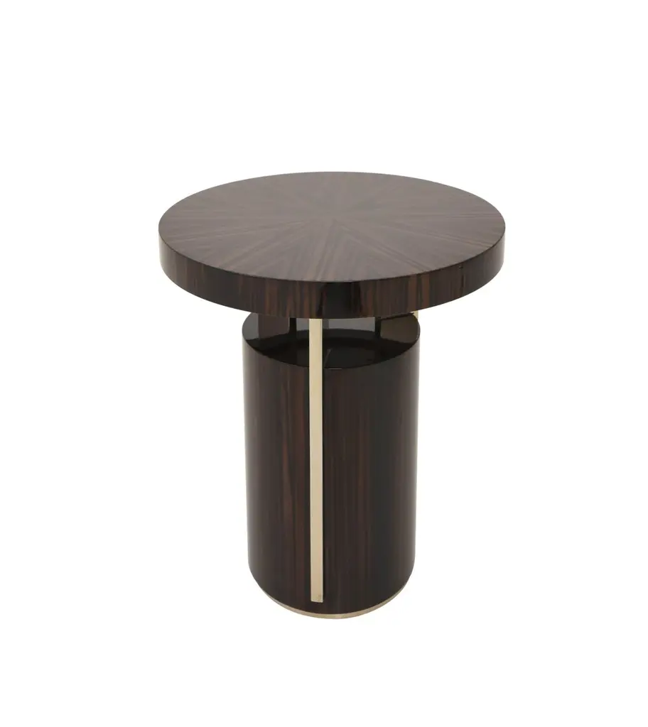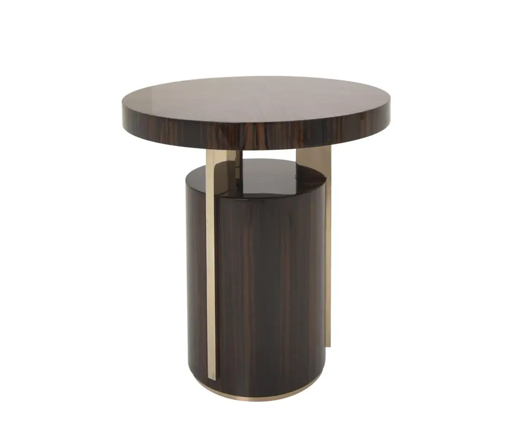 A study in balance and material contrast, this side table combines the warmth of louro preto wood finish with the subtle elegance of smoke brass. Its design is defined by three metal details in a smoke brass finish, supporting a round wooden top.The duality of light and dark tones creates a striking architectural presence, while discreet brass details at the base add a refined note of sophistication.