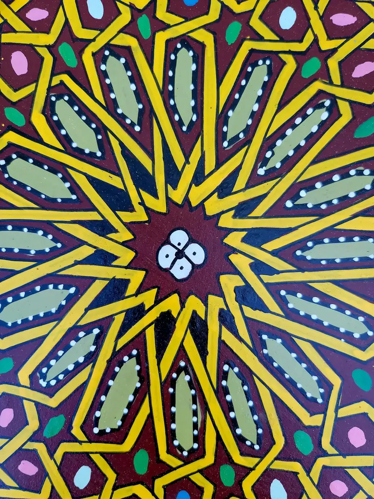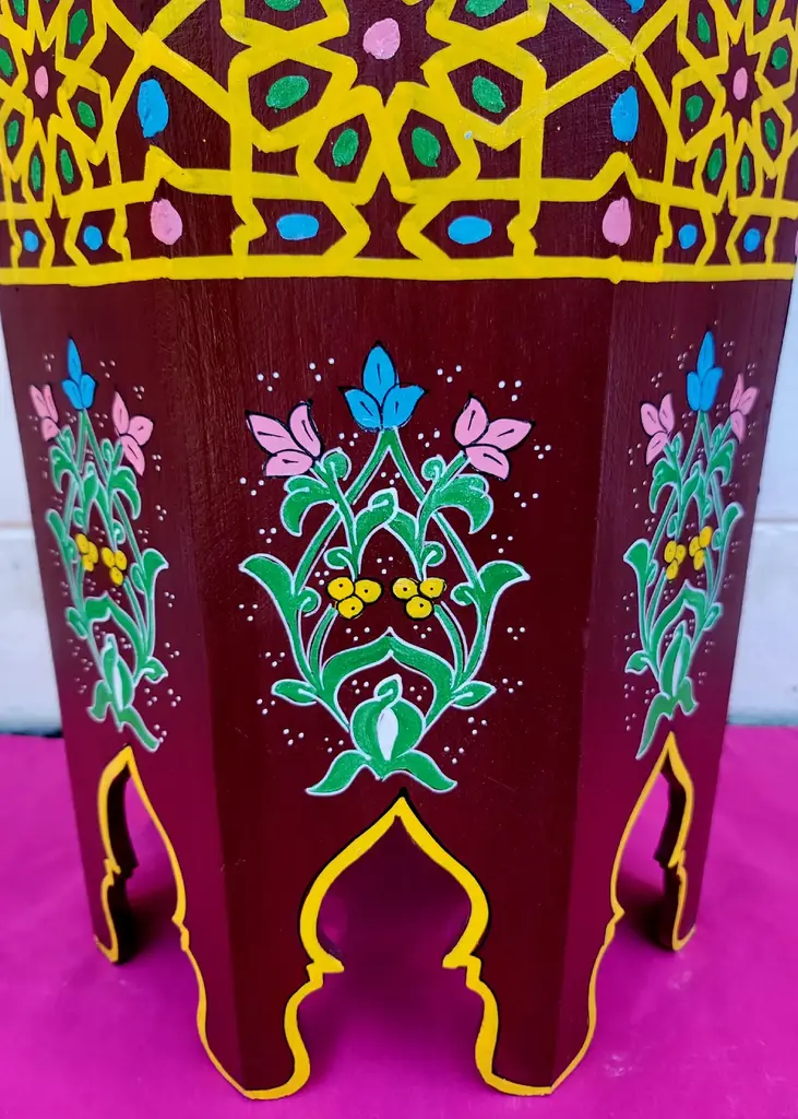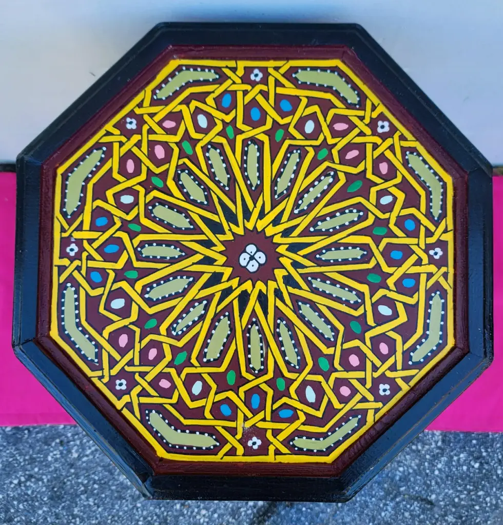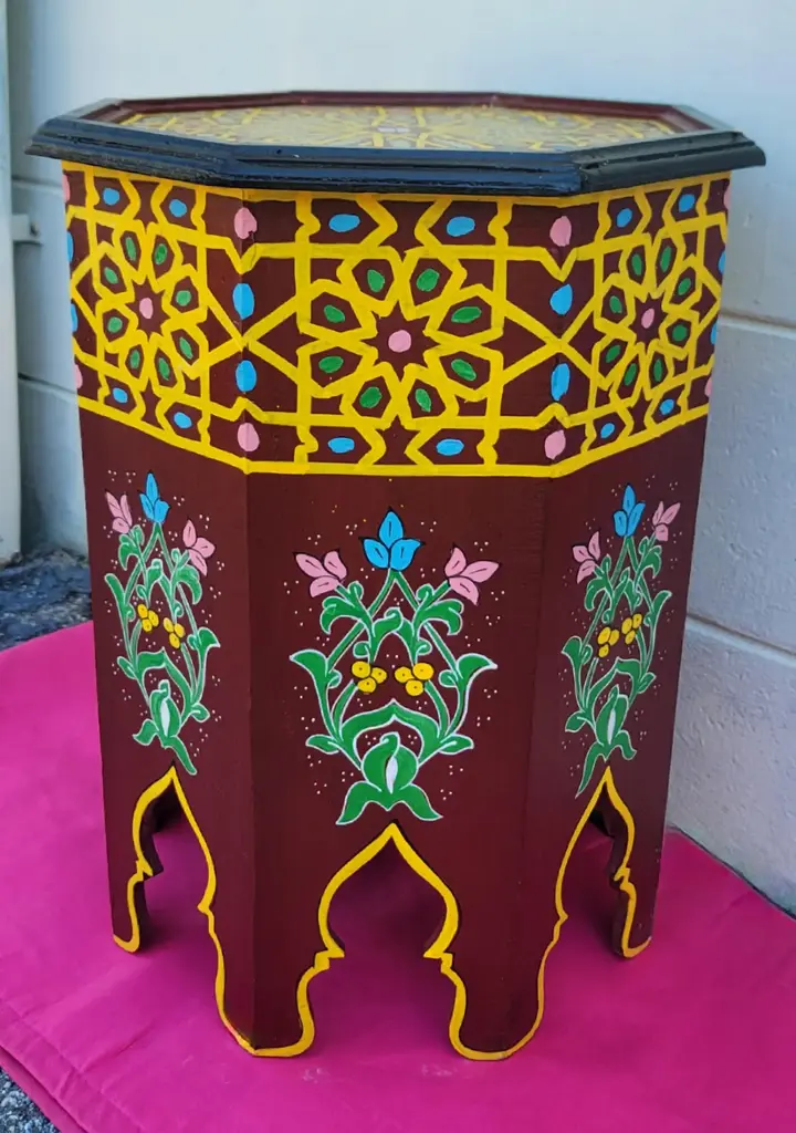 This is a 100% hand painted and hand carved Moroccan Octagonal shape side table or end table. Great handcraftsmanship throughout, featuring the famous Moroccan Zouak woodwork. Beautiful add-on to your home or office decor. This table measures approximately 19" in height, 15" from corner to corner.