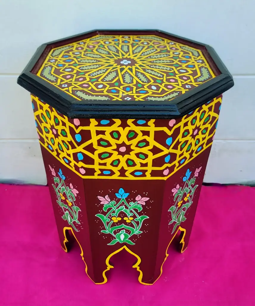 Moroccan Hand Painted Octagonal Wooden Side Table / Maroon Zouak
