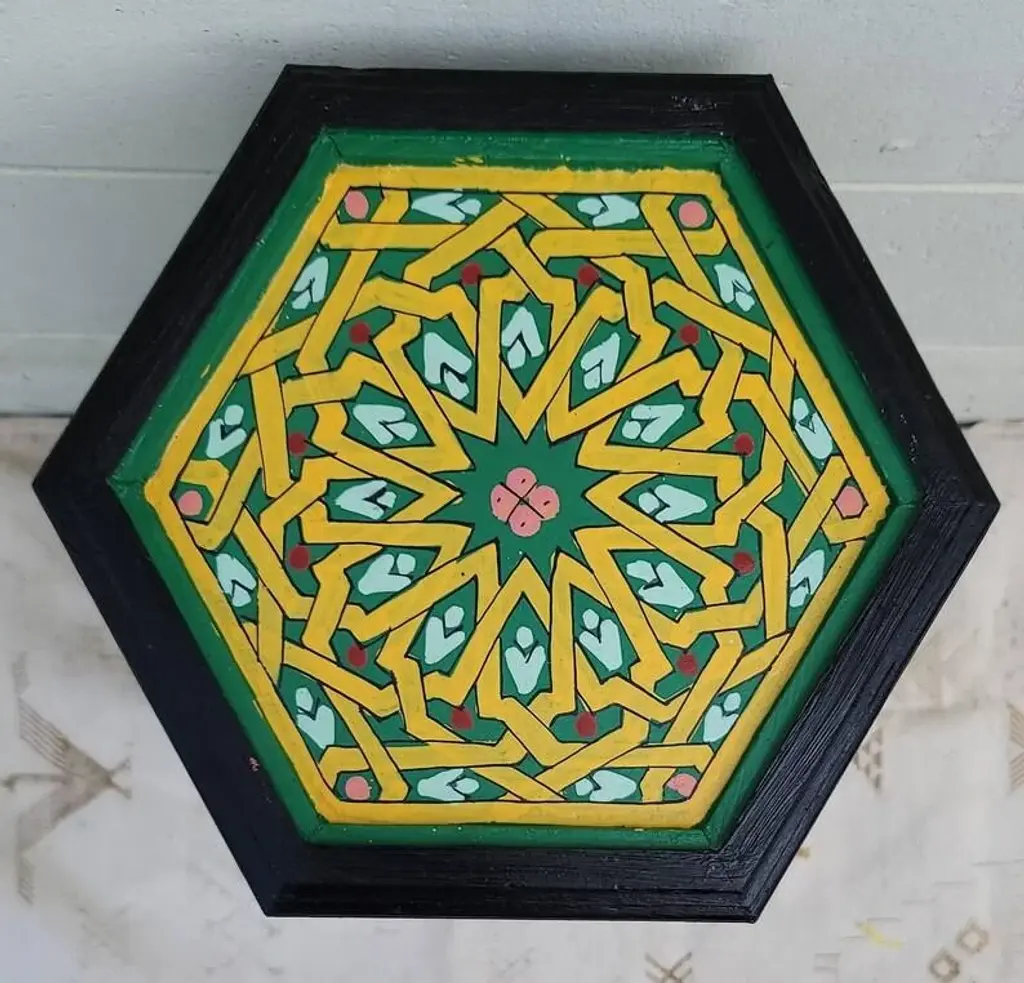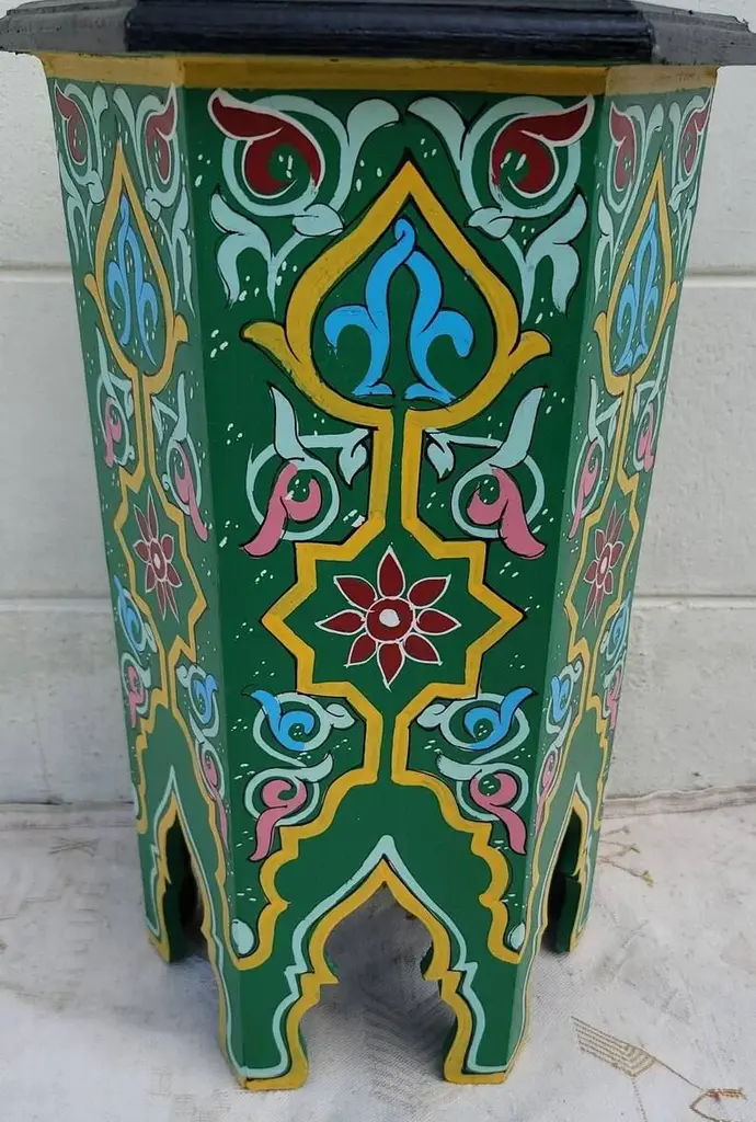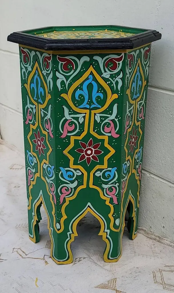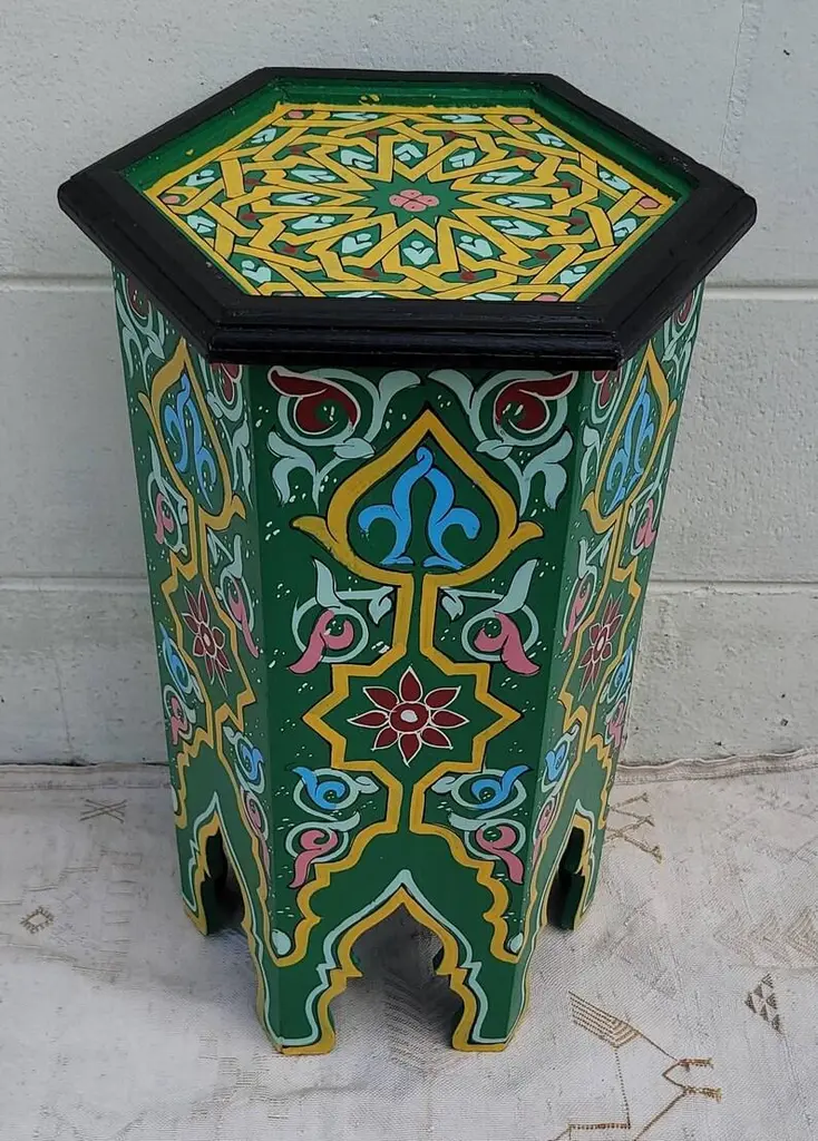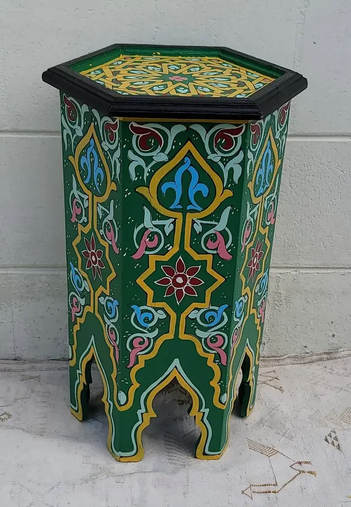 This is a 100% hand painted and hand carved Moroccan hexagonal shape side table or end table. Great handcraftsmanship throughout, featuring the famous Moroccan Zouak woodwork. Beautiful add-on to your home or office decor. This table measures approximately 19.5" in height, 13" from corner to corner. Also available in many other colors