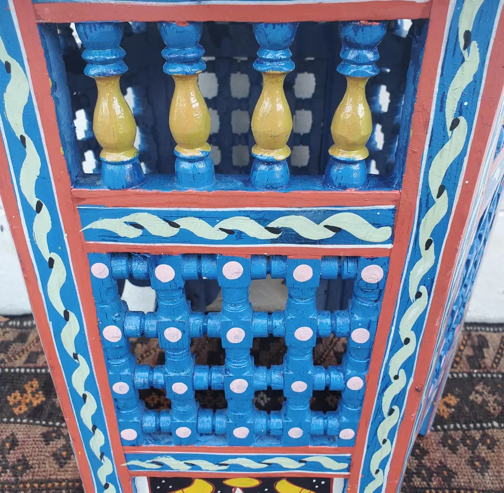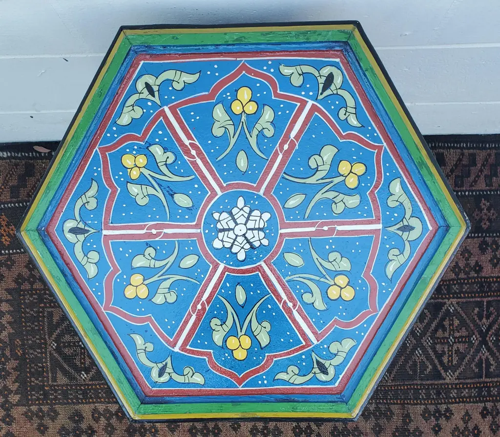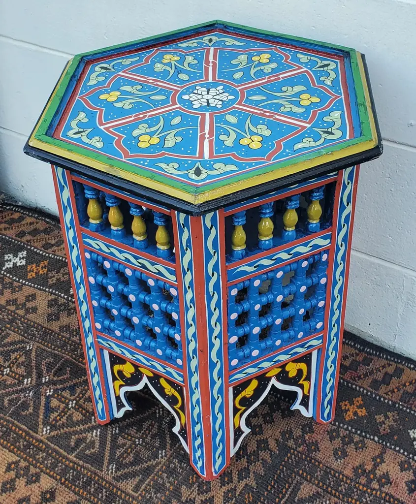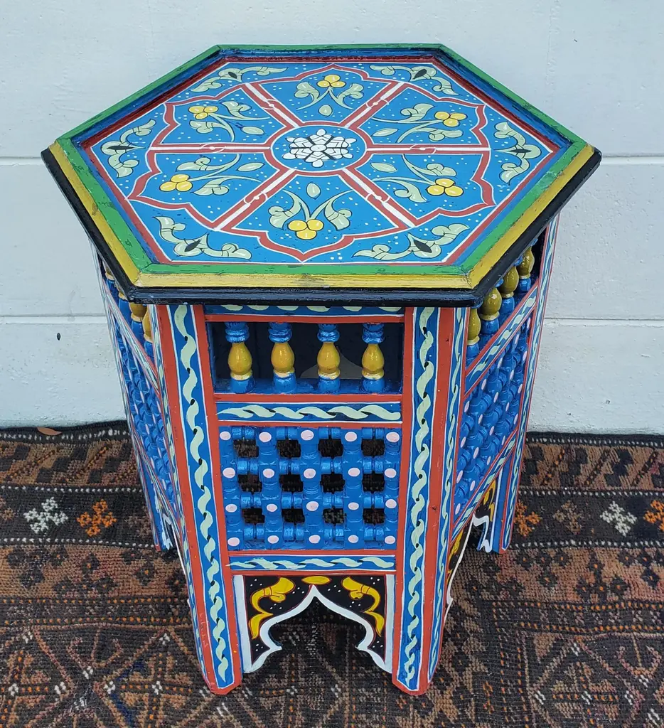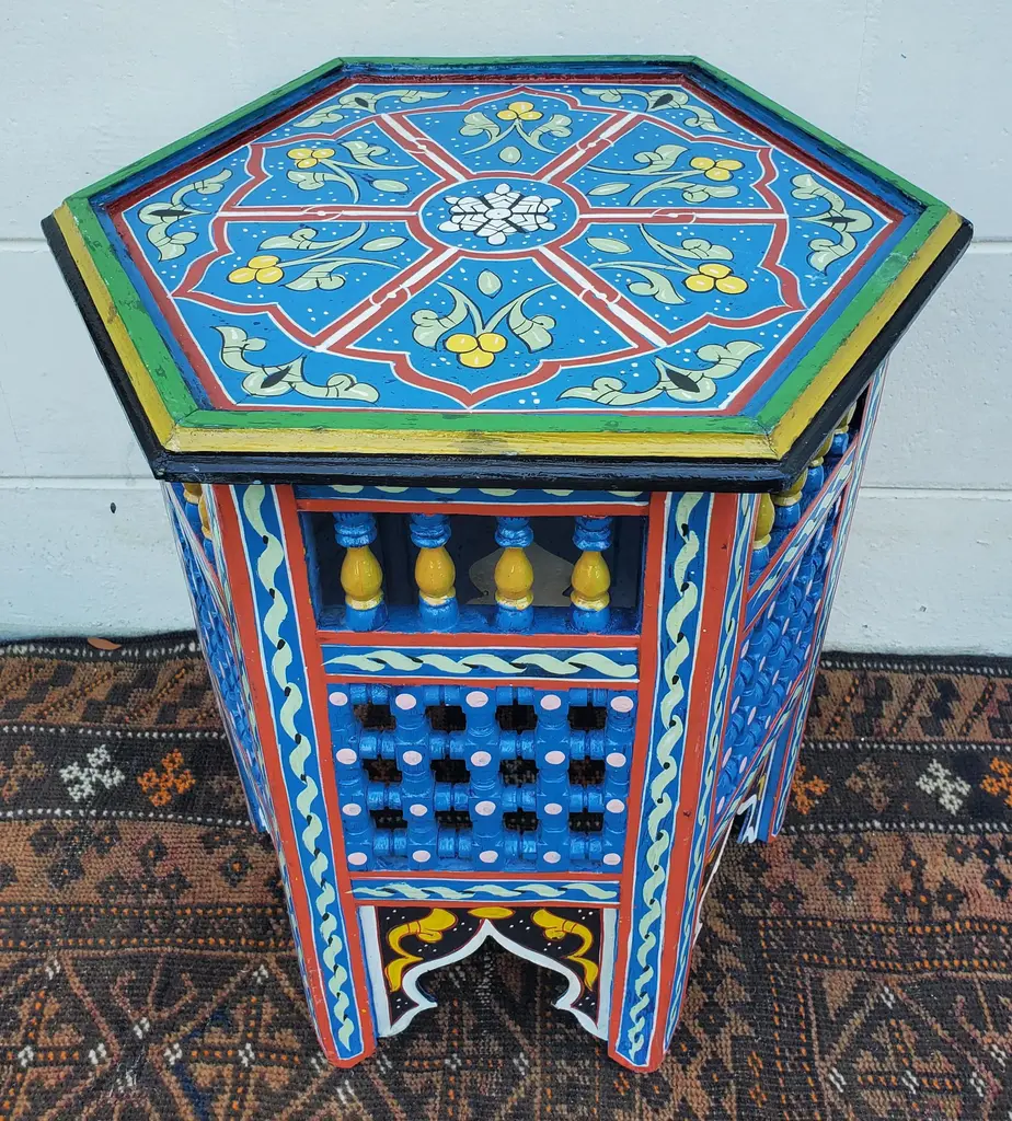 This is a 100% hand painted and hand carved Moroccan hexagonal shape side table or end table. Great handcraftsmanship throughout, featuring the famous Moroccan Musharrabia woodwork. Beautiful add-on to your home or office decor. This table measures approximately 20" in height, 15.5" from side to side, and 18" from corner to corner. Also available in many other colors.