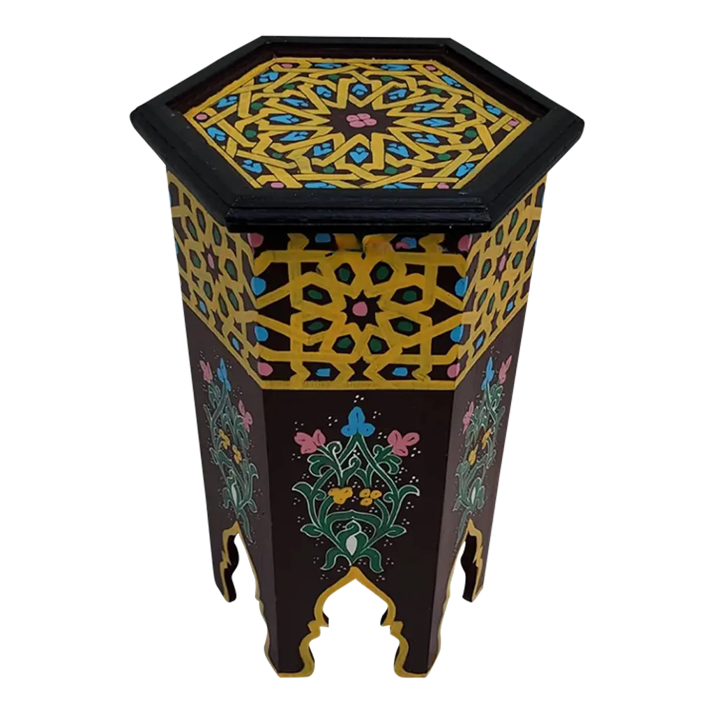 This is a 100% hand painted and hand carved Moroccan Octagonal shape side table or end table. Great handcraftsmanship throughout, featuring the famous Moroccan Zouak woodwork. Beautiful add-on to your home or office decor. This table measures approximately 19" in height, 15" from corner to corner. Also available in many other colors
