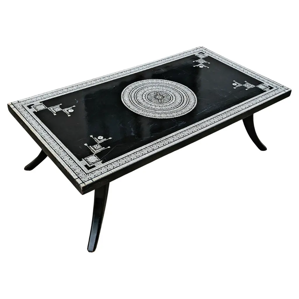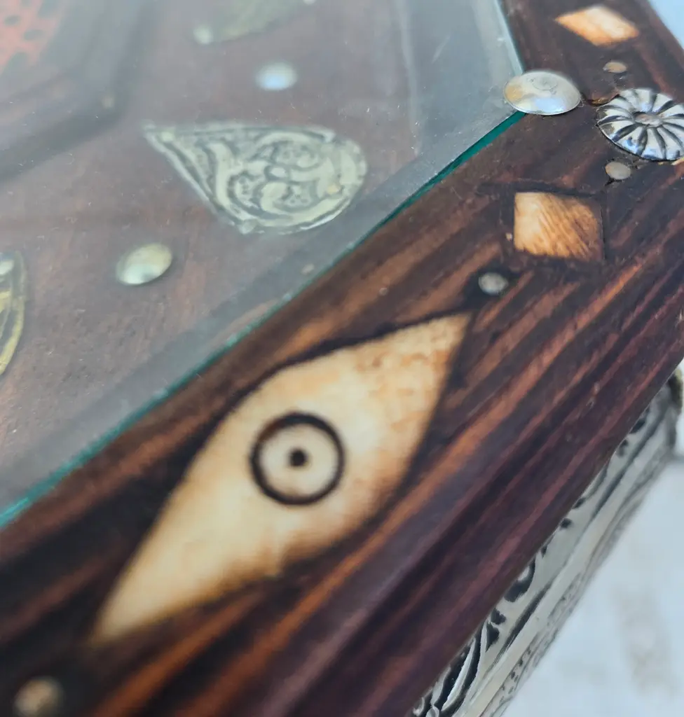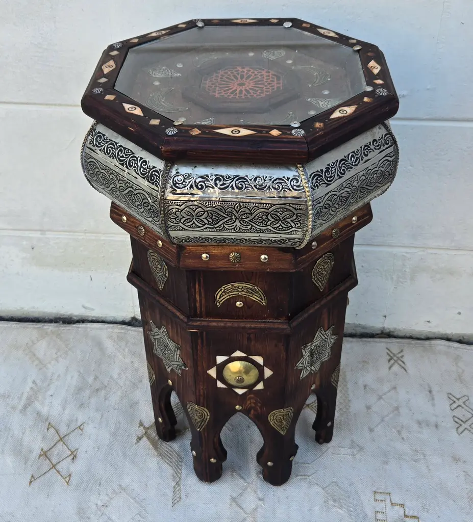 Very exotic octagonal metal inlaid Moroccan side table. With its detailed carving along the sides and the top, this side table will sure be a excellent add-on to your décor. Adorned with resin fragments. It measures approximately 20” in height and 13.5" from side to side. Glass top is added for a better look.