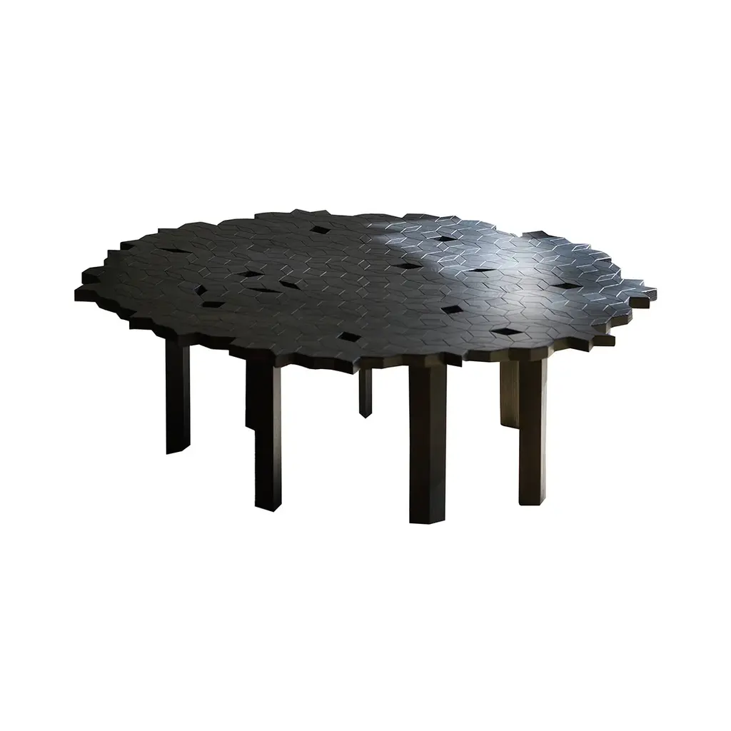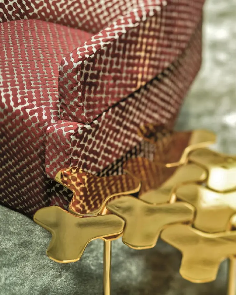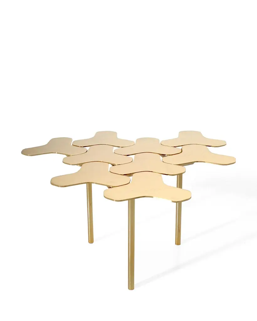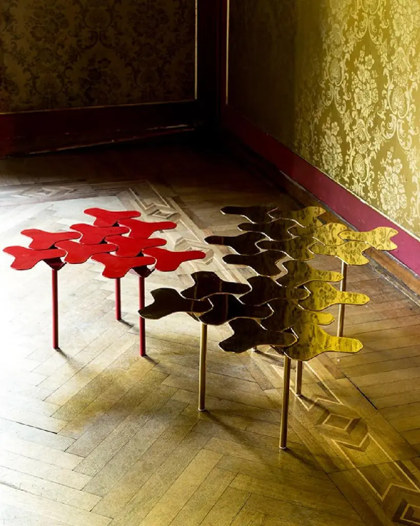It reflects a study of the passage from two to three dimensions based on observing the tanning of a quadruped’s hide. This taut skin evokes memories of the animal it once was. The same skin, pleated, gives us the three-dimensionality of a chair or armchair. The structure is a hexagonal network inspired by molecular geometry or a snowflake. The natural form of a skin for the chair’s upholstery. The rigorous geometry of Nature for its structure. Like the Inuit peoples who wear animal skins for protection, Nanook’s technical-fabric upholstery has tribal echoes. The pleated, three-dimensional skin is transformed into a contemporary object through the use of digital printing for the upholstery, and moulded synthetic material for the structure. Nanook seating – whose name derives from the protagonist of the first nature documentary in film history – preserves tribal memories while looking to the future and to technology with the same optimism with which Nanook observed his icy environment.”Top is sheet steel, legs are tubular steel with powder coat finish or polished gold chrome finish.Available in different options:Finish:• BLACK• WHITE CHALK• STARDUST• ROSE GOLDDIMENSIONS:W. 60 x D. 63 x H. 34 cm