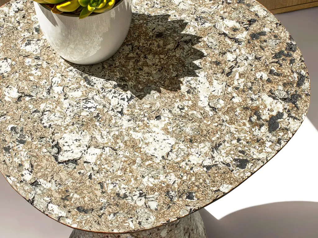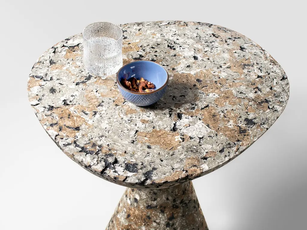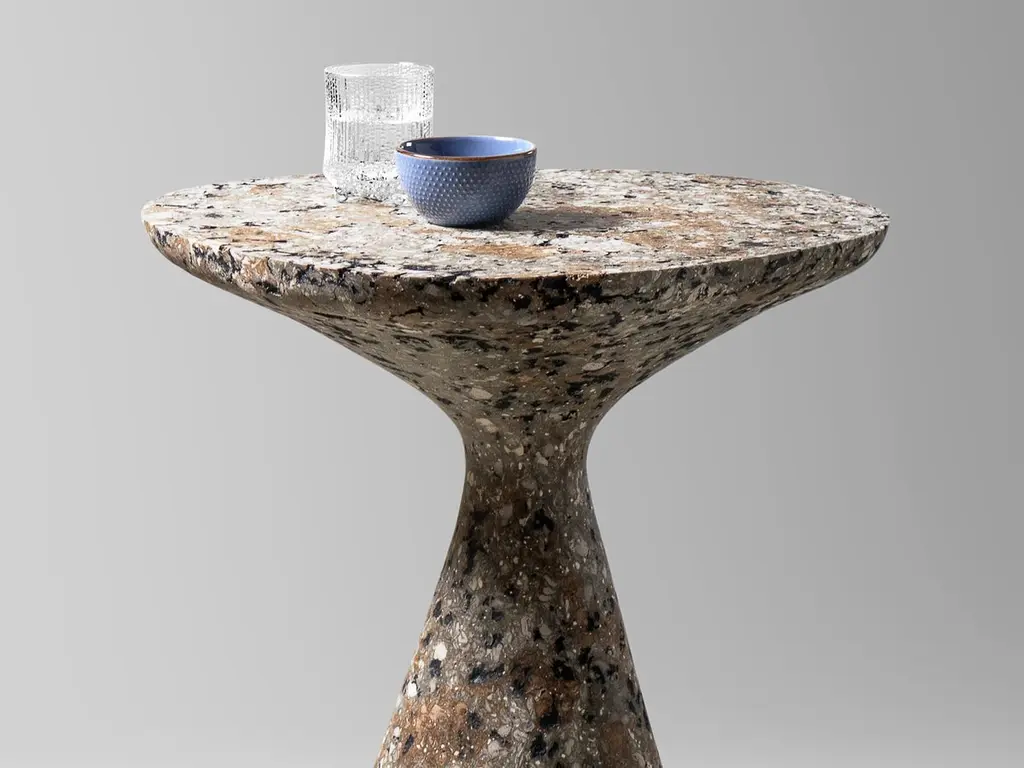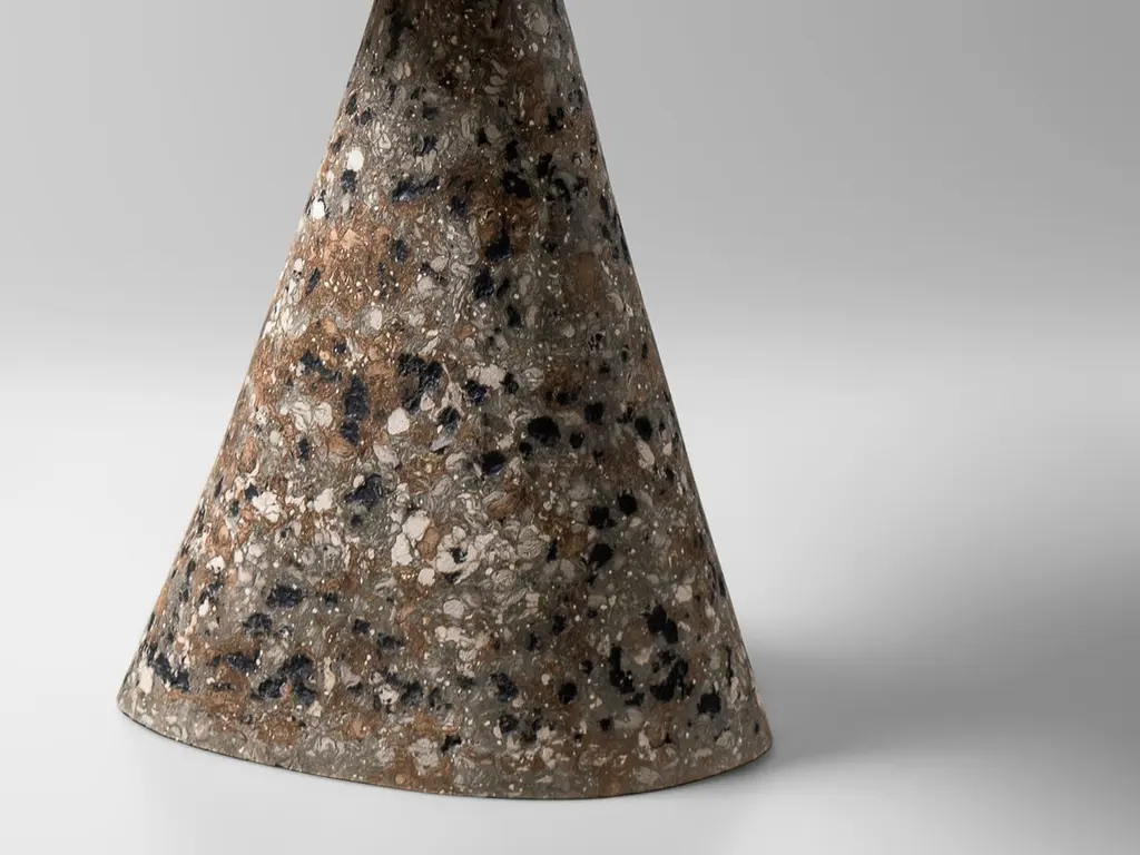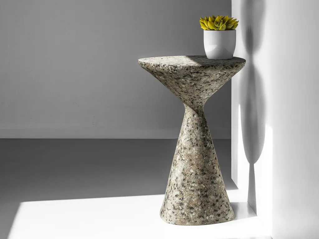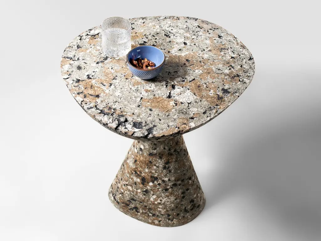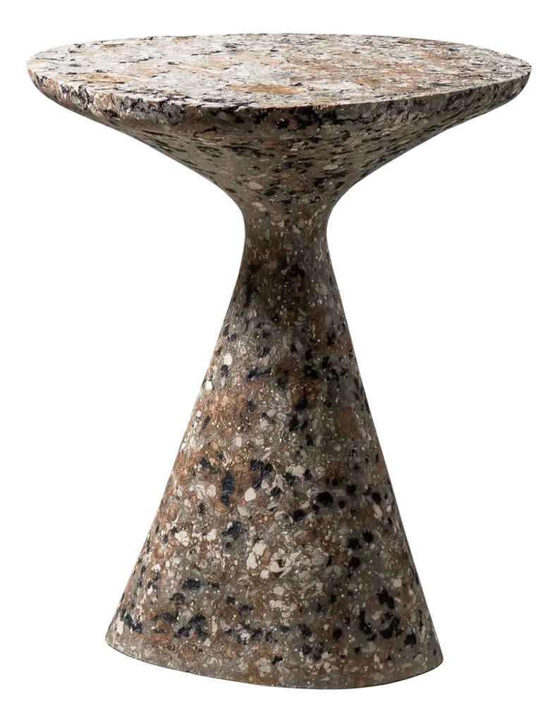 Mottled Side Table by Donatas ZukauskasDimensions: Ø 46 x H 61 cm.Materials: Concrete, recycled cardboard, glue, and paint.The fusion of sturdiness and elegance, along with the blend of archaism and modernity. More than just a surface for placing objects, these tables are functional pieces of art that effortlessly become focal points within any room.Cardboard as the main component may come as a surprise, as paper isgenerally perceived as delicate. However, through careful experimentation and integration of other materials: cement, glue, paint, the resulting mixture acquires the desired properties of wood. The material acquires a natural texture and strength, ensuring its durability and longevity.The resulting material not only imitates the strength of wood, but also has a natural texture reminiscent of its organic counterpart. This texture adds a tactile dimension to the tables and provides a sensory experience that combines visual appeal with pleasant touch.This material does not change color over time and is not afraid of moisture, dust can be wiped with a damp cloth.The side table is available in two colors: black or variegated.Donatas ŽukauskasHello, my name is Donatas Žukauskas, I am an interior designer. I have graduated Vilnius Academy of Fine Arts and for more then 15 years I have been designing the interiors. Since I can remember myself I have always been interested in the art and this is the reason I have always tried to decorate interiors with art works. I strongly believe, a perfect interior cannot be without art!This concept used to get difficulties because could not find necessary objects for interior like stylish tables, lamps, lanterns, vases, sculptures. This gave an idea to create some arts by myself. Exceptional hand-made details for the home, cafe, and hotel spaces provide expressiveness and manners.My works are exposed in different countries of the world. Recently 50 lanterns went to Sheraton’s restaurant at Doha, Qatar.