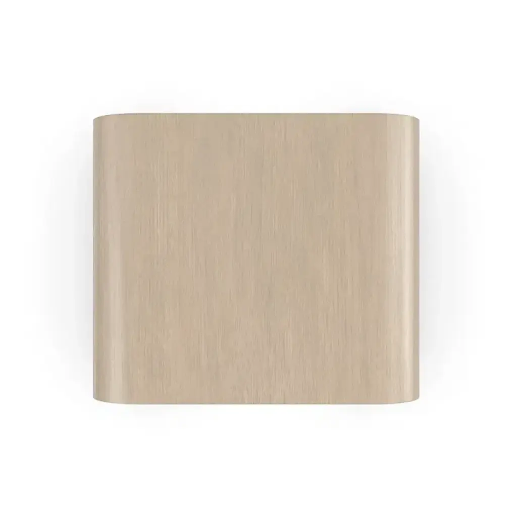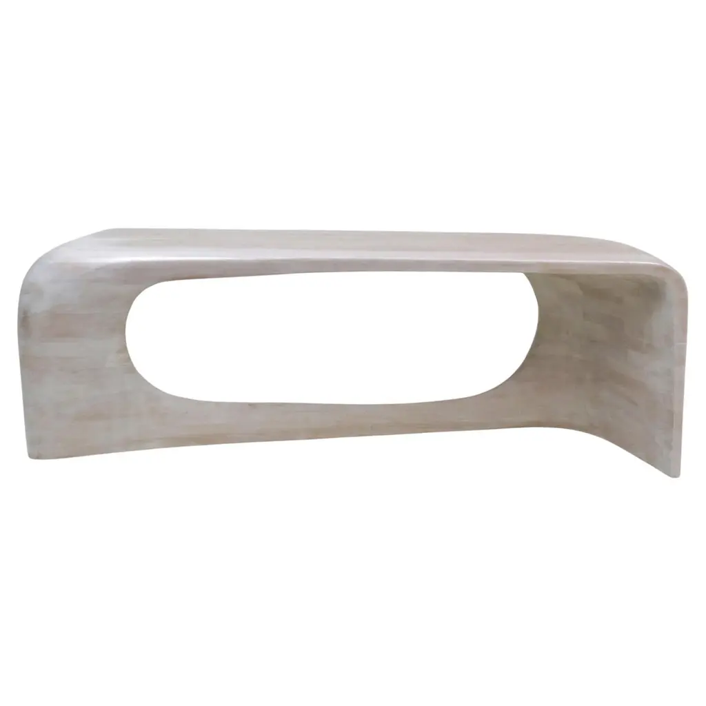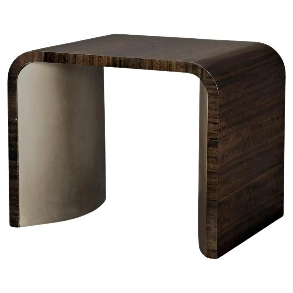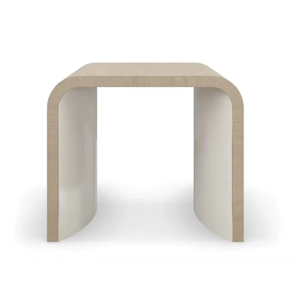 Sleek in its simplicity, this end table evokes a sense of calm and organic fluidity. Crafted in Sun Drenched Oak, its ample top gracefully waterfalls over either side. Semi-circular legs are finished in Textured Adobe for added tactile appeal and subtle contrast. Style in pairs to create movement and soften clean modern lines.