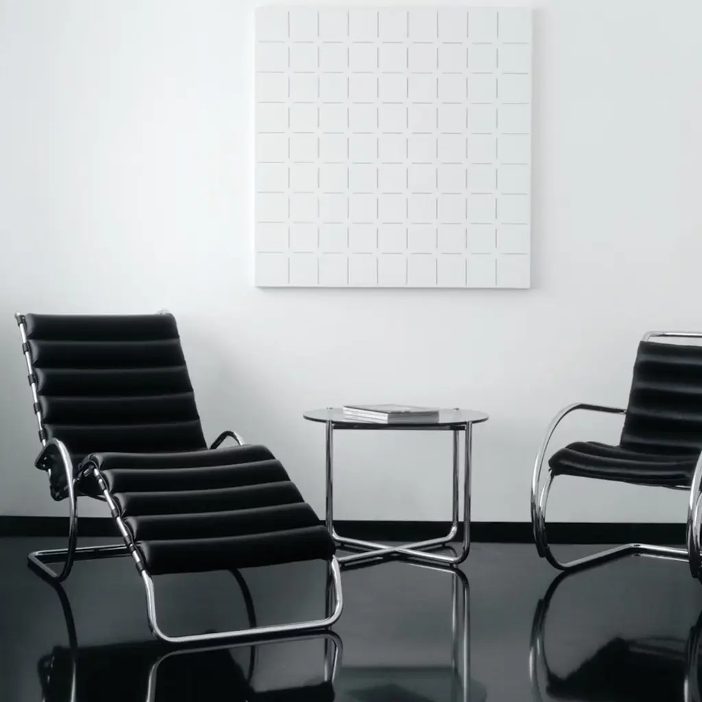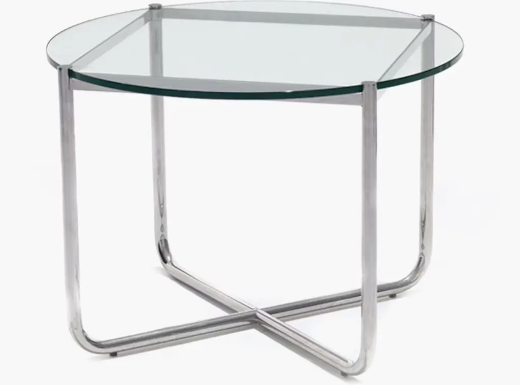The MR Collection (1927) represents some of the earliest steel furniture designs by Mies van der Rohe. Four models of this table were included in his renowned design for Villa Tugendhat. The table consists of a thick polished glass top mounted on a tubular steel base. Made in Italy.