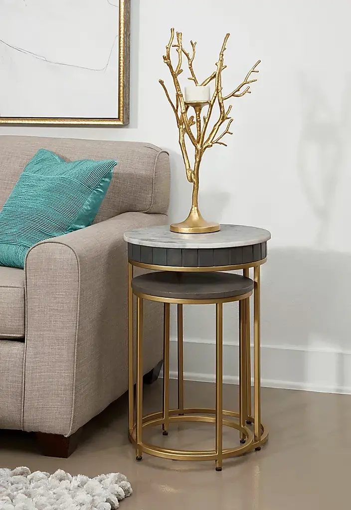 Bring contemporary charm to your home with this Mulga two-piece nesting table set. Each of the round tables feature clean lines and elegance with their gold powder coated iron bases. The larger table features a white marble top with natural gray veining that is highlighted by the contrasting dark gray mango wood top of the smaller table. Keep stacked together or stage separately to create the perfect scene. Customer assembly is required.