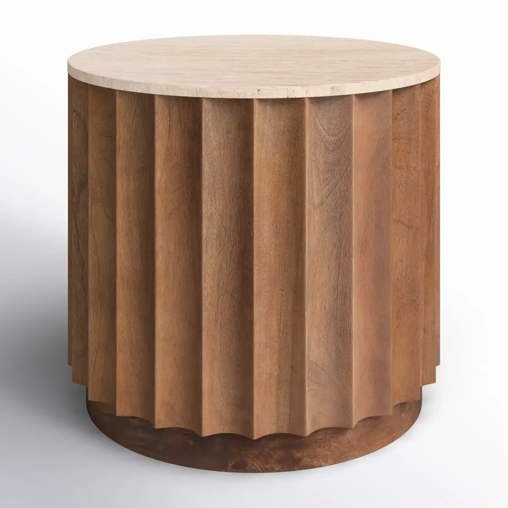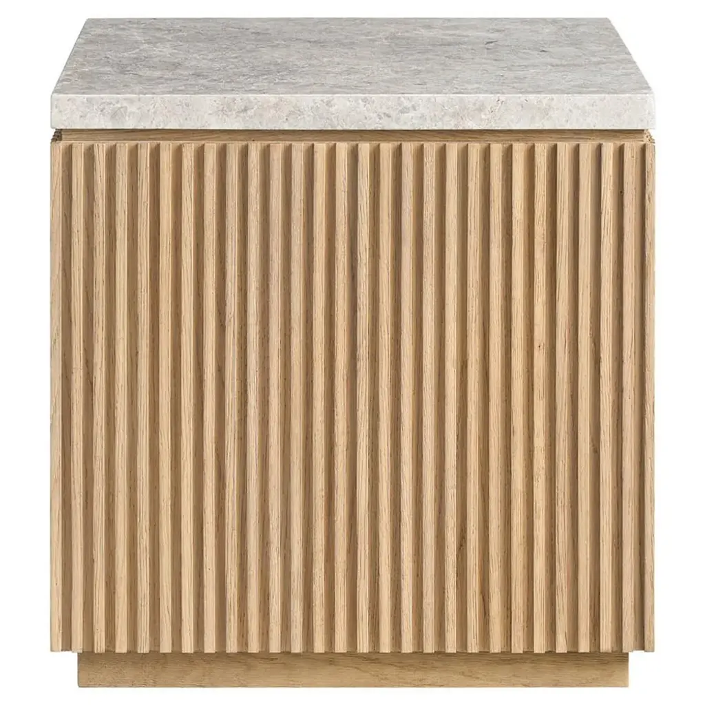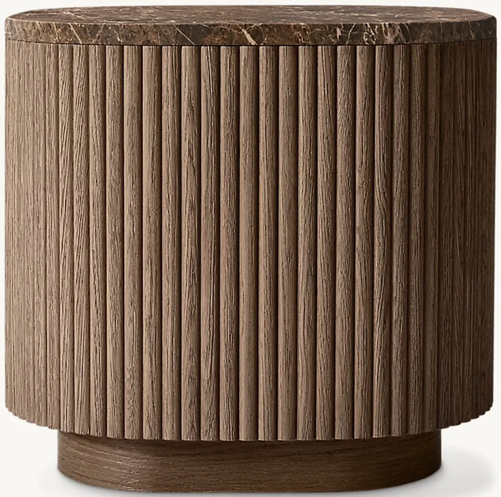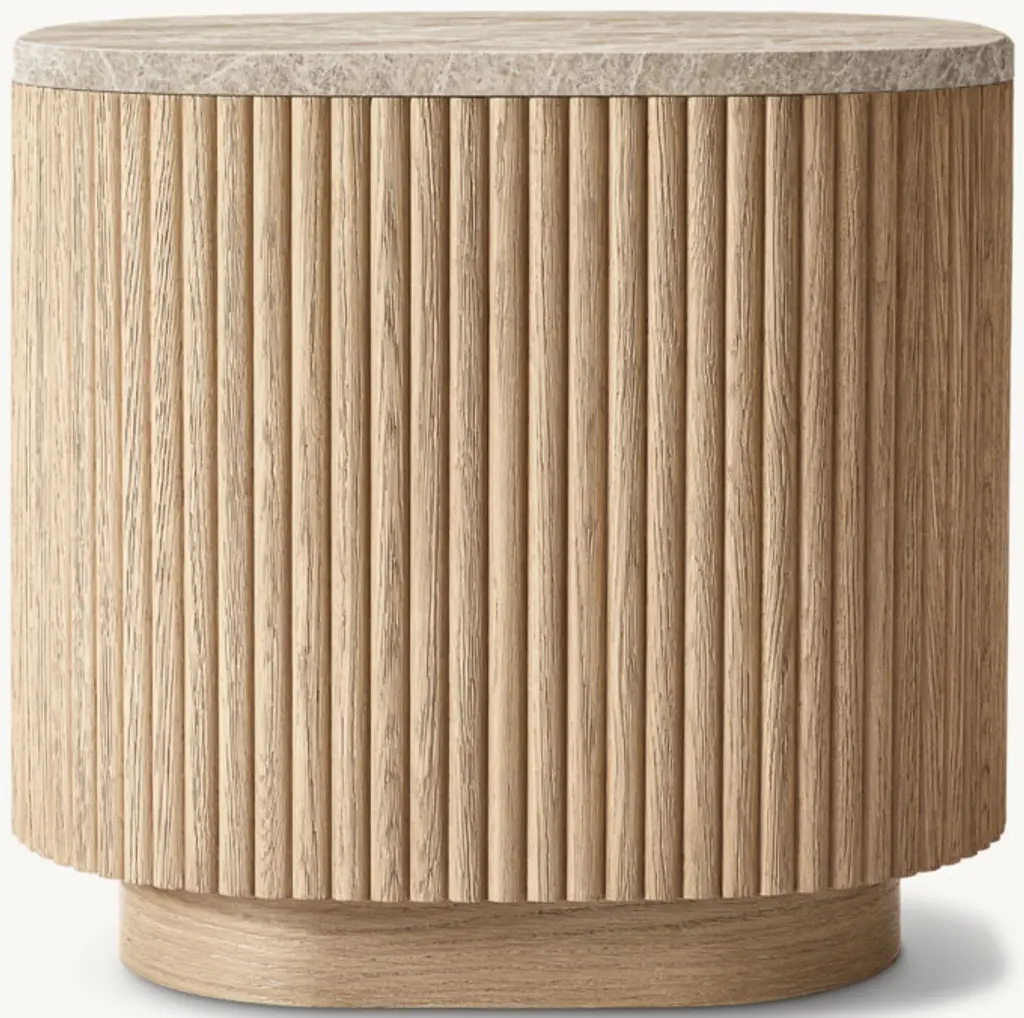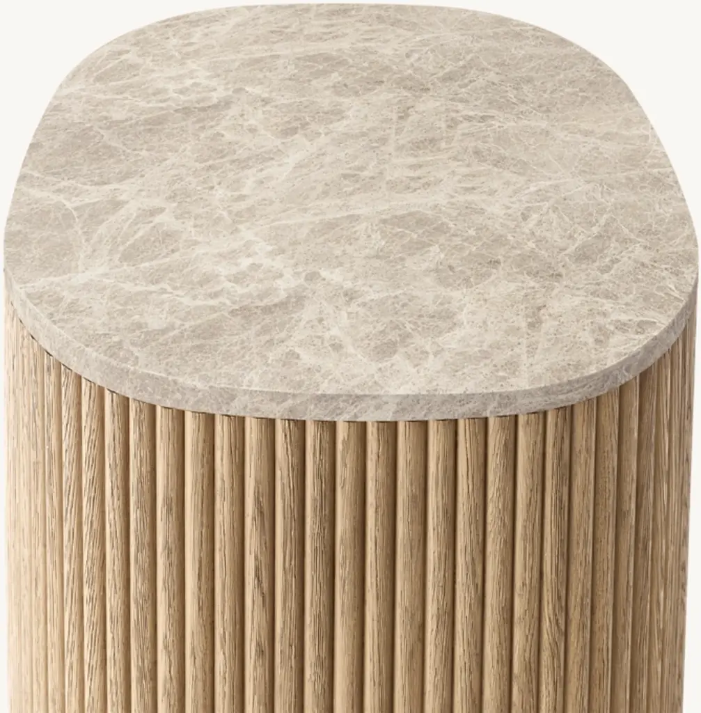 Defined by individually applied reeds of wire-brushed solid American white oak, Mulholland is the creation of celebrated design team Thomas Bina and Ronald Sasson. The collection features radius corners that curve around the side for an uninterrupted, fluid silhouette. Crafted of Emperador marble, the top is replete with rich veining and striking color contrasts that make each piece unique. SHOP THE ENTIRE COLLECTIONEXPLORE ALL REEDED COLLECTIONS