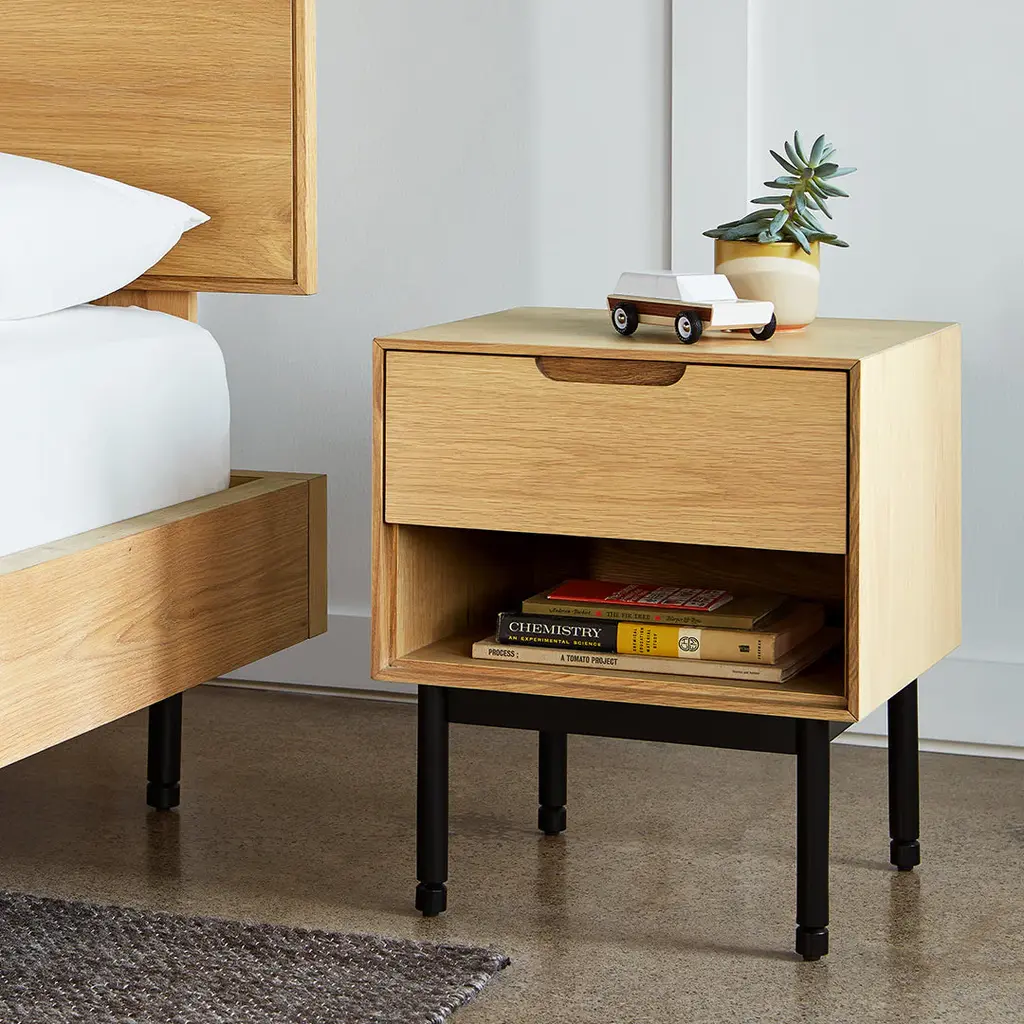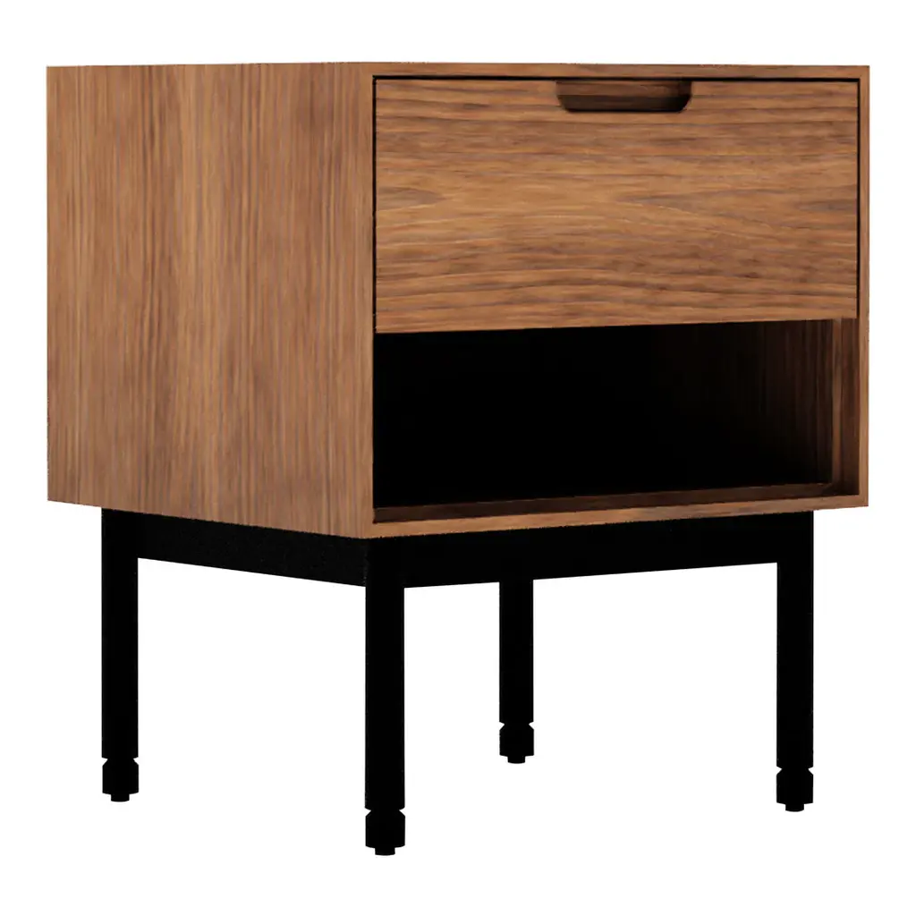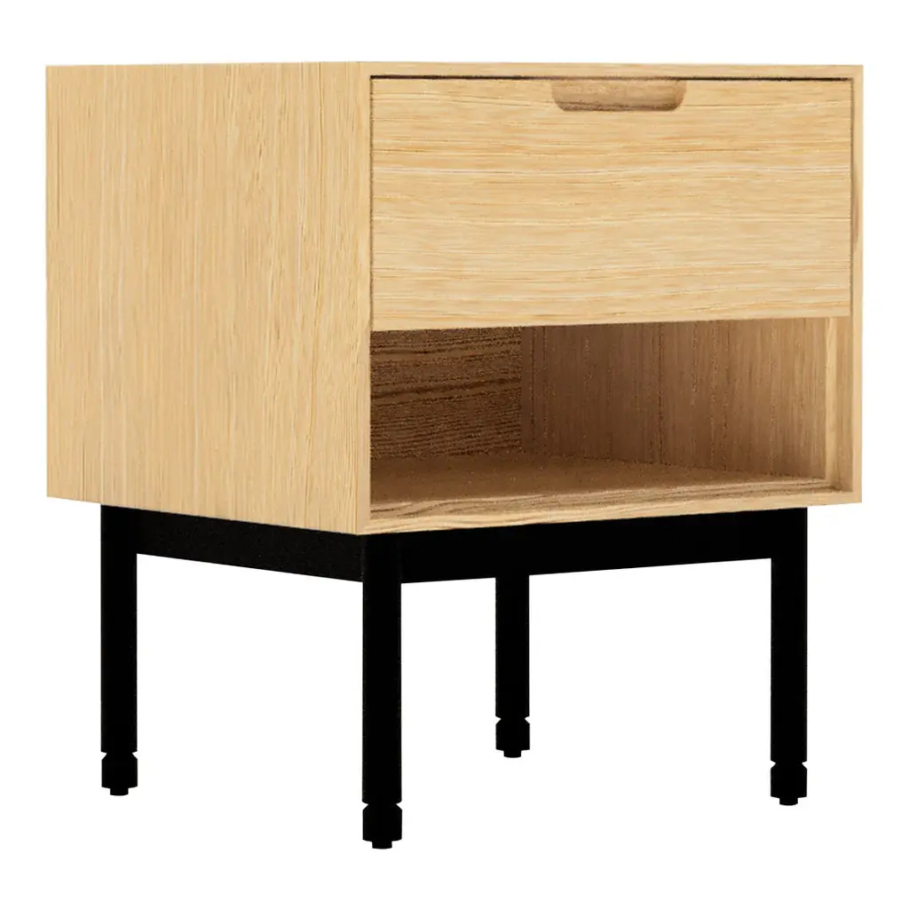 We envisioned our new Munro Collection for those who like to keep things simple. Considered proportions along with bespoke details like soft-close drawers and recessed pulls lend to designs that shine – day or night. The Munro End Table can be used as a bedside table or a living room accent. It features plenty of storage space to keep clutter neatly stowed away, with both a drawer and an open shelf for books or magazines. Choose from Walnut or Oak, each with a Zero-VOC, hand-rubbed matte finish, thoughtfully chosen to highlight the unique, organic beauty of the wood grain. Solid wood edge details and solid steel legs mean that these designs are built to last – a good thing because Munro’s classic, minimalist ethos will never go out of style.DetailsMain structure is constructed with engineered wood core for strength and stability, surface faced with thick, real wood Oak or Walnut Veneer.Soft close drawers feature recessed finger pulls and solid wood detailing on top edge.Soft close doors, magnetic closures, recessed finger pulls and adjustable hinge hardware.Open cubby for storage and display of books and other miscellaneous items.Each piece is finished in Rubio Monocoat - a durable, matte, oil-based protector designed to highlight the beauty of natural wood.Wood finish is certified 0% VOC and is an all-natural, environmentally friendly product.Power-coated black steel legs.Non-marking leveler feet can be adjusted for stability on uneven floor surfaces. Hardware provided.CARB (California Air Resources Board) Phase II compliant.Wood is a natural material, with variations in grain pattern and colour that make each design unique.Product colours may vary slightly from those shown on your display.