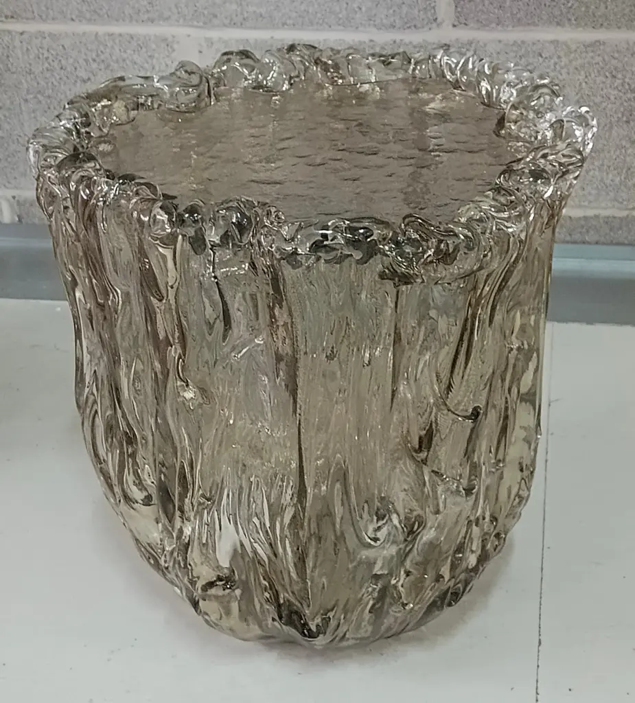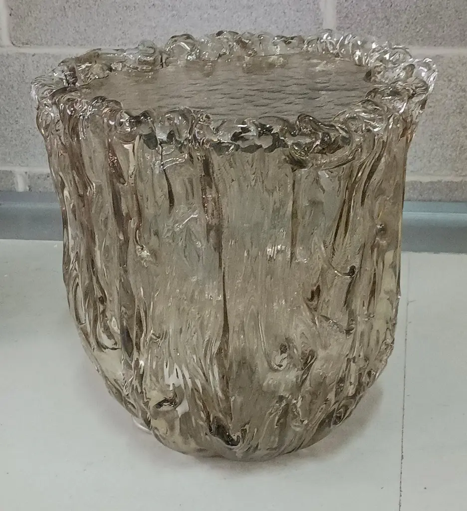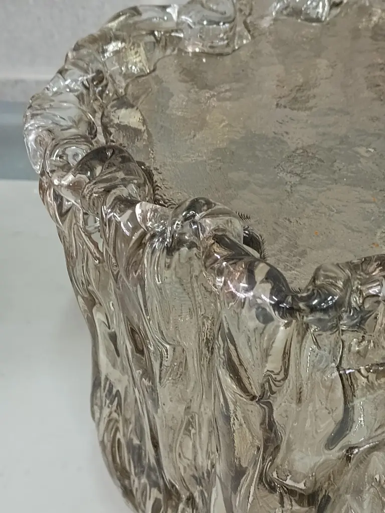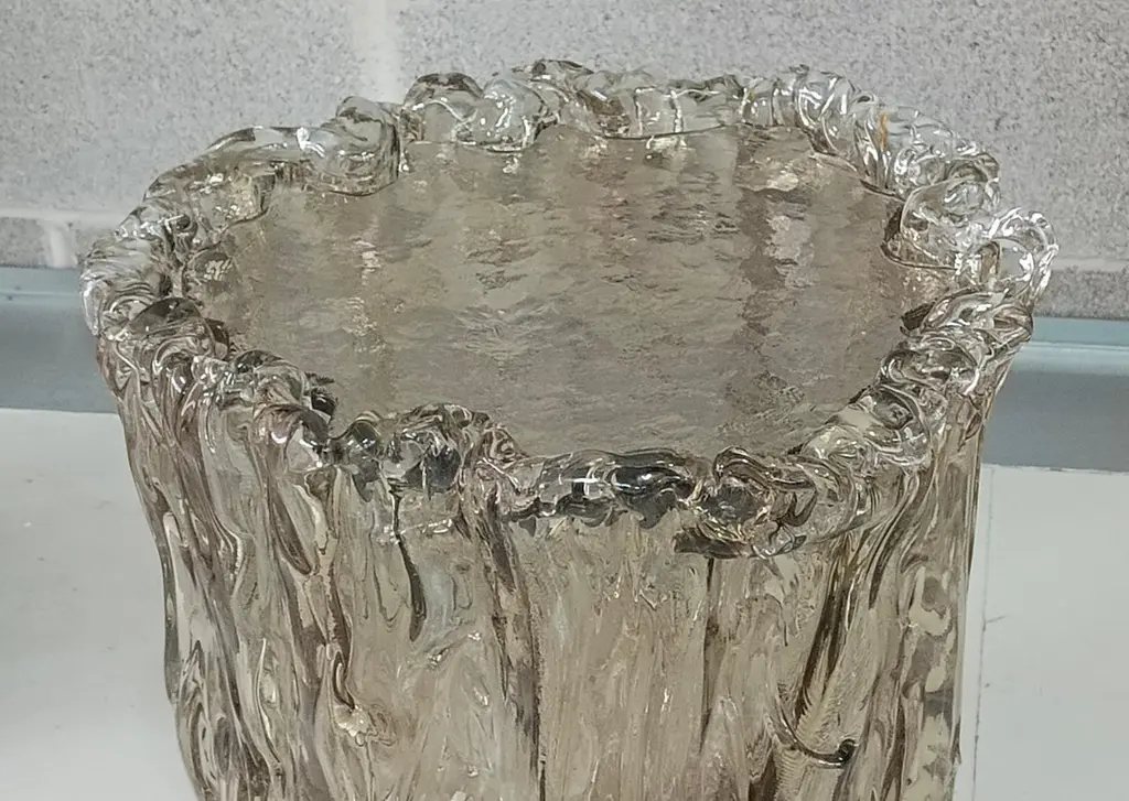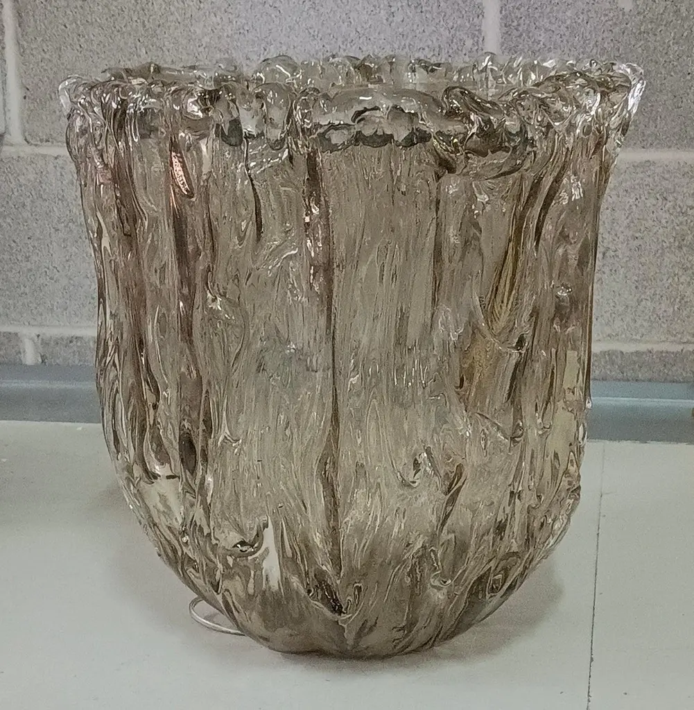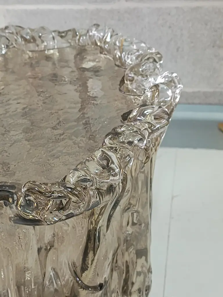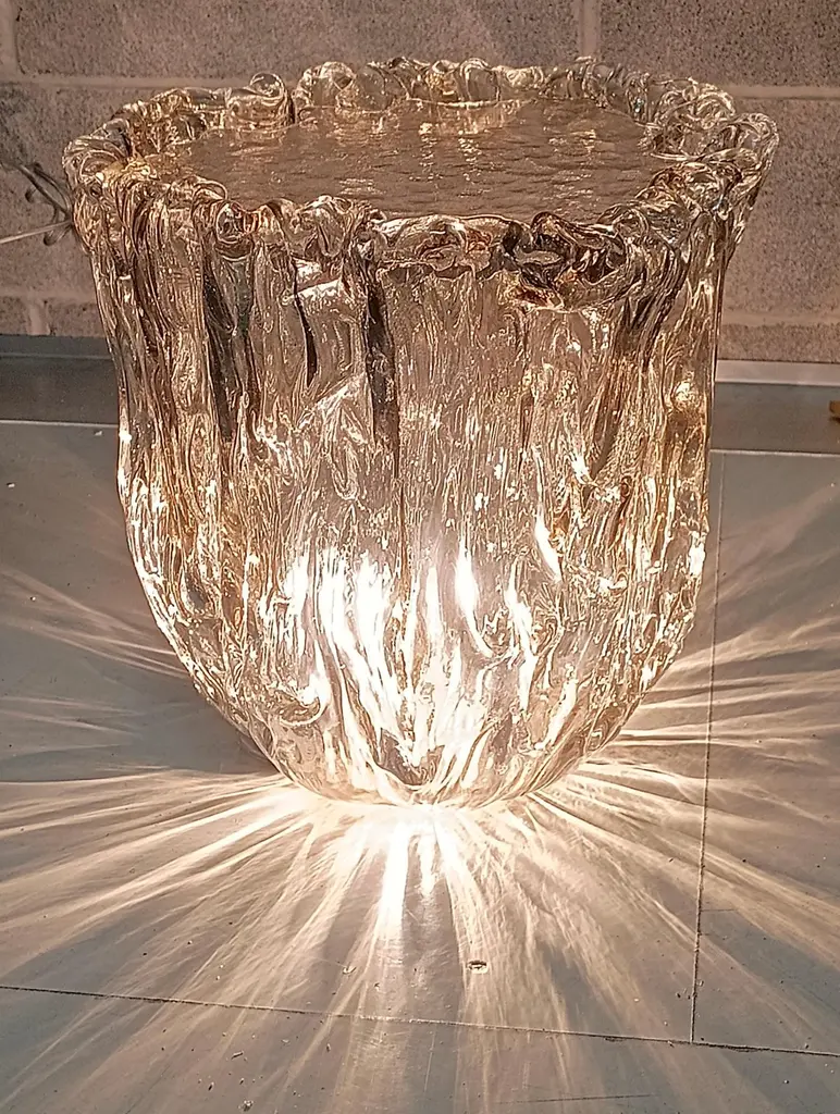 Very particular Murano glass side table with an exciting amber color, with a very original design, a real Murano glass sculpture.The coffee table is made up of a large vase-shaped base in Murano glass, and a disc also in Murano glass which is placed and forms the top, taking the shape of the perimeter of the vase. The table has a very thick glass thickness almost to be a "submerged" glass. Its color is very beautiful, a very amber color. Internally there is a light bulb that transforms the table into a floor lamp, wanting to give a softer light to the room where it is positioned. Like a refined and stylish sculpture it will blend into your home.