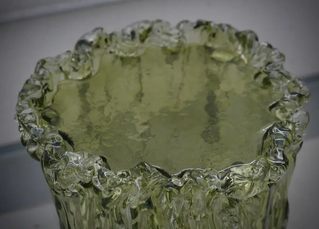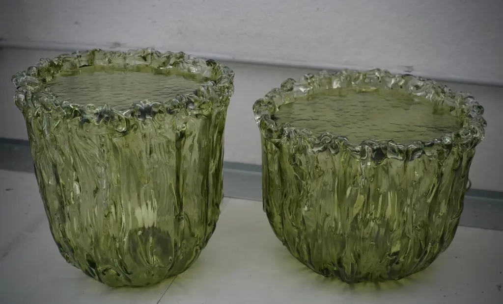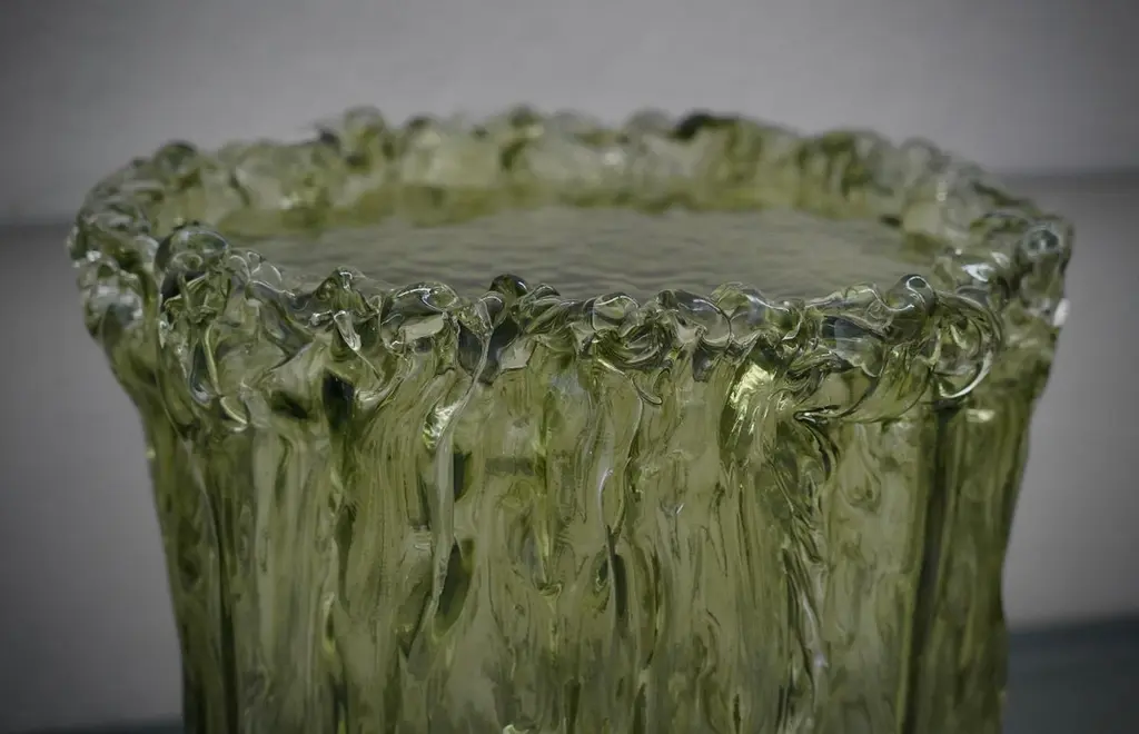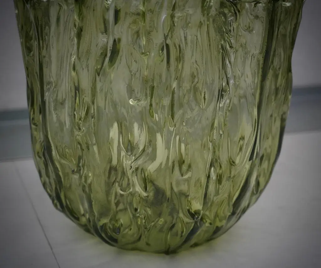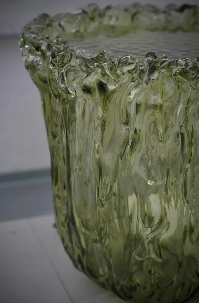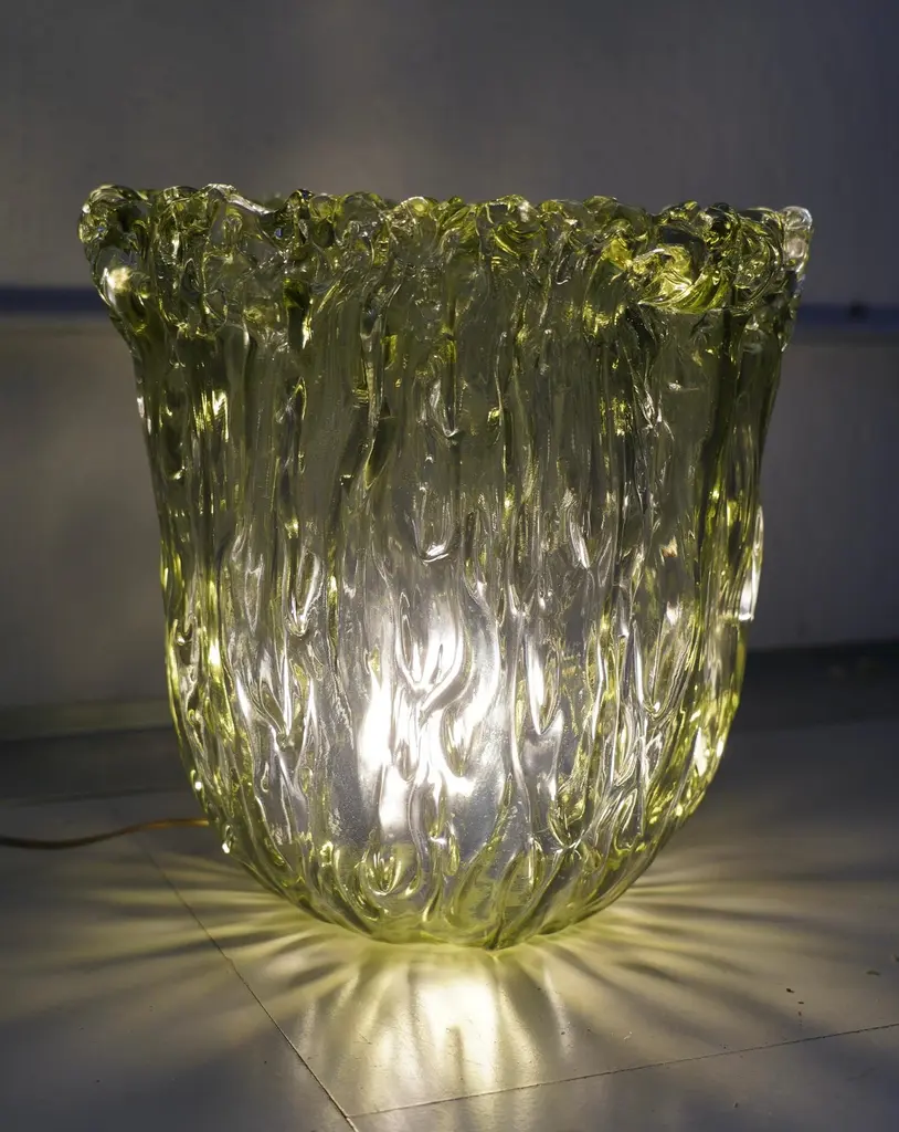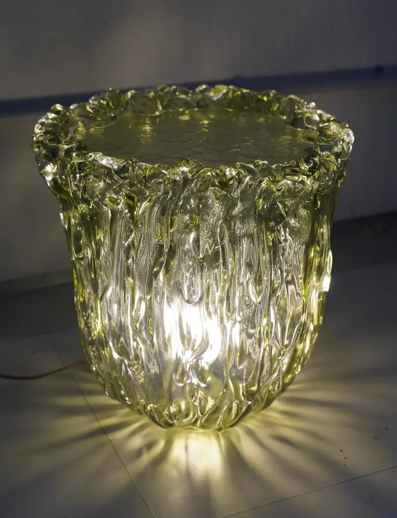 Very special Murano glass coffee table, in an exciting shade of green, with a very original design, a real Murano glass sculpture.The coffee table is composed of a large base in the shape of a Murano glass vase and an overlying disk that closes it, also in Murano glass, which rests and forms the top, taking up the jagged shape of the perimeter of the vase. The coffee table has a very high thickness of glass, almost like a "submerged" glass. Its color is very beautiful, an intense olive green; note the processing of the Murano glass looks like a section of a cut tree trunk. Inside there is a light bulb that transforms the coffee table into a floor lamp, wanting to give a softer light to the environment in which it is positioned. Like a refined and elegant sculpture, it will integrate perfectly into your home. Combined with LU952844519092.Wear consistent with age and use. Each item offered by the HannauRoma warehouse is checked by our team of craftsmen. We guarantee a very high quality standard, ask our design specialists for detailed information.