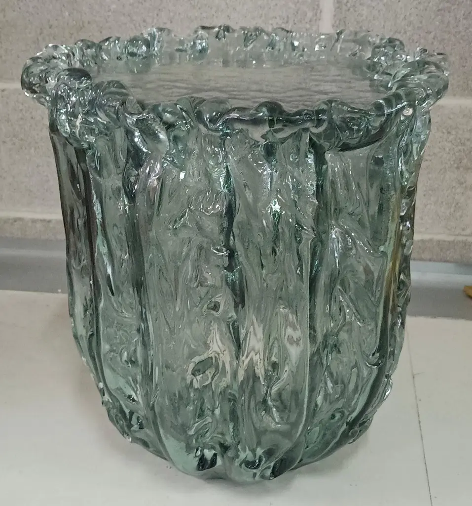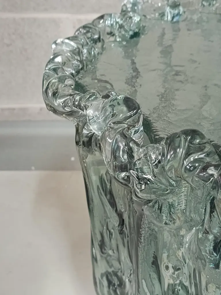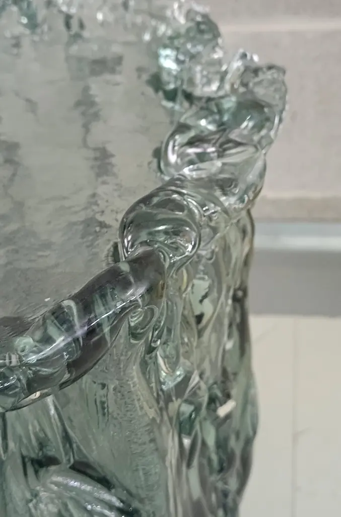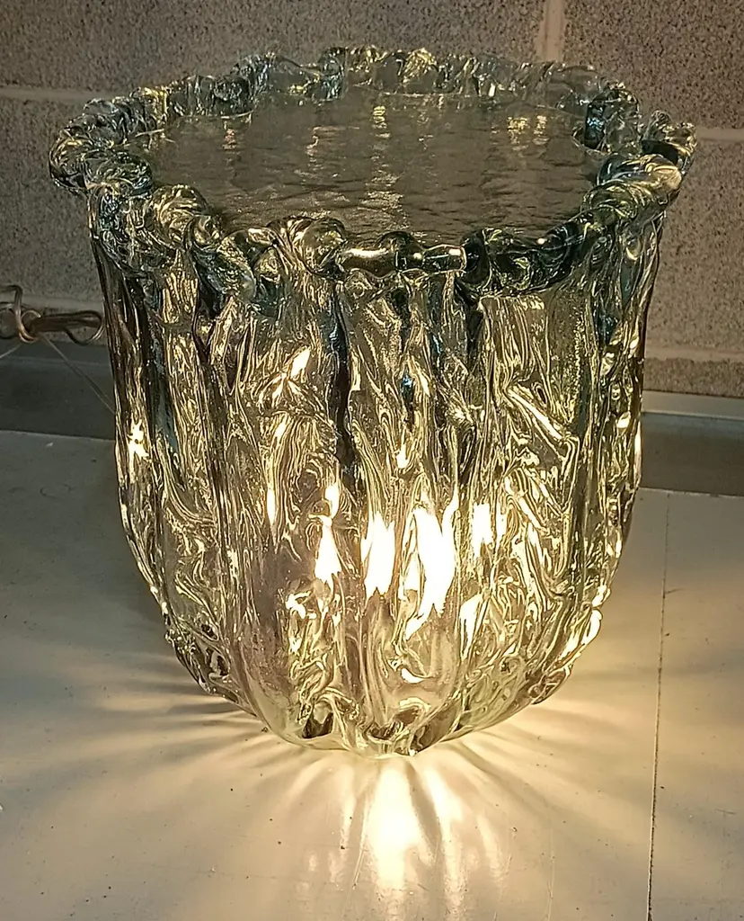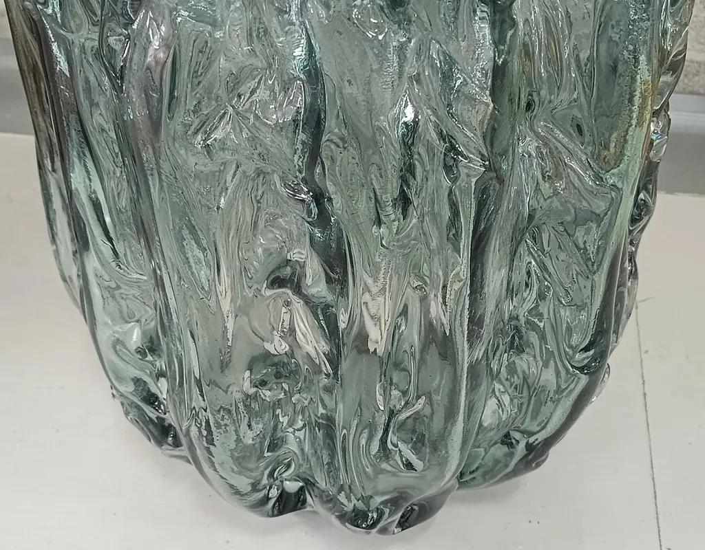Very particular Murano glass side table with an exciting teal color, with a very original design, a real Murano glass sculpture.The coffee table is made up of a large vase-shaped base in Murano glass, and a disc also in Murano glass which is placed and forms the top, taking the shape of the perimeter of the vase. The table has a very thick glass thickness almost to be a "submerged" glass. Its color is very beautiful, a very teal color. Internally there is a light bulb that transforms the table into a floor lamp, wanting to give a softer light to the room where it is positioned. Like a refined and stylish sculpture it will blend into your home.