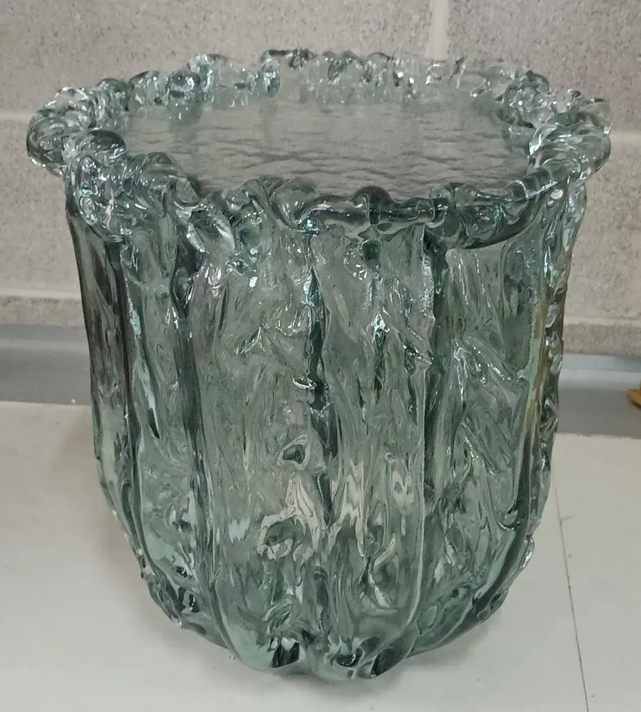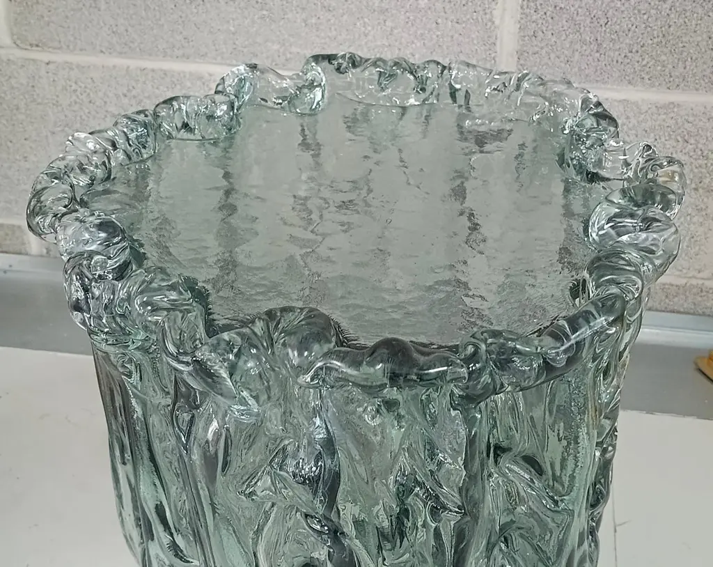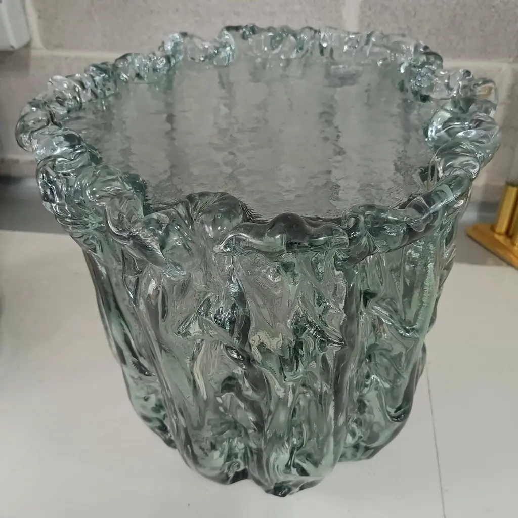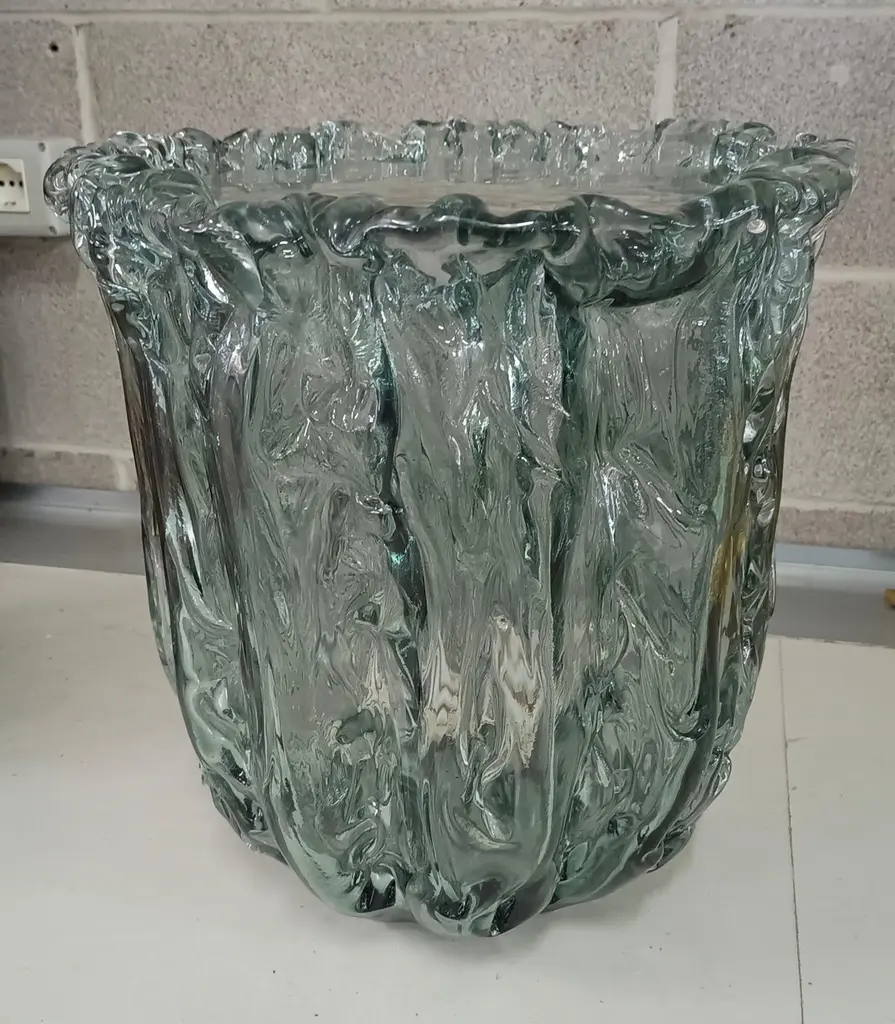 Very particular Murano glass side table with an exciting teal color, with a very original design, a real Murano glass sculpture.The coffee table is made up of a large vase-shaped base in Murano glass, and a disc also in Murano glass which is placed and forms the top, taking the shape of the perimeter of the vase. The table has a very thick glass thickness almost to be a "submerged" glass. Its color is very beautiful, a very teal color. Internally there is a light bulb that transforms the table into a floor lamp, wanting to give a softer light to the room where it is positioned. Like a refined and stylish sculpture it will blend into your home.