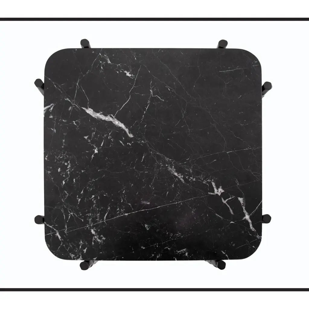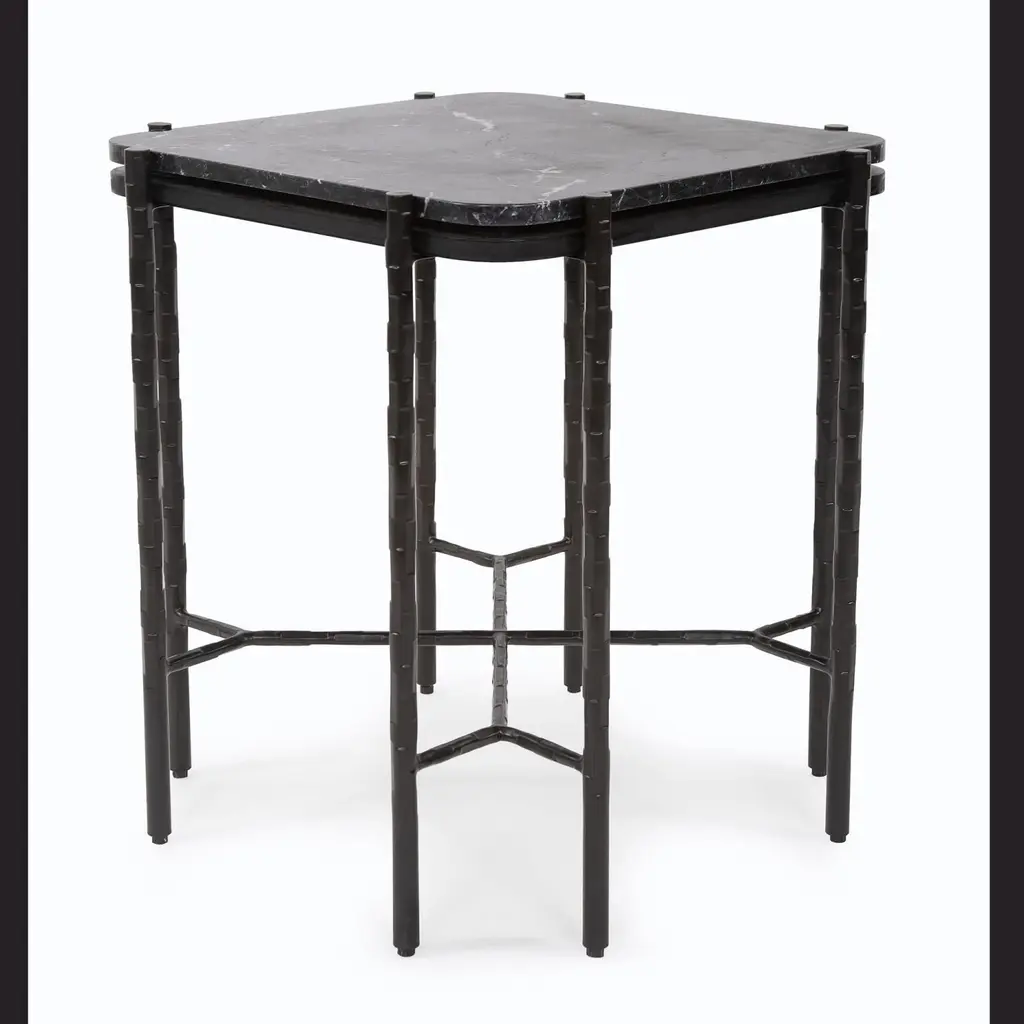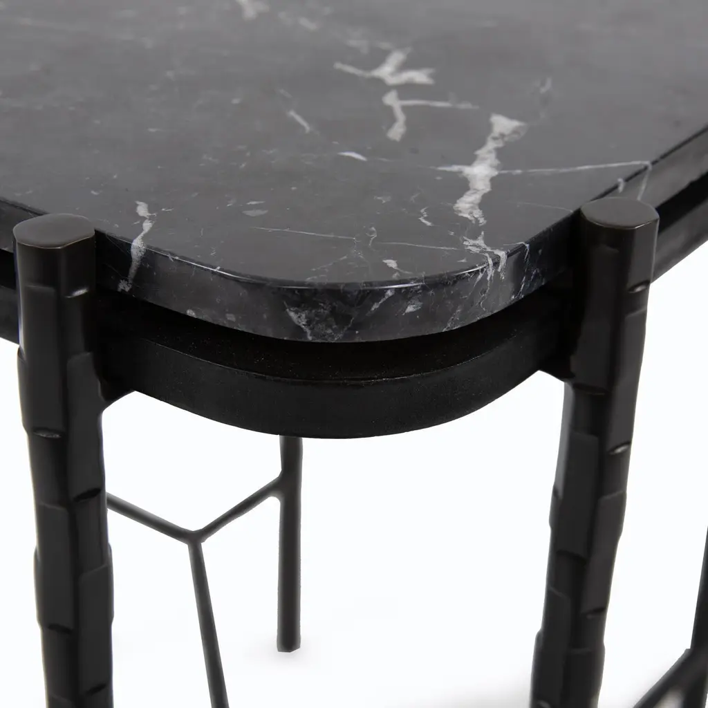 The modern architectural designs of Robert Myatt was the inspiration behind this collection of tables. Each table fame in matte black features a contemporary sculpted textural multiple legged design with criss crossed supports. To highlight the design of these tables we selected a beautiful black marble for the tops, that was hand carved and polished for each. The Myatt side table truly has a quality that makes it unique, alone or used in the complete collection.