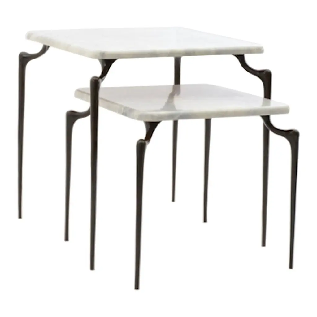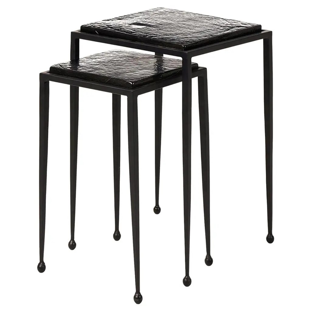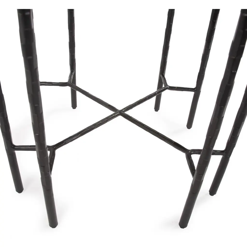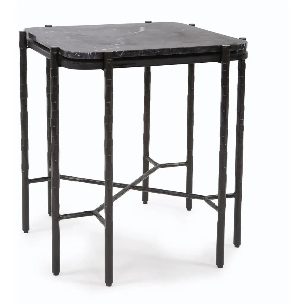 The modern architectural designs of Robert Myatt was the inspiration behind this collection of tables. Each table fame in matte black features a contemporary sculpted textural multiple legged design with criss crossed supports. To highlight the design of these tables we selected a beautiful black marble for the tops, that was hand carved and polished for each. The Myatt side table truly has a quality that makes it unique, alone or used in the complete collection.