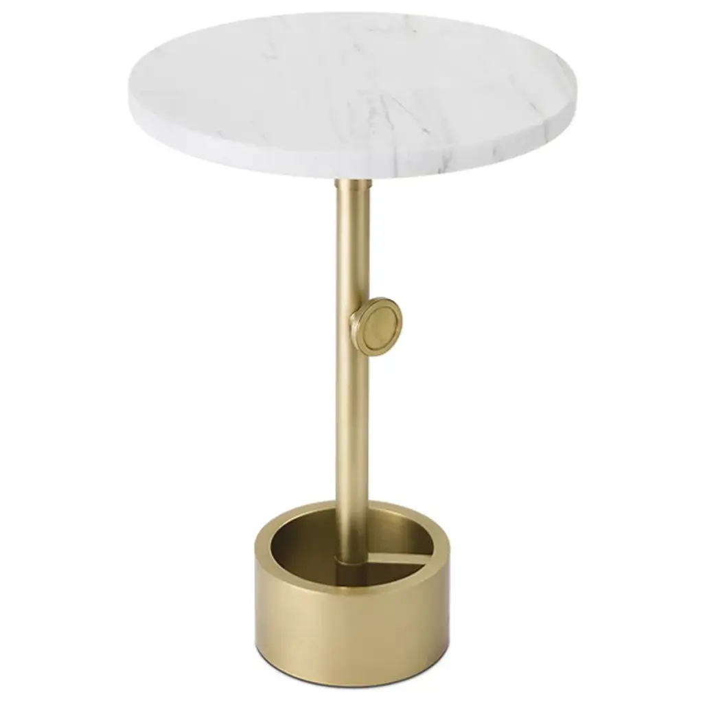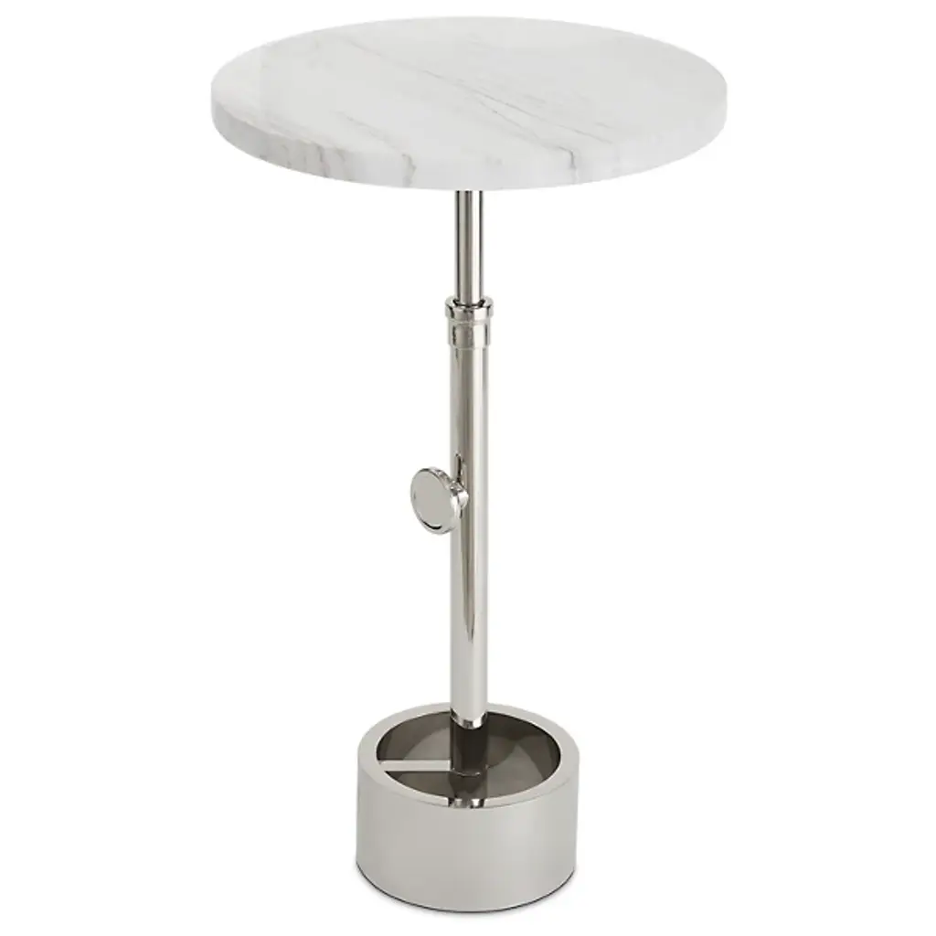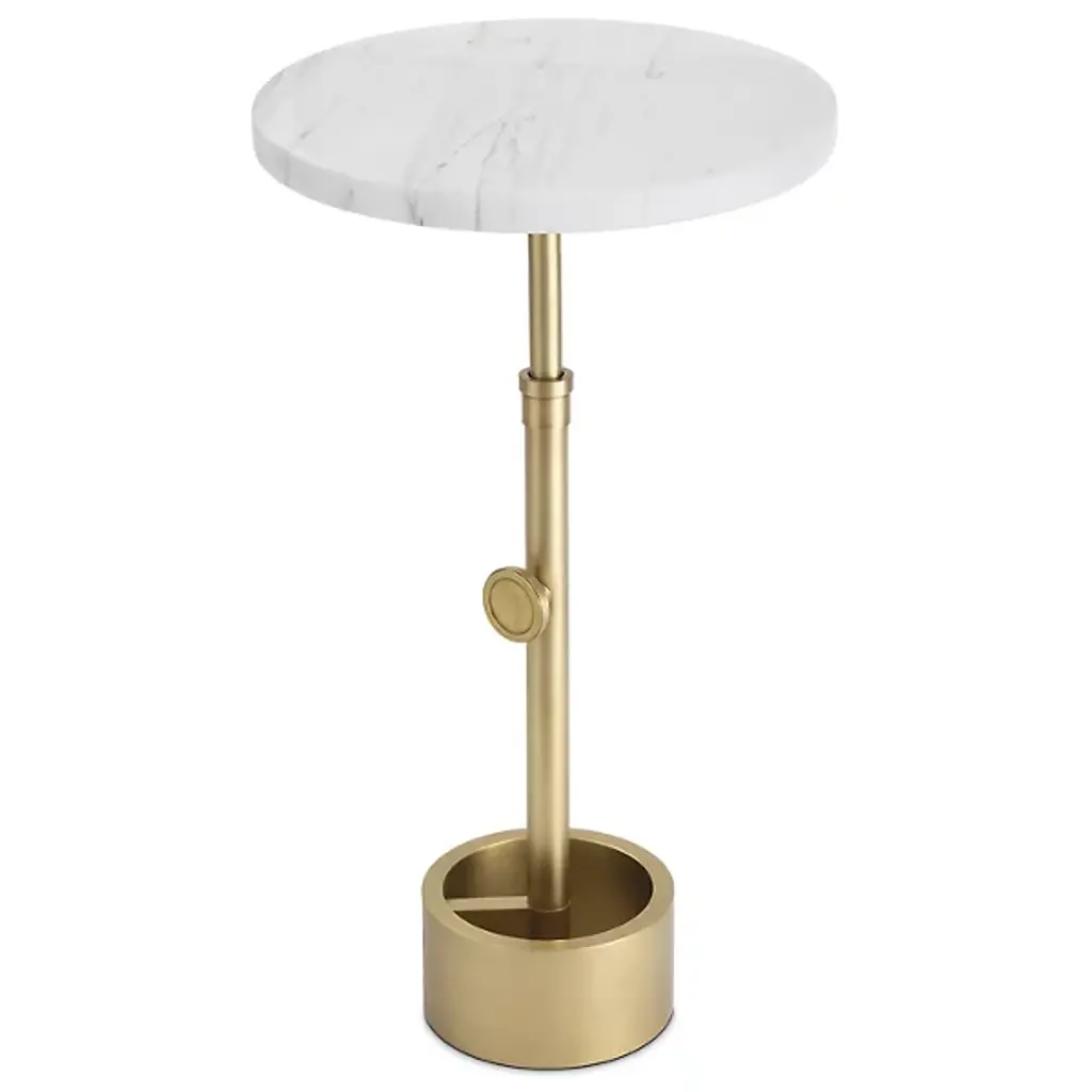 The Myles Accent Table from Regina Andrew pairs a circular marble top with an adjustable-height steel base that recalls vintage drafting equipment. The height mechanism allows you to customize the table for different uses, from laptop work to casual dining. It has a marble surface that provides a cool, smooth workspace and a steel pedestal base that takes up minimal floor space. The industrial-inspired base contrasts with the stone top, creating an interesting mix of materials and textures. This table adapts to your changing needs throughout the day, serving as both a work surface and an accent piece in your living space.
