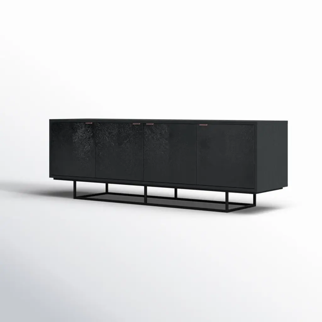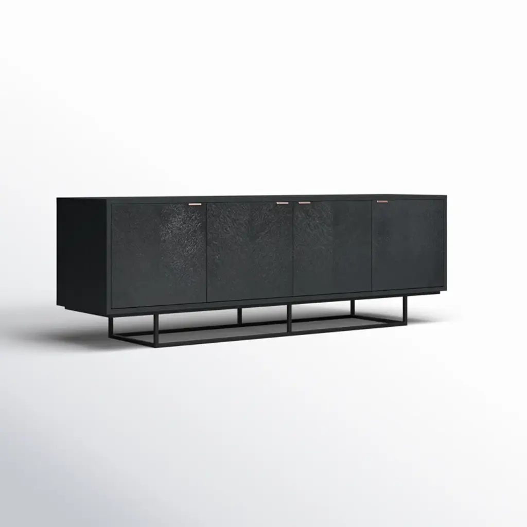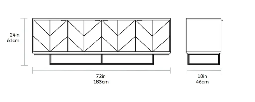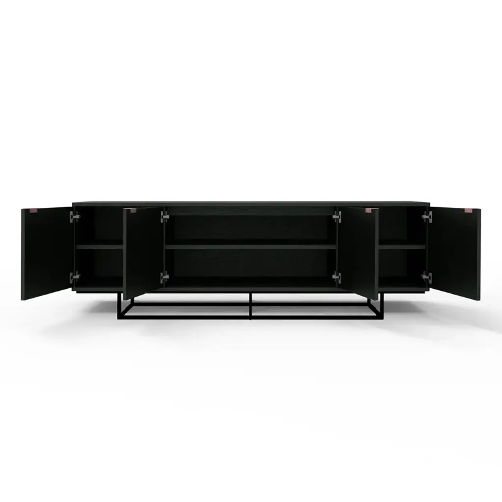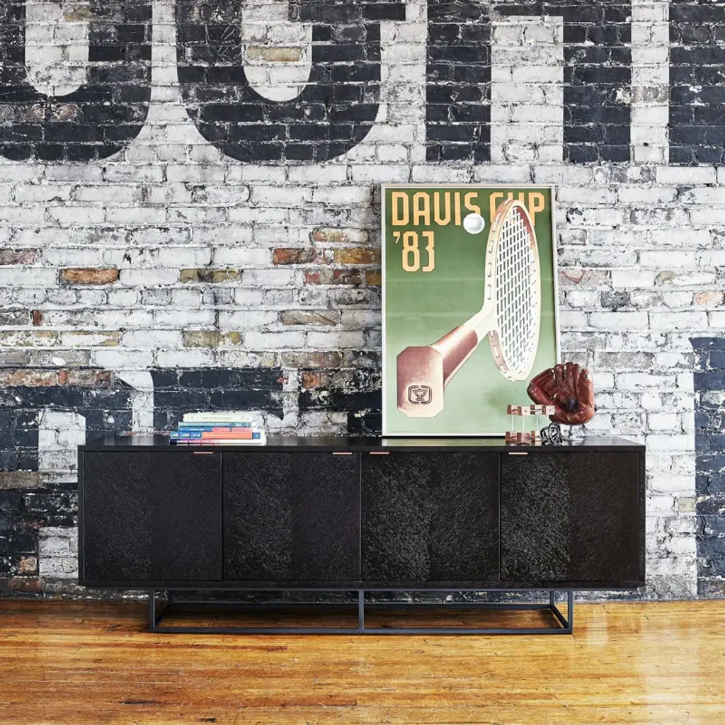 The Myles Credenza combines subtle details and craftsmanship to create a storage design that exudes simple sophistication. Rose gold handles contrast dark stained, chevron-patterned oak faces. A recessed, slender steel base with a black, powder-coated finish creates an illusion of weightlessness. Adjustable shelves provide plenty of efficient storage space. Part of the Myles Storage Series, this credenza matches perfectly with the Myles Media Stand and End Table.