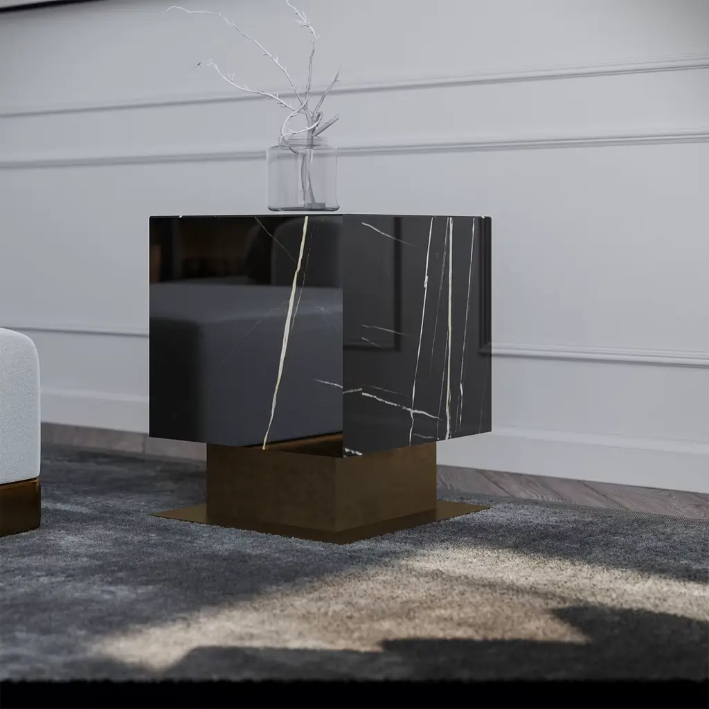 The cubical side table is defined by its sculptural shape. The table is constructed with a metal base and a central metal structure that supports the marble top. The top is made entirely of Sahara Noir marble. The metal structure is in polished gun metal grey. The table is available in different marble and metal finishes and it is customizable. Please, contact the Concierge for more information. Due to the nature of the material, the product may slightly vary.