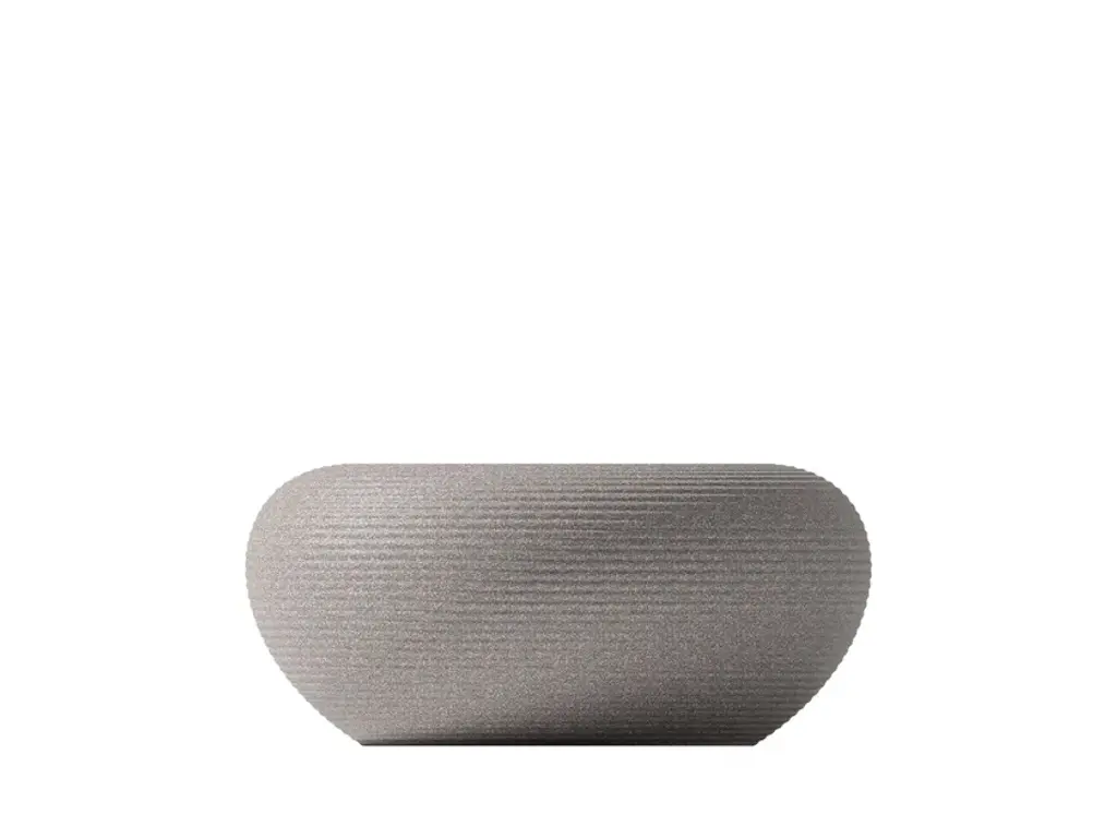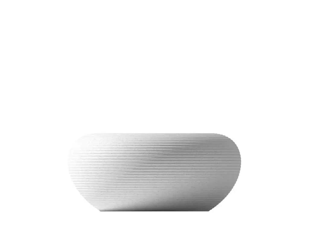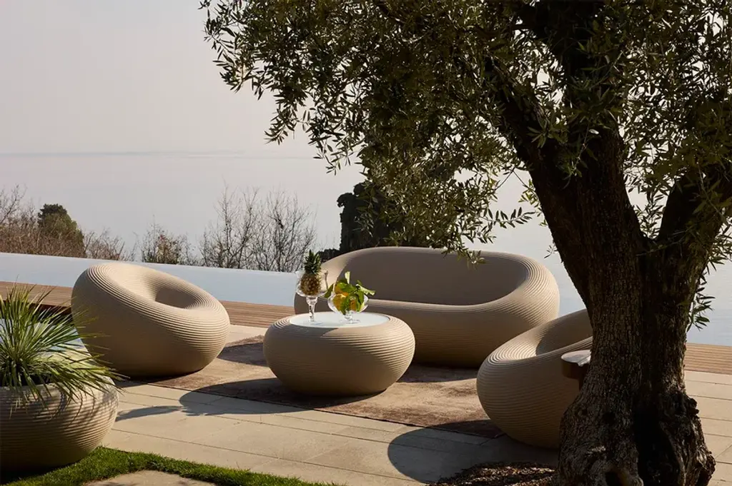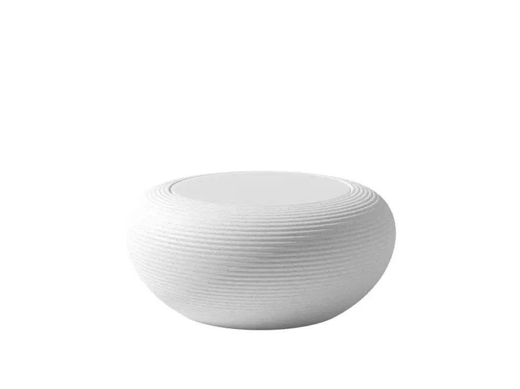 The Nami table has a round body in recyclable polyethylene and a painted glass top. Available in six colours, three of these have a uniform colour, the other three are obtained from recycling and mixing materials with 2/3 different color tones.Immerse yourself in the welcoming nest: the Nami collection. Its texture consists of concentric waves pattern that converge towards the center. The collection is characterized by an extremely simple design based on generous roundness. Its colors evoke the natural scenarios which it can be placed in and have the tones of sand, rope and rock. The Nami family designed by Stefano Giovannoni includes: the low table, the planter, the armchair and the sofa.
