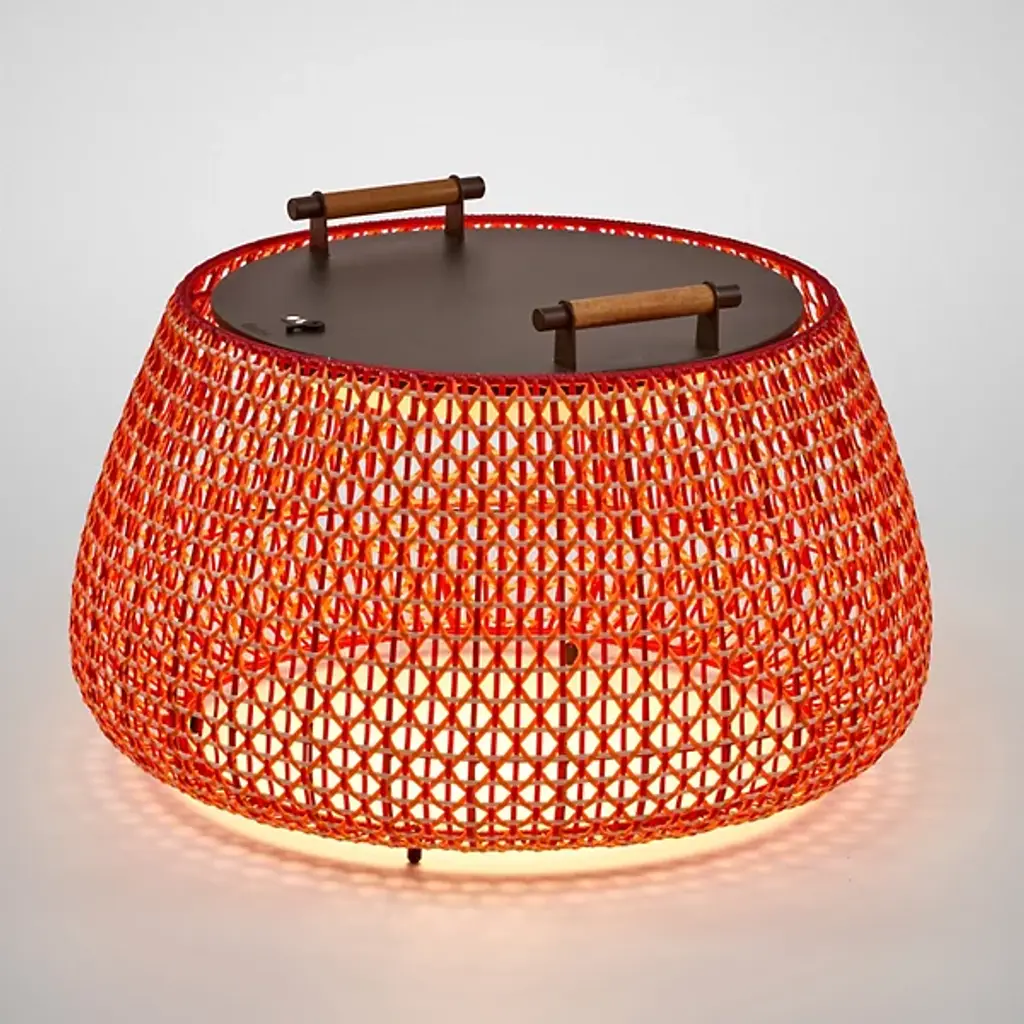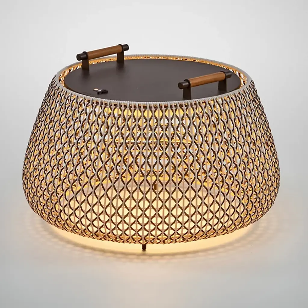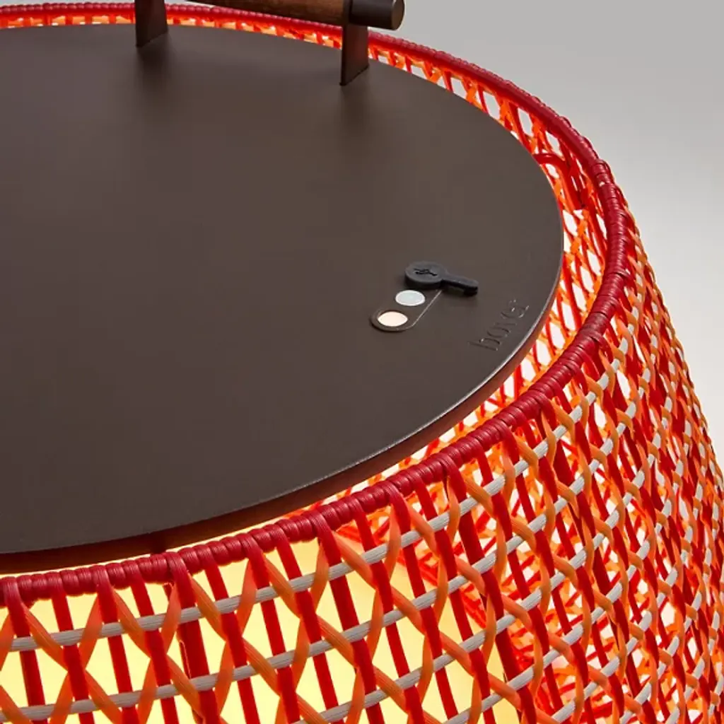 Introducing the Nans Bag 38/R Outdoor LED Table With Battery by Bover, an icon of modern innovation and creativity. Skillfully constructed from durable stainless steel, aluminum, and teak wood, this side table boasts a uniquely irregular shade shape, wrapped in non-toxic, recyclable synthetic polyethylene fiber. The fixture brings a multi-functional dimension to this transitional style table. Ideal for lighting your patio or backyard gatherings, the table features a push-button switch for convenient operation. Melding outdoor lighting with the functionality of contemporary floor lamps, this dimmable floor lamp provides warm, adjustable lighting at your fingertips.