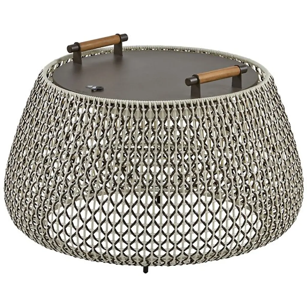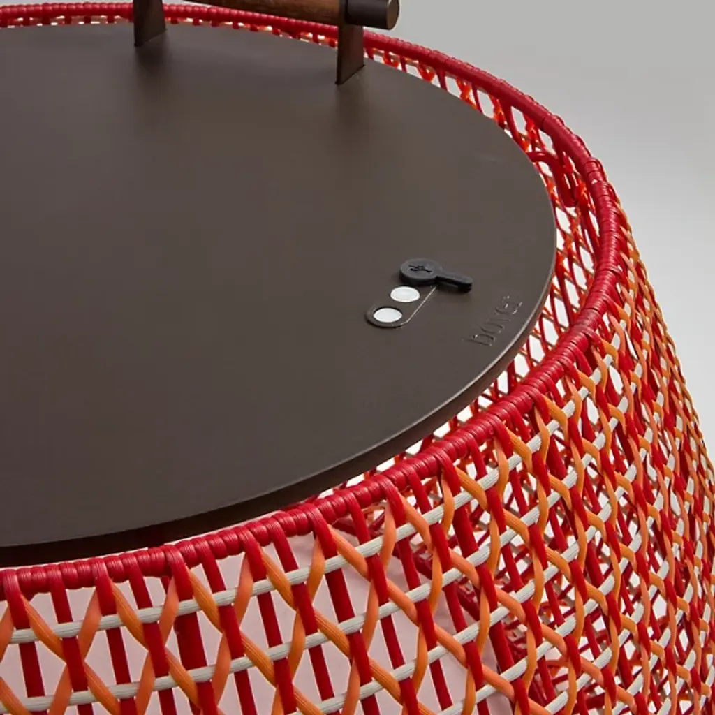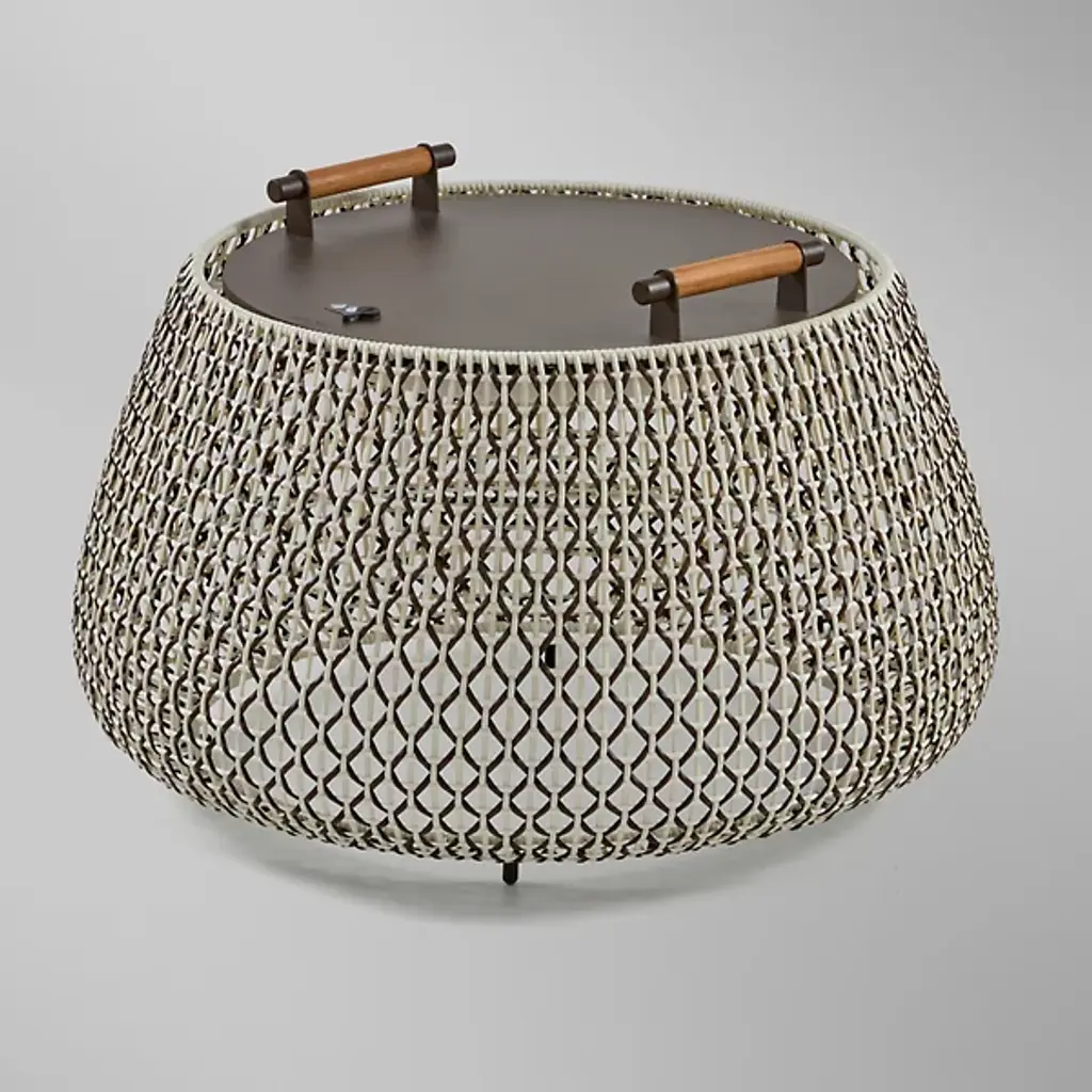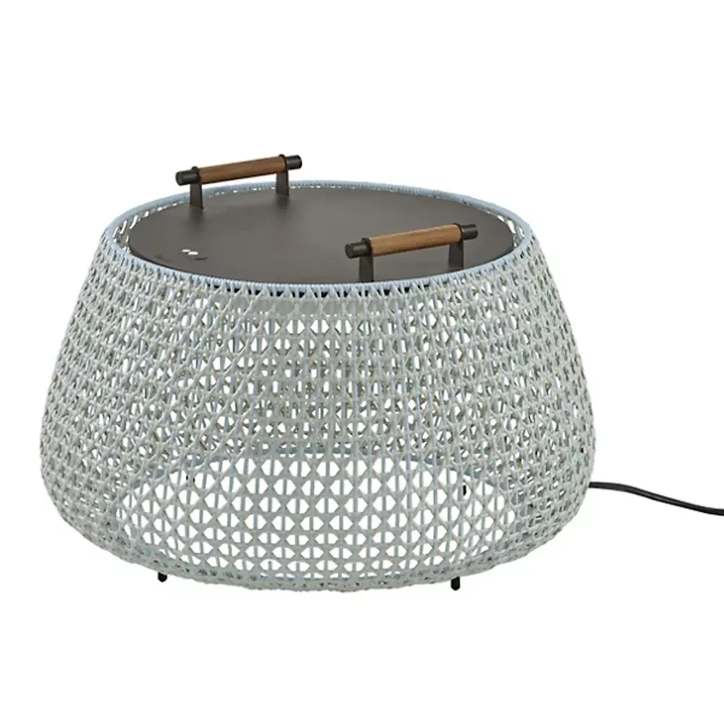 Introducing the Nans Bag 38/R Outdoor LED Table With Battery by Bover, an icon of modern innovation and creativity. Skillfully constructed from durable stainless steel, aluminum, and teak wood, this side table boasts a uniquely irregular shade shape, wrapped in non-toxic, recyclable synthetic polyethylene fiber. The fixture brings a multi-functional dimension to this transitional style table. Ideal for lighting your patio or backyard gatherings, the table features a push-button switch for convenient operation. Melding outdoor lighting with the functionality of contemporary floor lamps, this dimmable floor lamp provides warm, adjustable lighting at your fingertips.