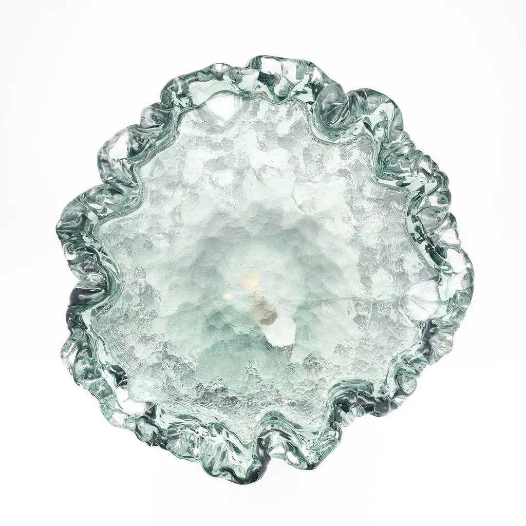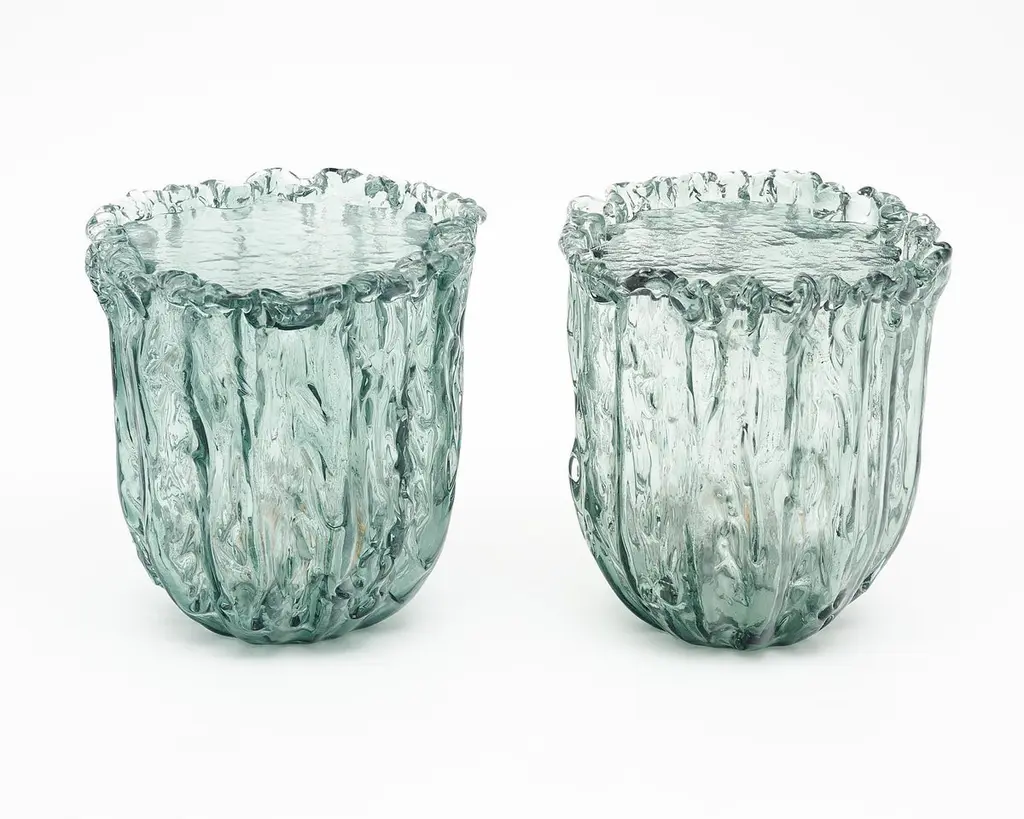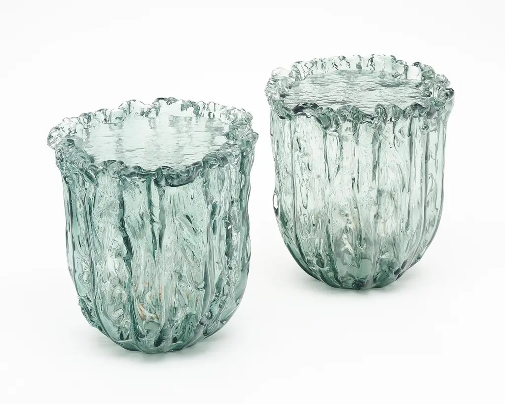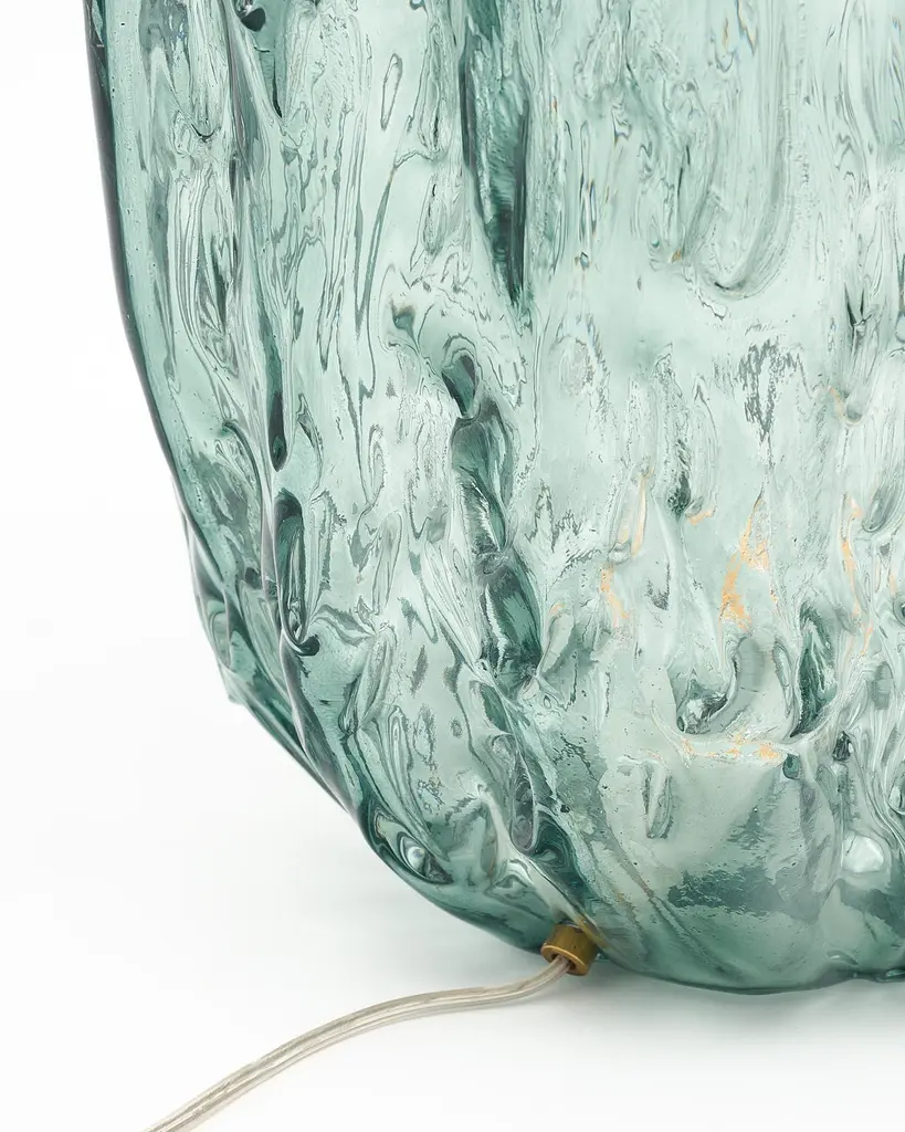 Pair of Naoto Fukasawa glass side tables created in Murano, Italy. The tables are hand-blown with an organic shape. A separate glass cover fits perfectly into the top. They are electrified within to create a beautiful glow as the light passes through the blue glass. They have been newly wired to fit US standards.This pair is a special order from Italy. Please contact us for a lead time.